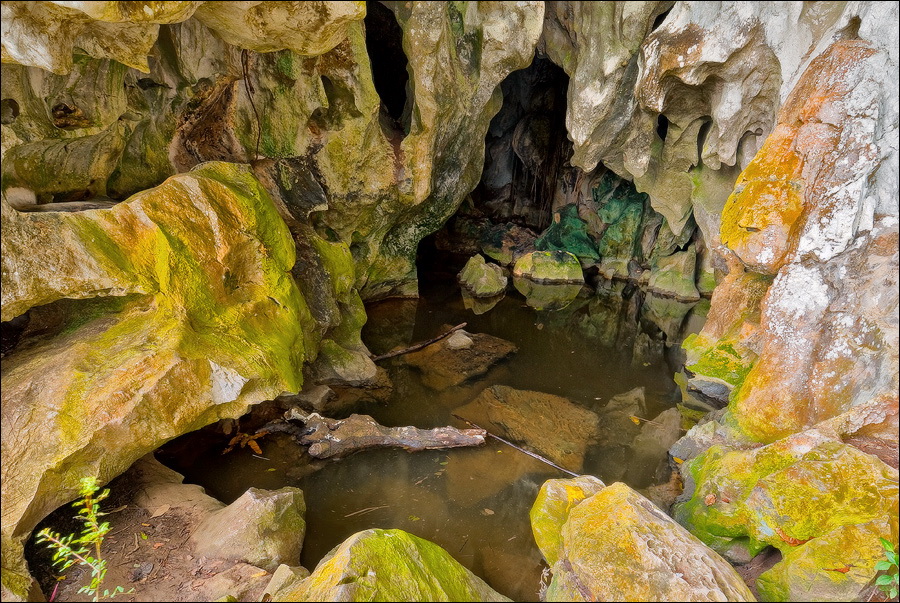 Отпааааад. Это - не есть выход! Это... это... Кто-то из верховных индуистских божеств, а может и сам Сиддхартха Гаутама - Будда раздобыл где-то по случаю офигительный перфоратор с пневматической ударной функцией. И вот, как-то рано поутру, испытывая свой новый "гаджет"... Одна из куполообразных гор, в самое чрево которой мы только что забрались, оказалась... трубой!!! Абсолютно, идеально, пугающе аккуратной трубой в синее небо! Голые скалы стен, перерастающие в натёки, снова в скалы и снова в натёки... Красота и мощь ну просто неописуемая. Высота "трубы" - метров двадцать, а может и все тридцать, кто её снизу угадает. Задираешь голову - шея болит. Стены - вертикаль, ватерпаса не приноси. Но самое интересное - плоское дно "трубы". Половина - дикие джунгли, каменные хаосы, мхи, вертикальные трещины, глубокие каверны, озерца, капающая с потолка вода, комары и летучие мыши. Вторая половина - аккуратные песчаные дорожки, клумбы-газончики, статуи Будды в блестящих шёлковых саронгах, молельные коврики ручной работы, арома-палочки сотнями в особых глиняных горшочках. Это не просто Райские Кущи. Это демо-версия Рая на Земле! Такие вот места - переворачивающие восприятие Природы как тупой стихийной силы - почти ответ на вопрос, где заканчивается просто Природа, и начинается Творец...