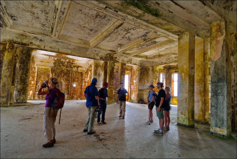 Гад, то есть гид, всё время погоняет. Не даёт спокойно погрузиться в другую эпоху. Я понимаю, что остальному народу сегодня по тому же самому "крейзи трейлу" вниз. Так кто этому суетливому народу виноват? Я здесь, например, на полные сутки. Оставьте меня, пажалиста, в покое... Нет, хором грузимся в кузов и шатко-валко катим на обед... в казино! Ах, какое казино!!! Настолько колоритного (во всех мыслимых и немыслимых смыслах…) здания в жизни ещё не видывал. Плюю на обед - нужен мне их постный рис с овощами - бегу трудиться “щелкунчиком”. Да понимаю я, что до вечера здесь всё моё. Всё равно не могу удержаться! Понёсся на четвёртый этаж, “повтыкал” в пространство. Скатился в самый глубокий подвал, пошарил с фонариком по обломкам кресел, кухонным разделочным столам, бытовому мусору. Интересно, аж жуть. Но пускаться во все тяжкие в “подземельях” не решился: ядовитых рептилий в Камбодже хватает. Рис с овощами жевать за компанию всё равно пришлось: все вокруг жуют, и мне вроде как положено...