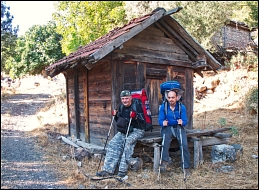 На запущенном пустыре паслось несколько коз. Я был где-то рад, что мы счастливо избежали цивилизации: крупные собаки здесь встречались почти в каждом дворе, нам хватало их басовитого брёха издали. Часть домов выглядела давно заброшенной. Мы с Лёшиком спецом сфотались у самого живописного: неоднократно встречал его на чужих карточках. Будь у нас чуть больше времени, здесь нашёлся бы не один десяток сочных кадров, но проект достичь до вечера очередной "Яйлы" - на сей раз она располагалась спереди -Куздере, всё ещё пребывал за гранью фантастики. Единственный маркированный столб привёл нас к наглухо захлопнутым железным воротам, хозяином которых оказался самый настоящий турок, потому, что нехотя махнул рукой в сторону свалки и, не дослушав вопроса, отвернулся. Ну, свалка так свалка... Главное - не съехать по наклонной в затянутую ряской водосборную канаву, которая даже мне с головой. Прошлёпав метров пятьдесят в гору, я обнаружил расхождение с путевыми наставлениями Бабушки Кейт и мы вынужденно сползли на исходную, чтобы заменить восхождение длинным траверсом.