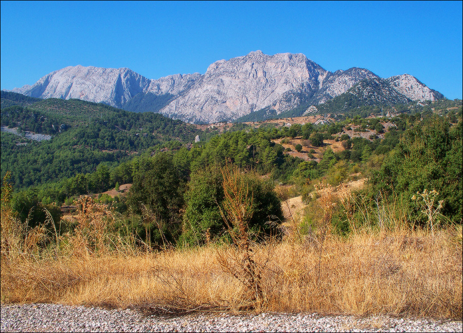 Двунаправленный жёлто-зелёный указатель “Likiya Yolu” казался родным братом, но всё ещё обещал 8 километров до Гедельме. Пообнимавшись с ним по очереди, мы окунулись в восторги по пейзажу: впереди, в конце концов, замаячил призрак коммунизма Тахтали. Справа к нему примыкал рослый скалистый хребет, две ассиметричных вершины которого были присыпаны странной чёрно-белой мозаикой искрошенного в гравий - именно так это выглядело издали - ракушечника. Между нами и "пятнистым" хребтом лежала просторная долина, а правее отрога, на котором мы стояли (кстати, стояли мы на прекрасно асфальтированной дороге!) - высился ещё один скальный массив, полностью заслонявший море. Да, гор в Турции - никому мало не покажется... Знаете, асфальт обладает ну просто мистической способностью промывать мозги городским жителям. Вместо того, чтобы посоветоваться с картой, Бла-ародные Доны радостно потрусили к виднеющемуся впереди и внизу Гедельме, чтобы только минут через пятнадцать осознать, что желанный источник уж давно как остался где-то за спиной, в овраге. Азимут, по которому мы “корректировали” к роднику, был замешан на шиповнике, траве выше колен и неустойчивых камнях, числу которых в траве была тьма. Я начинал тихо ненавидеть эти вездесущие средиземноморские "пампасы". - Всё, что было способно вырасти колючим, здесь вырастало именно колючим. И, кроме того, свято уверенным, что главная цель жизни - воспрепятствовать перемещению кого бы то ни было в любом и каждом из доступных направлений.