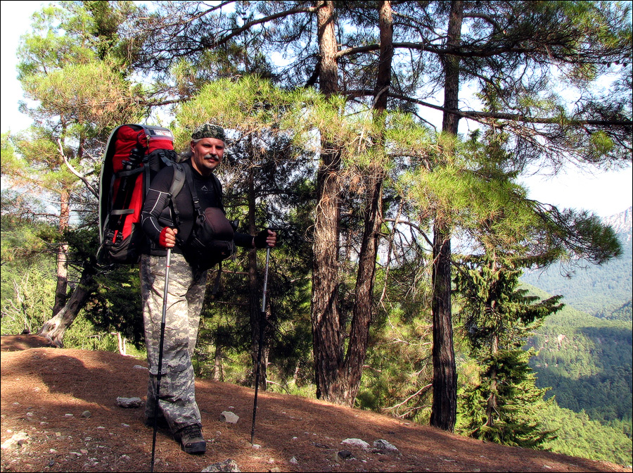 В обсуждении причин личной неприязни - злостная потрава огородов, национальная программа регулирования поголовья или соответствующие наставления Магомета - нас вынесло на очередное взгорье и, наконец, одарило широким простором. Заветная седловина Тахтали теперь стала по-настоящему близкой. Стоп, стоп. Не настолько близкой, чтобы кто-то пообещал, что на неё завтра с утреня не предстоит подниматься! Северную половину горизонта заслонял массив Теке-Даг с лидирующей над местностью вершиной Кандиклик, южную - поросшее кустарником и невысокими деревьями плоскогорье. GPS с преогромным удовольствием сообщал высоту Ай-Петринской яйлы: 1024 метра. Силушки моментально прибавилось. Стараясь не вляпаться в очередные происки ржавой колючки, мы несколько раз перепрыгнули с одной грунтовки на другую, пересекли широченную пустошь с захватывающим видом на массив Kandiklik, и затеяли продирашки вверх по зарослям сосен, едва-едва способных соперничать с нами в росте. Специально что ли, турки младую поросль на максимально приближённых к Ликийскому пути грунтовках культивируют?!! Стеная камнями, сдался очередной холм, и мы, наконец, снова увидели Гедельме и классическим зигзагом молнии опадающую к нему новенькую асфальтовую магистраль из горного "аула" с игривым погонялом Ovaçik.