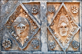 Определив рюкзаки в одну шеренгу с путеводителями и наборами открыток - вместо прилавка вдоль стены кафе тянулась широченная каменная скамья - мы отправились "покорять" Миру, притаившуюся где-то у самого подножья нашей последней турецкой горы с лёгким итальянским привкусом - Pirnalli-Taş. А ведь славно подгадали: как раз к разъезду подавляющего большинства туристических автобусов. Теперь не было необходимости выстаивать живую очередь в кассу, тормозить на турникетах, - раз, два, и мы... И мы… Это что, опять déjà-vu? - точно такие же капители колонн я не далее чем вчера вечером без всяких финансовых вливаний, измышленных ограничений и табличек "руки прочь" ощупывал!!! Вторым ударом по дых оказался свеженький запрет на посещение вырубленных в скальной стене гробниц. Ещё не так давно свободно пропускали, а теперь "в целях обеспечения безопасности посетителей, бла-бла-бла..." Причём ограждения настолько далеко поставлены, что хрен там божественную резьбу по камню без морского бинокля рассмотришь. Печенкой чую, Санта-Клаус, ну, в смысле, Николай Угодник-Чудотворец такого решения городских властей ввек бы не одобрил! Действительно, какое дело популярному православному Святому до каких-то там языческих доисторических усыпальниц?