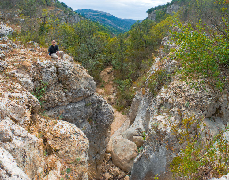 Как будто прочувствовав охвативший путников душевный подъём, начала стремительно исправляться погода. Казавшийся с Сюндюрлю-Каясы монотонно толстым, облачный покров вдруг затрещал по всем швам одновременно. По небу разбежались синие кляксы, сделалось значительно теплее. На душе сладко пели малиновки, и Бобус решил не опускать взгляда, а напротив, широко улыбнулся в лобовое стекло ковыляющей встречным курсом "Нивы". Краснолицый дядька за рулём на улыбку не ответил, но и ноги с педали газа не убрал. Это тоже было замечательно. Когда дорога выбралась из леса на луговины, было предпринято две оптимистичных попытки сократить путь. Обе финишировали в непроходимых зарослях с “контрольными" обрывами на закуску. В результате атака Узунджийского каньона получилась классической, то есть от пересечения дороги на Ай-Димитрий с сухоречьем. Извините, сухорУчьём. Русло почему-то было значительно шире, светлее и каменистей того, что отложилось в памяти. Скорее всего, в этом повинно оживляющее влияние погоды и уже начавшие золотиться листья. Когда тропа, обогнув широкую эворзионную ванну, через стройные берёзки выпрыгнула на открытое пространство, главной задачей Бобуса стало хранить патетически каменное лицо и отвечать на шторм вопросов исключительно положительно: