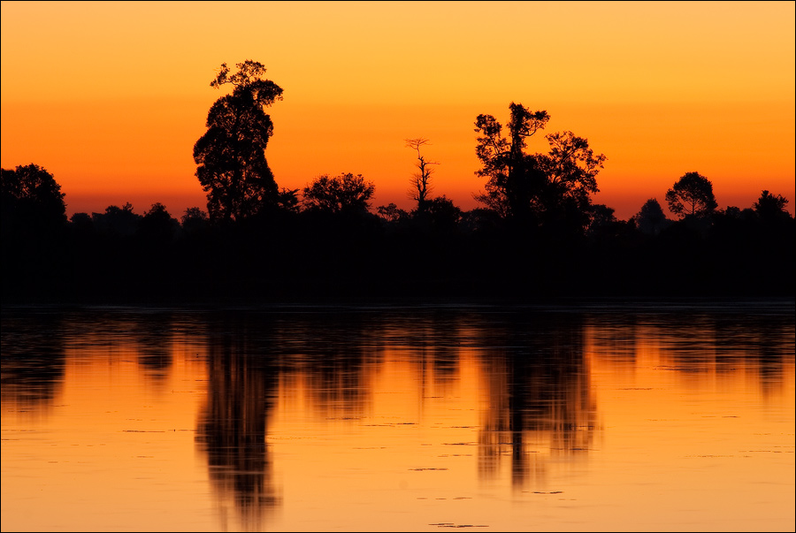 Кати меня, извозчик, бортовой номер 2313, по ночному асфальту на север, через жёлто-полосатых "лежачих полицейских" шириной в полтора метра и полуосвещённый Контрольно-Пропускной Пункт Ангкора. Шутка "ой, чего вы щиплетесь" в момент второй по счёту “дефлорации” пропуска работает на ура. Вообще весёлый, контактный, внутренне добрый какой-то в Камбодже народ, прямо всей нацией улыбается. Мне здесь больше нравится, чем в той же Албании или Замбии. Всё более спокойно, размеренно, естественно, без шума и лишней суеты, этакая приправленная восточными специями “хакуна матата”. Едва отличающийся от ночи абрис Ангкор Вата на этот раз остаётся слева, загадочное мерцание водной глади, стискивающей его в тесные квадратные скобки, то и дело прерывается вертикальными полосами тьмы - стволами окружающих ров деревьев. Мы едем по “Большому Кругу” - Grand Circle - этой самой дорогой вчера возвращались в Сием Рип после Истерн Мебона. Но ночью всё ощущается по-другому. Особенно расстояния: кажется, еще немного, и мы обнаружим себя на границе с Вьетнамом. Шутка. Я просто боюсь опоздать на рассвет.