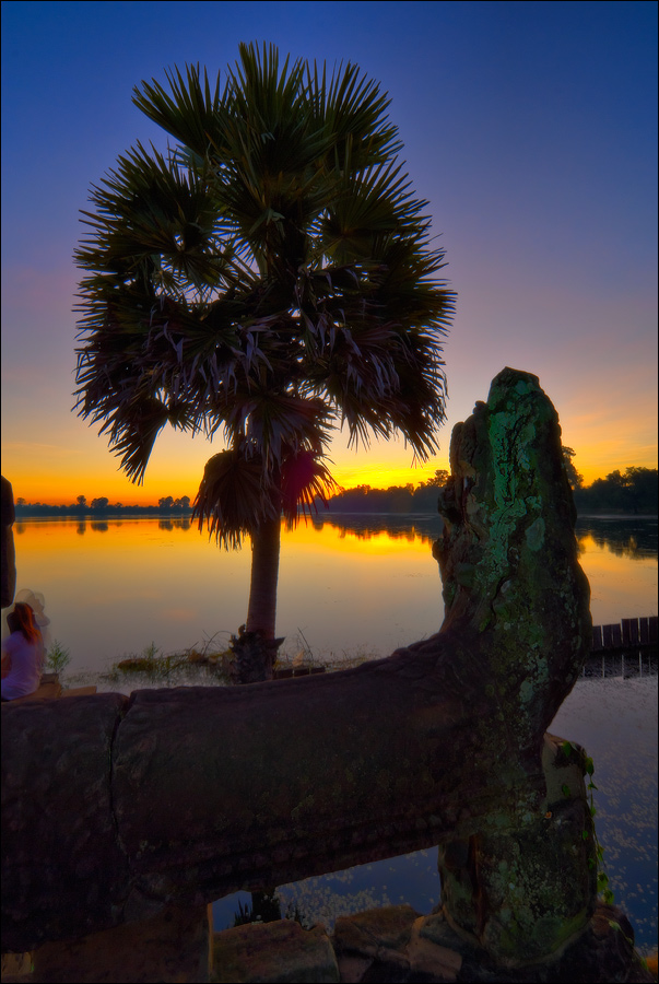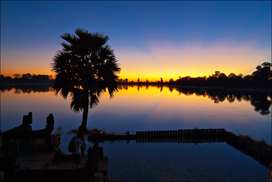Предвосхищение рассвета, когда перед тобой почти до самого горизонта расстилается водная гладь (Камбоджа плоская, как полированная стеклянная столешница, до горизонта вытянутой рукой дотянуться можно…), всегда дарит надежду на что-то исключительное. Я так славно расставился: семья каменных львов слева; прямая, как стрела, линия берега прямо к Светилу, которое вот-вот нос высунет, тянется; растрёпанная пальма справа, не дающая взгляду зрителя “вытечь” за пределы кадра; парочка влюблённых в белых рубашках в золотое сечение вписалась. Увлёкся, стою буквой зю, будущий "шедевр" на предмет изъянов в видоискатель изучаю. Нет изъянов! И тут запихивается прямо в видоискатель, извините, жопа. Тощая японская жопа, в джинсах-переростках, увешанная камерами, штативами, вспышками... и начинает свою кривозубую низкорослую “гёрлфренду” на фоне моего персонально выстраданного заката по-всякому раскорячивать! И это длится… вечно. Почему всё-таки я так не люблю японцев?!!