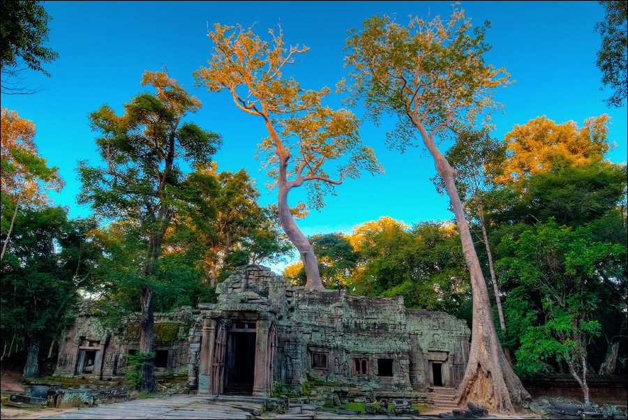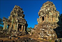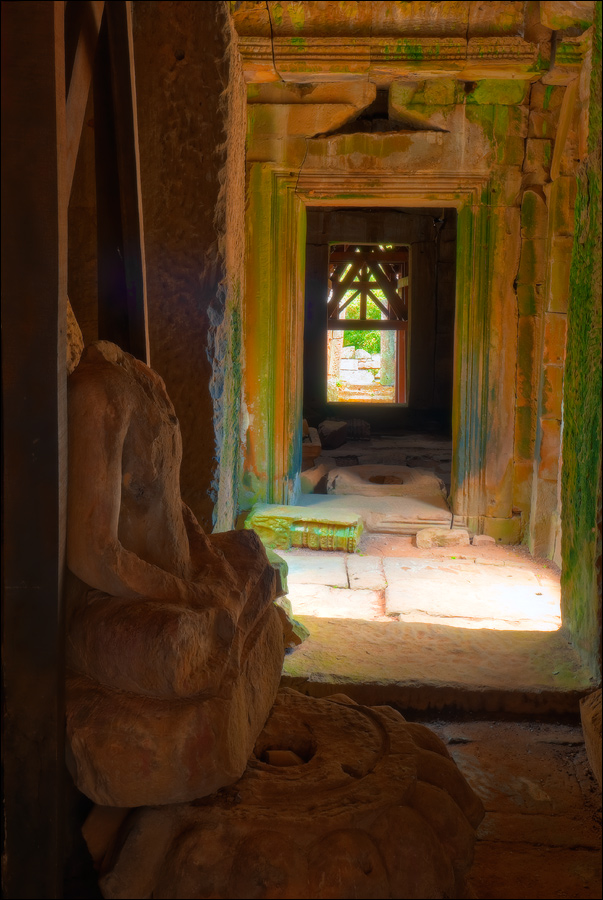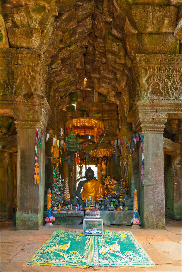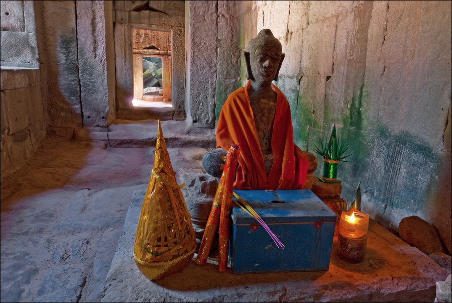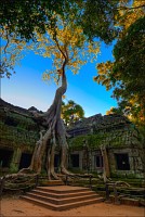Самого солнца я дожидаться не стал. Пусть братья-баранги здесь всякой фигнёй балуются, а мы прорвёмся через заслон малолетних “уан долл”, сместивших точку приложения сил к попыткам напоить горячим кофе, загрузить самиздатовскими путеводителями и увешать оригами местной работы, быстренько - тук-тук-тук - покатим “погружаться” в Та Прохм. Место по определению гипер-барангное, но… только не в полшестого утра. Признаться, я отнюдь не против посетителей в храмах. Это позволяет не превращаться в рядового “щелкунчика” (как делают те, кто постоянно за экскурсоводом движется...) а примериться, спокойно расставить штатив, прищёлкнуть фотик, присесть на камушек или удобный корень, чтобы пару-другую-пятую минут, пока галдящая толпа рассосётся, по полной программе впитывать детали мира и нюансы цвета. Хвала всемогущей Теории Хаоса, приём этот срабатывает всегда. Наступает миг, когда даже в самом затоптанном месте не остаётся ни единого Хомо Сапиенса. В этом - истинный кайф иметь по-настоящему много времени, а не два-три дня, как это получается у сломя голову набегающих из Тая фарангов.