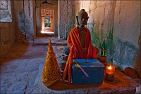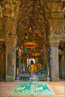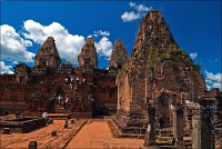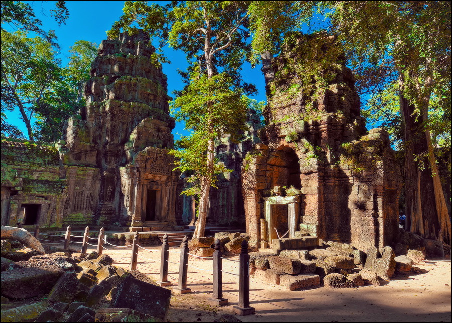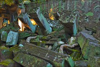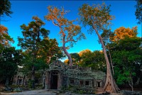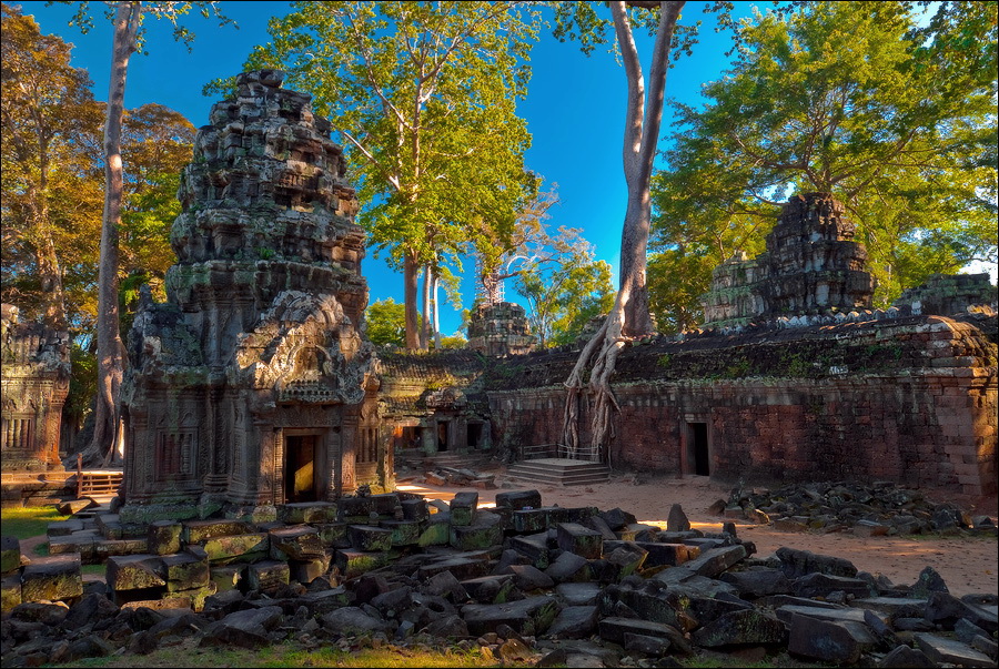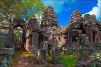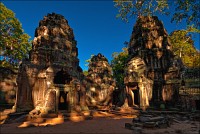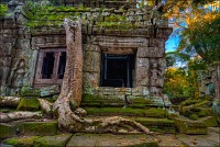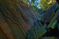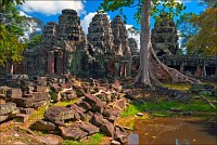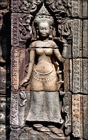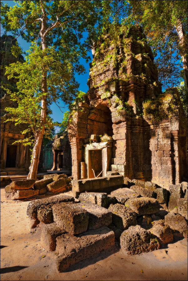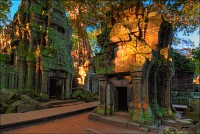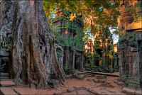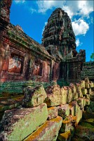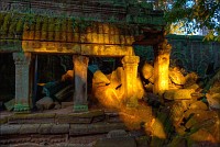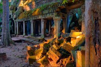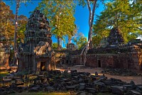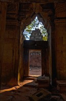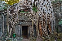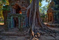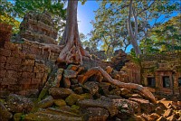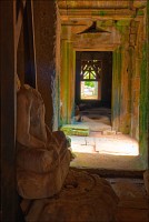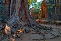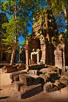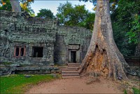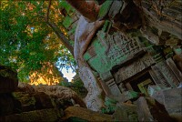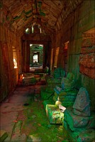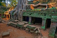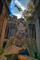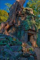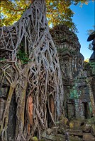 Дальше - больше. Прямо как у Высоцкого: "что потом началось - не опишешь в словах..." Мега-деревья на башнях и продавленных до самого основания галереях пошли ну просто косяками, одни других внушительней. Сводчатые туннели переходов стали выше, а руины - темнее и загадочнее. Тут уж мой указующий перст от систематического топления кнопочки на камере стало даже Семерым Риши не удержать. Да что там фотографии... Ta Prohm, как и Prasat Bayon, нужно только видеть своими глазами и трогать своими руками. Это вообще в духе Джаявармана Седьмого: если уж брался что-нибудь строить, то такое, чтобы у барангов с высшим техническим образованием даже через девять веков челюсти до самой земли отваливались. По правде говоря, Та Прохм на самом деле никакой не “та прохм”. “Честное” его имя - Ражавихара (Rajavihara). Во всяком случае, так его в родных XII-XIII веках величали. А может, в этом ребрендинге и есть резон: пока храм был в “мятной кондиции” (“in mint condition”, т.е. “как новый”) он заслуженно звался “Королевским Храмом”. Когда стал полуподземной развалюшкой посередь джунглей, превратился в “Предка Брахмы”, в вольном переводе на русский - “Старые Мощи”. Железная логика?
