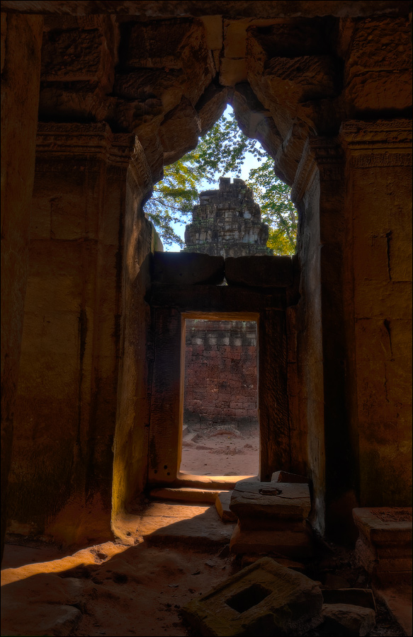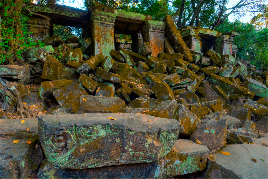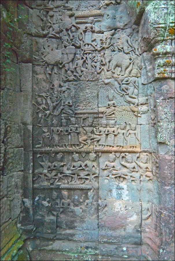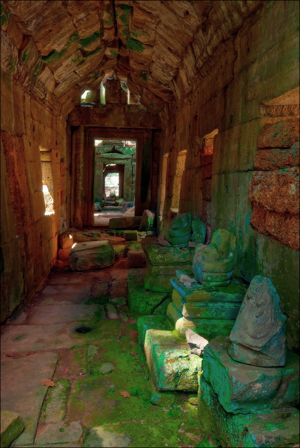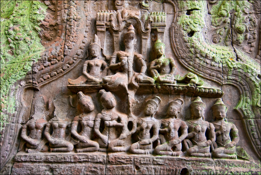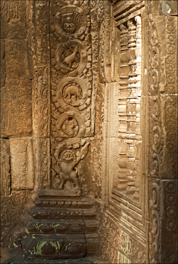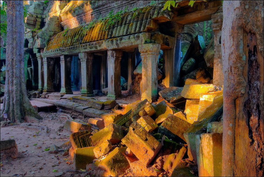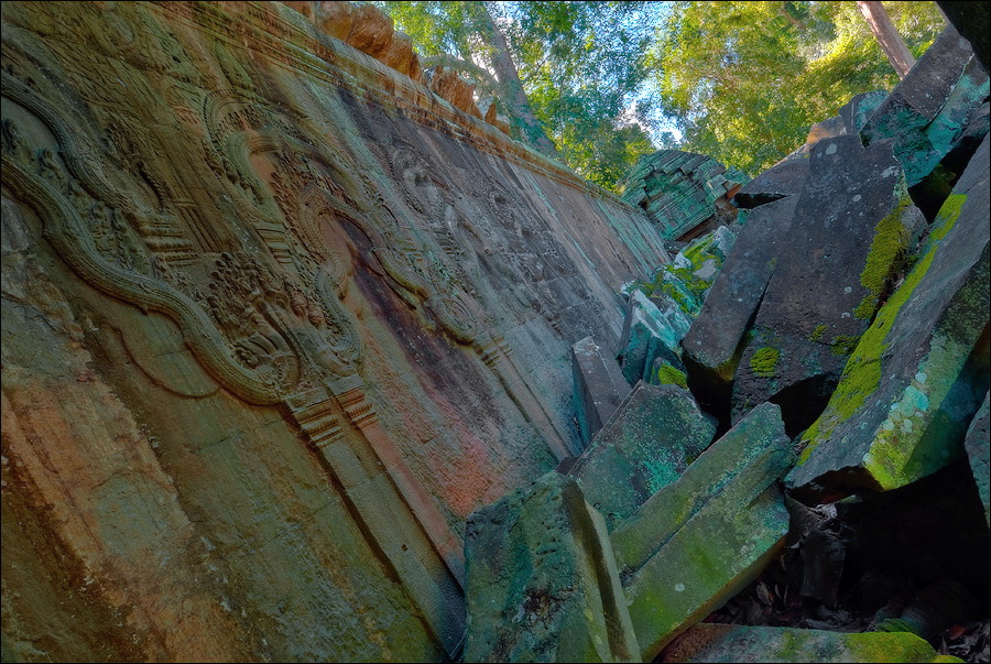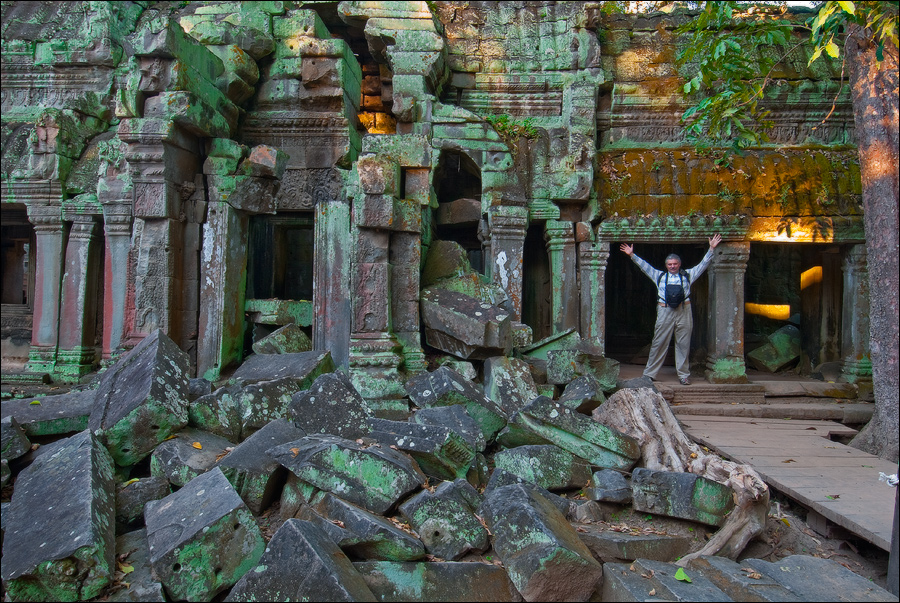 ”Десантировали” меня у какой-то стремноватой дыры в невысоком - от силы метра два - заборе. Никакой охраны не было. Табличек и указателей - тем более. Не слишком широкая песчаная дорожка стрелой убегала в густые джунгли. Слева распростёрлось болото. И справа распростёрлось болото. Я ещё удивился, что болото и мошки - есть, а “земноводных хранительниц кошелька” - ни одной. Завтра, примерно к обеду, я уже буду твёрдо знать, почему их нигде нет (довольно облизывается). По мере продуманно-медленного приближения "величественный Ta Prohm" казался мне всё более и более игрушечным. Что-то вросшее в землю, запредельно-ветхое, сильно порушенное самоё в себя и совсем никакое не зелёное, как в красивых проспектах подают, а цвета выгоревшей полыни, растущей посередь невзрачных обломков цвета битого шифера. Дверки низкие - по-английски такое называется "mind your head" - окошки все как одно подслеповатые и одновременно на четыре угла вопреки законам эвклидовой геометрии перекошенные. Что меня реально зацепило - резьба по камню. Она обещала многого. Очень многого. Честно избегая табличек "Danger!" - да я и сам прекрасно вижу, что тут у вас прямо ща всё, что ещё осталось вертикальным, обвалится - вычислил я достойные моих массогабаритов ступенечки и... И...