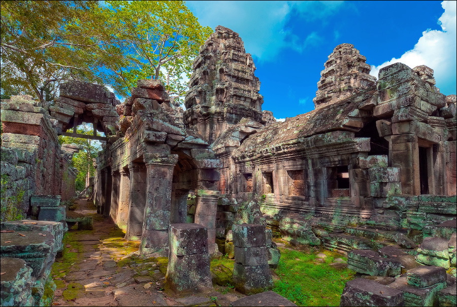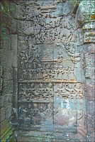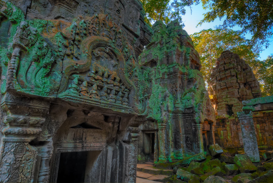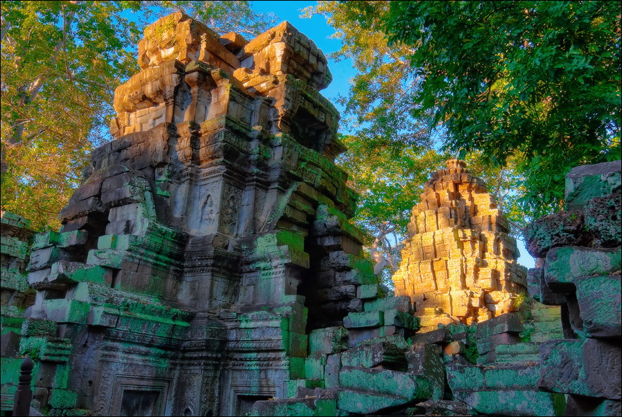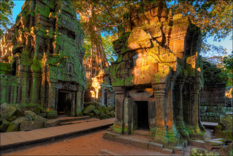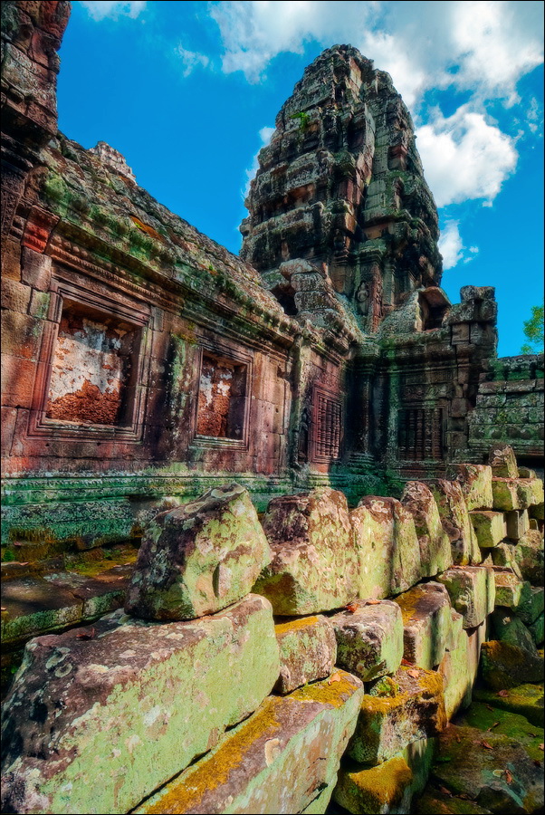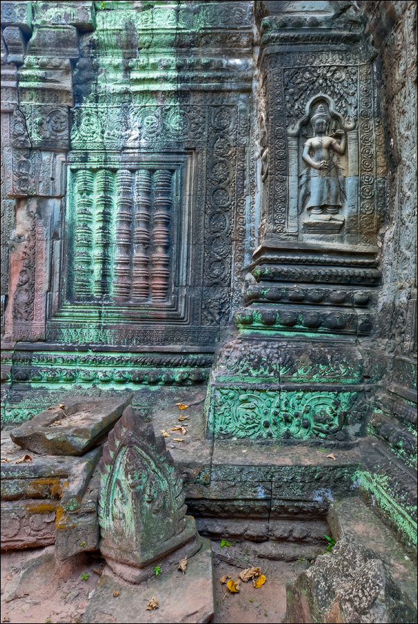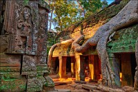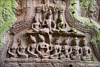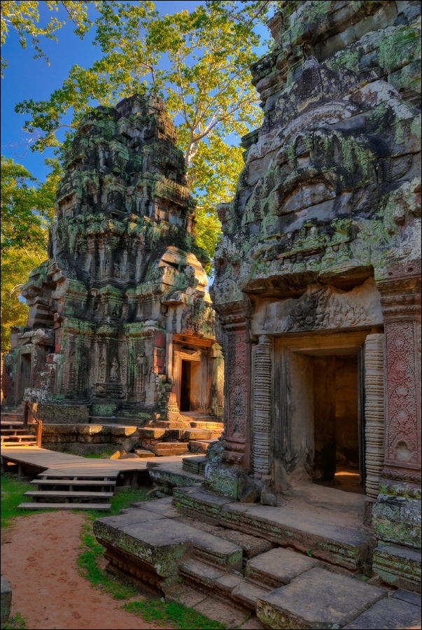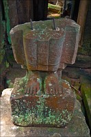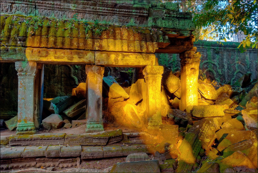 ”Десантировали” меня у какой-то стремноватой дыры в невысоком - от силы метра два - заборе. Никакой охраны не было. Табличек и указателей - тем более. Не слишком широкая песчаная дорожка стрелой убегала в густые джунгли. Слева распростёрлось болото. И справа распростёрлось болото. Я ещё удивился, что болото и мошки - есть, а “земноводных хранительниц кошелька” - ни одной. Завтра, примерно к обеду, я уже буду твёрдо знать, почему их нигде нет (довольно облизывается). По мере продуманно-медленного приближения "величественный Ta Prohm" казался мне всё более и более игрушечным. Что-то вросшее в землю, запредельно-ветхое, сильно порушенное самоё в себя и совсем никакое не зелёное, как в красивых проспектах подают, а цвета выгоревшей полыни, растущей посередь невзрачных обломков цвета битого шифера. Дверки низкие - по-английски такое называется "mind your head" - окошки все как одно подслеповатые и одновременно на четыре угла вопреки законам эвклидовой геометрии перекошенные. Что меня реально зацепило - резьба по камню. Она обещала многого. Очень многого. Честно избегая табличек "Danger!" - да я и сам прекрасно вижу, что тут у вас прямо ща всё, что ещё осталось вертикальным, обвалится - вычислил я достойные моих массогабаритов ступенечки и... И...