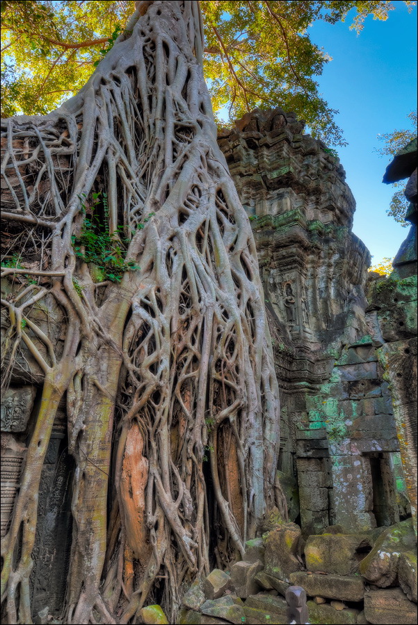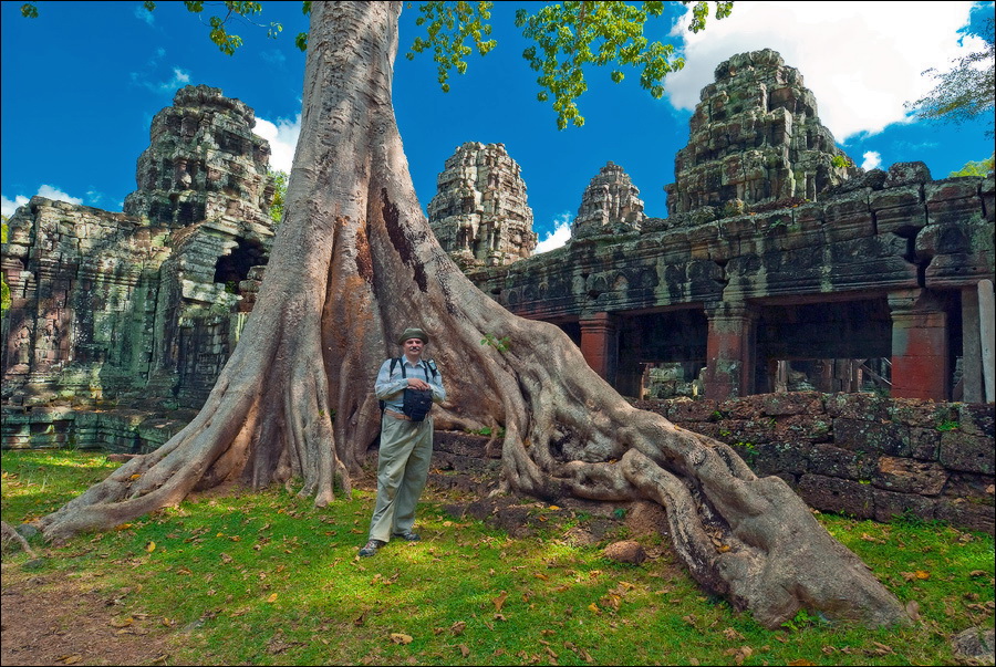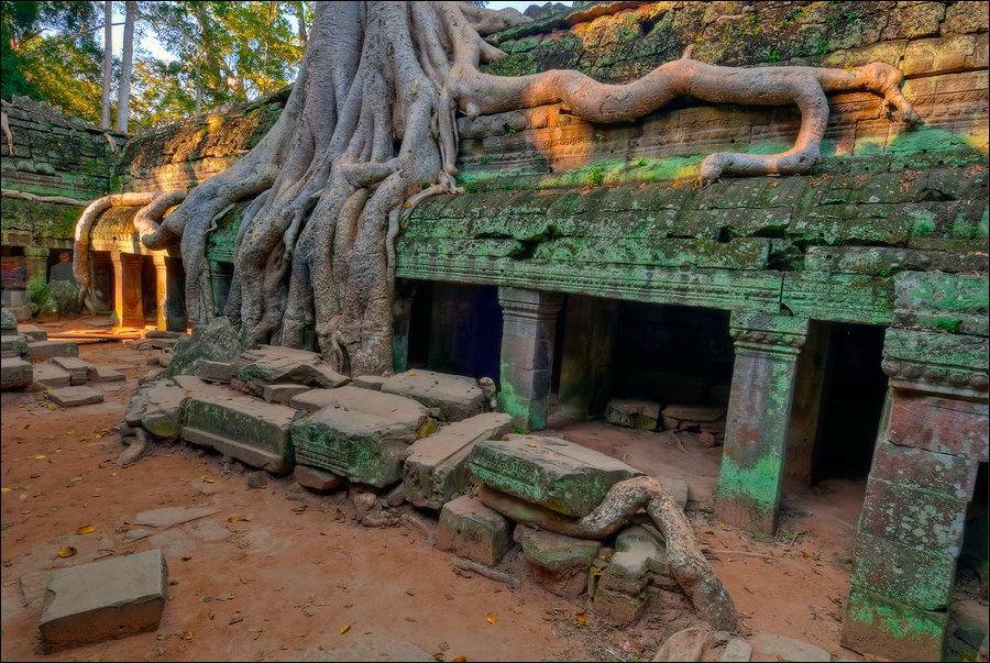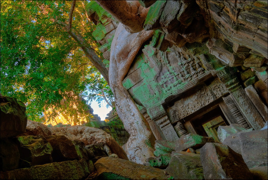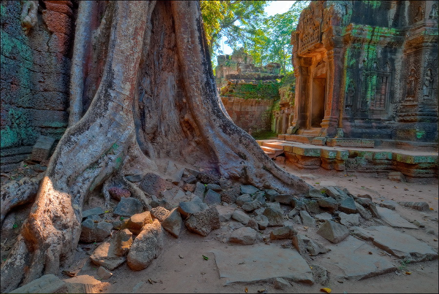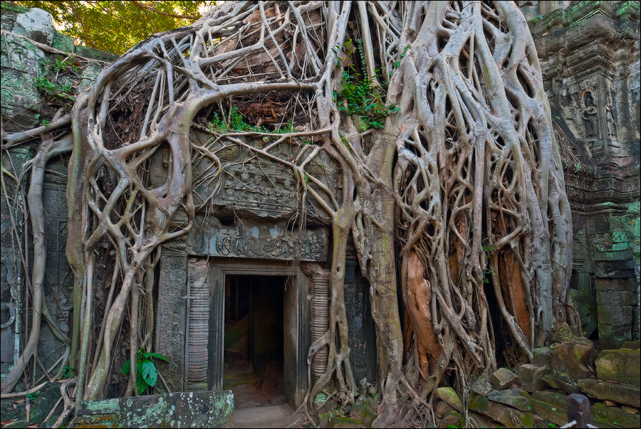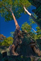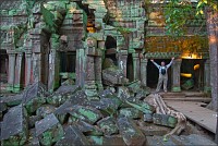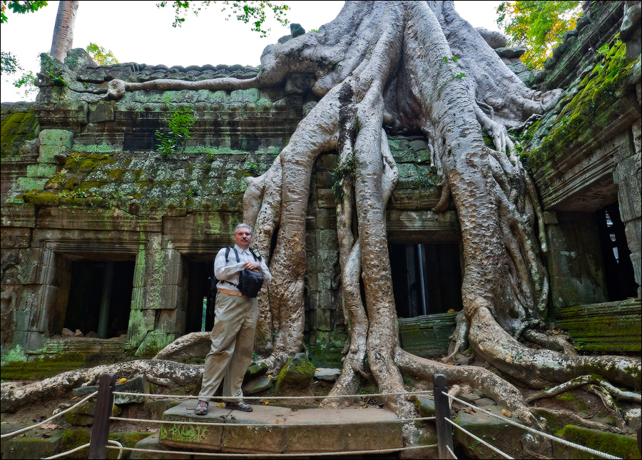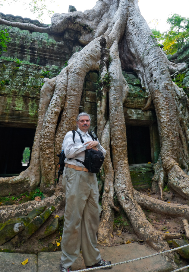 Как стоял, так сел на попу и сижу. Тащусь, что твой удав по бесконечному мешку героина. Потому что “растеньице”, по которому я снаружи слюной истёк, знаменитое Дерево Лары Крофт и есть. Ну, то самое, у которого Анджелина Джоли, вся из себя такая-растакая - есть суперское английское слово curvaceous - цветок лотоса подбирала, и в андеграунд киностудии “Парамаунт” под рукомашество и дрыгоножество проваливалась. Ничего это дерево не на земле растёт, как это снаружи виделось, а на крышу постройки нахальнейшим образом взгромоздилось, желтоватые и бугристые, как старая кость, корни по стене - живым водопадом, зелёная крона небо подпирает. И это именно из-за дерева многотонной каменной махине храма так хреново на фундаменте стоится-кренится. А самое главное - раннее утро, нет ни барангов, ни охраны. Можно смело залазить за верёвочные ограждения на столбиках, тискаться под надписи "Do not enter", до хруста в сухожилиях обнимать отдельные корешки, которые и объять-то в одиночку почти нереально, да и вообще совать нос, куда приличным молдаванам не положено. Тут уж я развернулся по-взрослому. Там та-акие чудные глыбовые завалы - просто праздник какой-то! А всё, что под и над ногами, руками, коленями, локтями, спиной, макушкой - изрезано мастерами по камню.