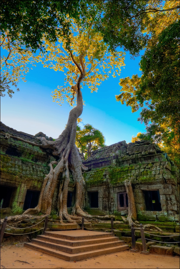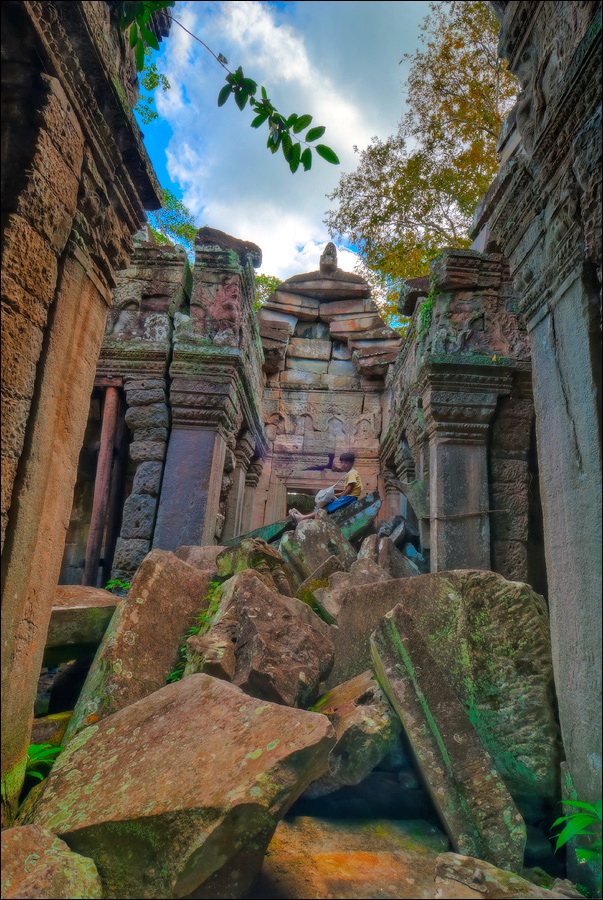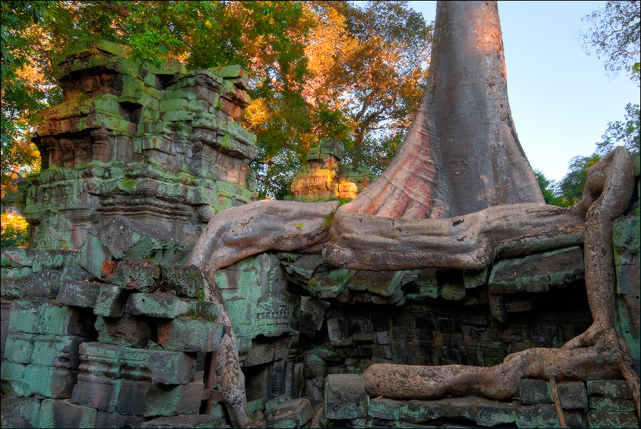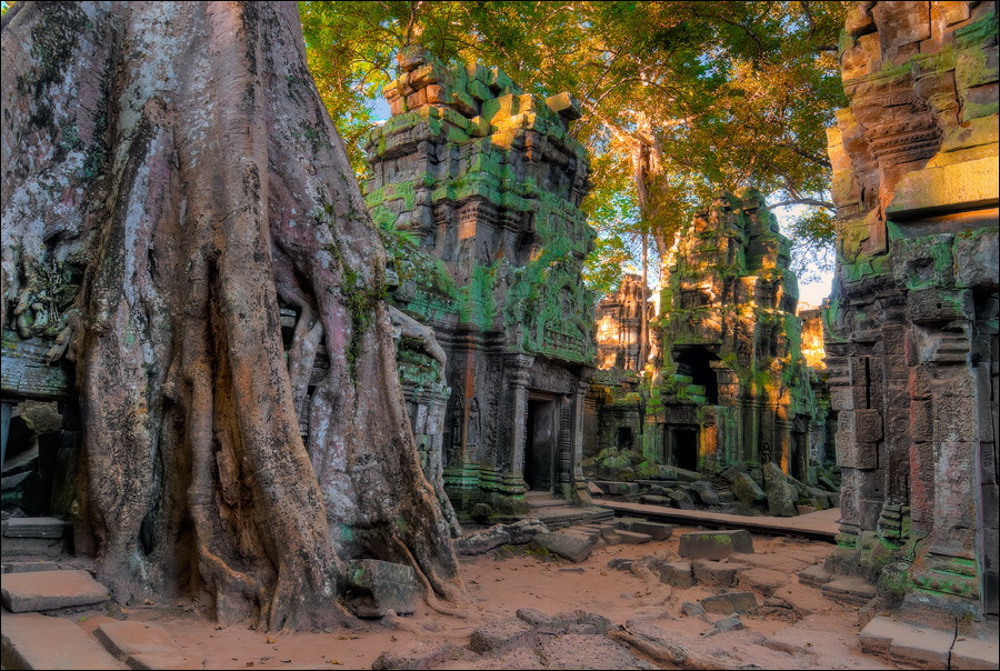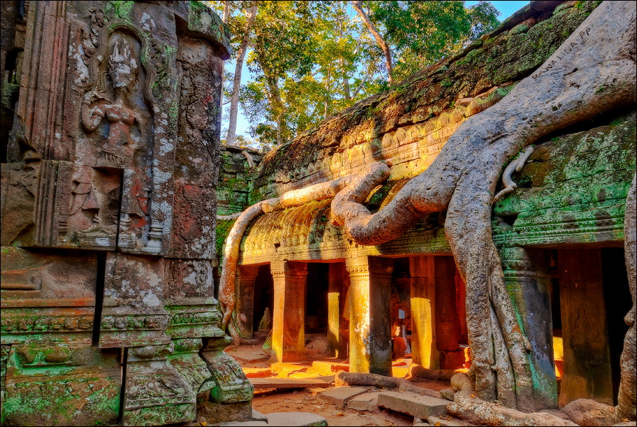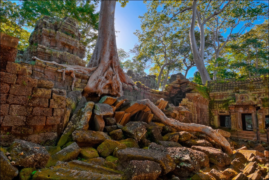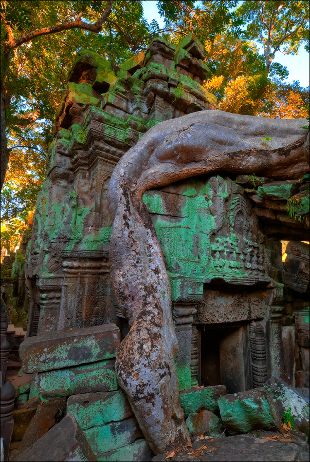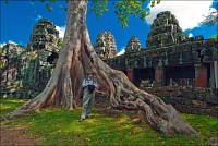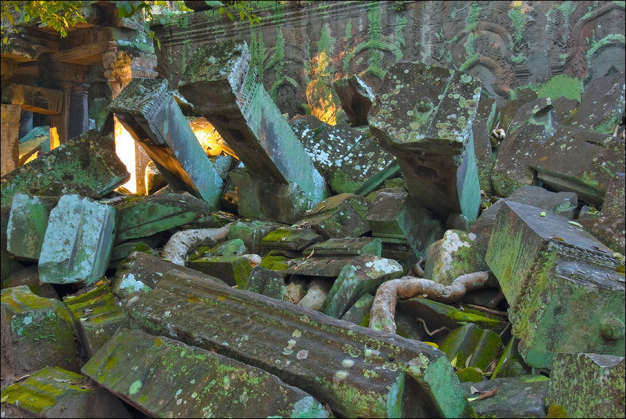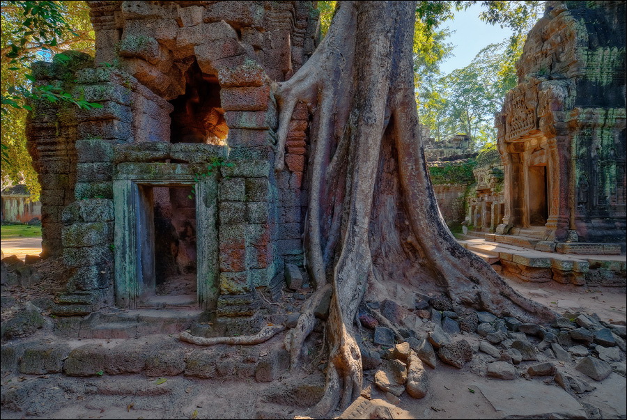 Как стоял, так сел на попу и сижу. Тащусь, что твой удав по бесконечному мешку героина. Потому что “растеньице”, по которому я снаружи слюной истёк, знаменитое Дерево Лары Крофт и есть. Ну, то самое, у которого Анджелина Джоли, вся из себя такая-растакая - есть суперское английское слово curvaceous - цветок лотоса подбирала, и в андеграунд киностудии “Парамаунт” под рукомашество и дрыгоножество проваливалась. Ничего это дерево не на земле растёт, как это снаружи виделось, а на крышу постройки нахальнейшим образом взгромоздилось, желтоватые и бугристые, как старая кость, корни по стене - живым водопадом, зелёная крона небо подпирает. И это именно из-за дерева многотонной каменной махине храма так хреново на фундаменте стоится-кренится. А самое главное - раннее утро, нет ни барангов, ни охраны. Можно смело залазить за верёвочные ограждения на столбиках, тискаться под надписи "Do not enter", до хруста в сухожилиях обнимать отдельные корешки, которые и объять-то в одиночку почти нереально, да и вообще совать нос, куда приличным молдаванам не положено. Тут уж я развернулся по-взрослому. Там та-акие чудные глыбовые завалы - просто праздник какой-то! А всё, что под и над ногами, руками, коленями, локтями, спиной, макушкой - изрезано мастерами по камню.
