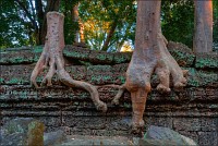 ”Дерево Лары”, в результате "подслушки” экскурсоводов, оказалось совсем не тем взгромоздившимся на крышу великаном с “осьминогом” стекающих к земле корней, что безраздельно завладел моим вниманием на входе в Та Прохм. “То” дерево было немеряно разросшимся на байоне паразитом, и полностью оправдывало название “душащего фикуса”. Ажурная архитектура из корней, обвивших небольшой дверной проём в одном из закоулков комплекса, действительно напоминала паучью сеть. А еще больше - результат применения оружия усмирения, которое писатели-фантасты называют “стрэнглер”. Корни растения не переплетались, как положено приличным корням на пути к земле. Они именно “слипались”, взаимопроникая друг в друга, затем разделялись толстыми - в руку - сегментами, и вновь слипались, но уже по-другому, чтобы опять разделиться и образовать очень сложную пространственную “авоську”, которую неведомый великан с сокрушающей силой натянул на выступы, впадины и барельефы зелёной от лишайников стены. Тут снова были японцы. А это значило, что в ближайшие сорок-пятьдесят минут они микро-группами и порознь будут взаимо-фотографироваться, старательно вспоминая хором (блин, какой всё-таки дух коллективизма у нации…), в какой именно позе Лара Крофт рассматривала не существующий в реале куст жасмина или того, что там его по сюжету заменяло. Вообще, вокруг присутствовали куда более развесисистые корнями образчики байонов, да таких, что даже удавов Лаокооновых завидки от их “упитанности” возьмут. Но японцы почему-то предпочитали толпиться именно у фикуса-паразита.