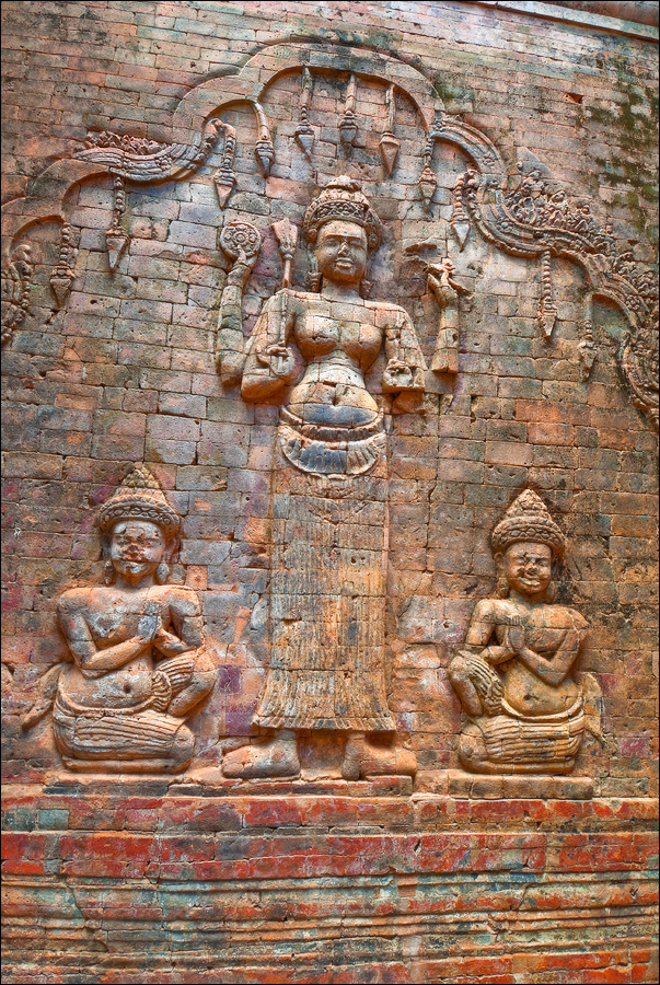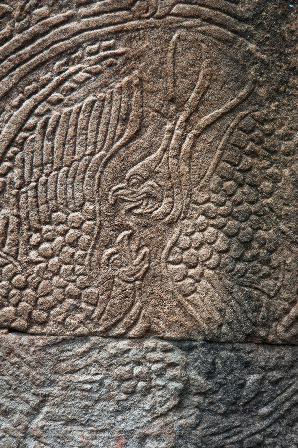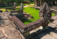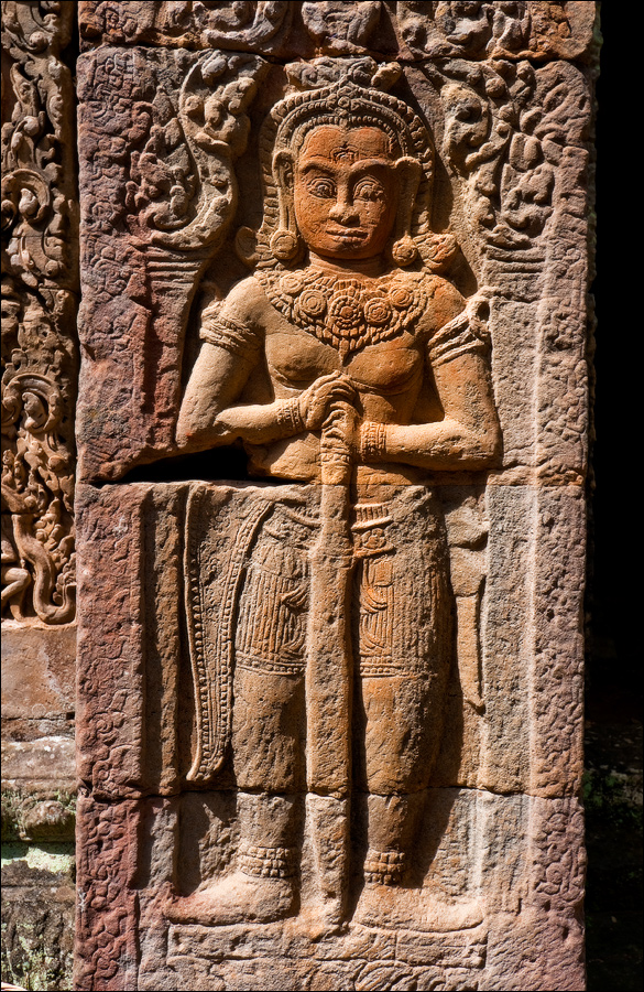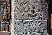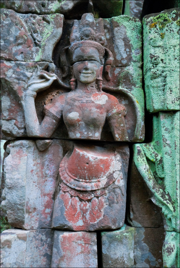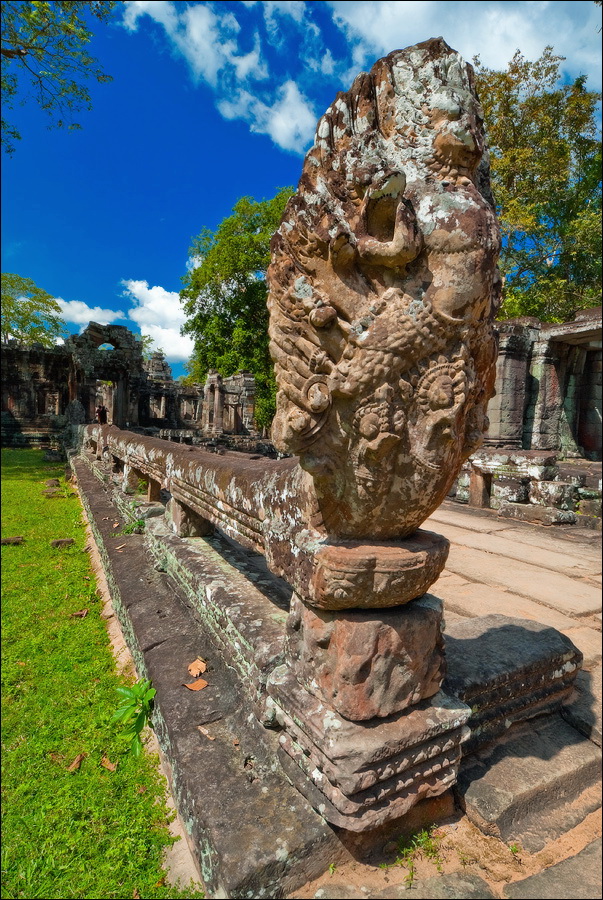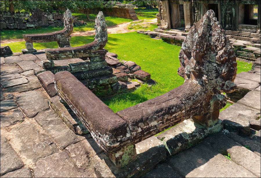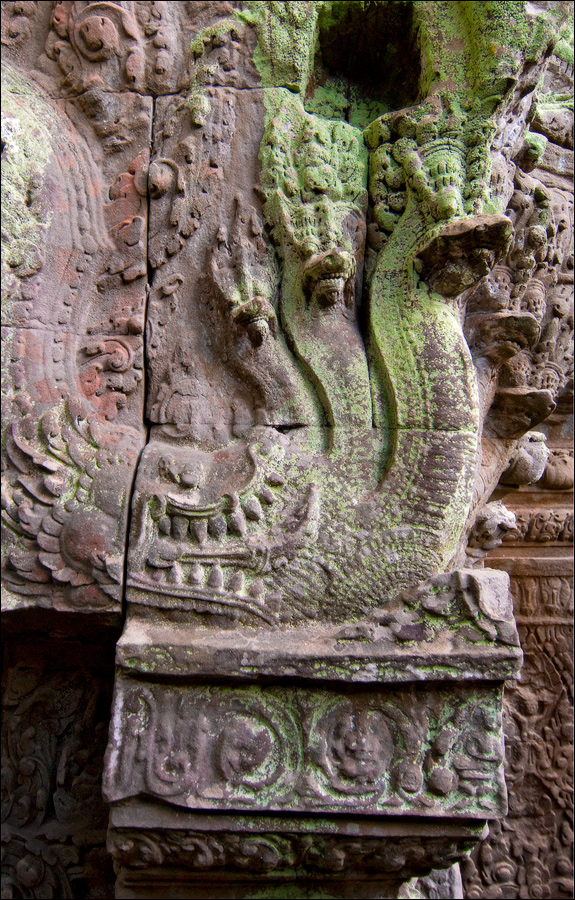 Достаточно пустынная Бантей Кдей мне, честно говоря, очень понравилась. (Как, в общем-то, и все виденные до сих пор творения… пра-авильно, Главного Камбоджийского “Зураба Церетели” - Джаявармана Седьмого. ЁКЛМН, у меня складывается стойкое ощущение, что у Джаявармана Седьмого имелись крайне глубокие молдавские корни: буквально всю сознательную жизнь он посвятил строительству и перестройке построенного до него...) Как-то она особенно живописно полуразрушена - злые языки говорят, из-за плохого проекта - но без лишних загромождений и препятствий, поэтому гуляется там легко и приятно. Пусть два концентрических ряда стен и два концентрических же ряда галерей несколько затрудняют движение в выбранном направлении, зато многочисленные башни тени дают предостаточно, а уже только за это в Камбодже следует говорить большое спасибо. Парные танцовщицы-апсары у дверных проёмов с нежной любовью выполнены, львы и гаруды от них не отстают. Наги семиглавые из красивого тёмно-коричневого латерита в целости и сохранности. Забавные у кхмеров наги: этакая любительская колбаса-тяни-толкай диаметром в полметра и длиной сколько смелая фантазия зодчего, помноженная на количество доступного материала позволяет.