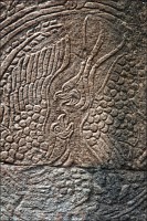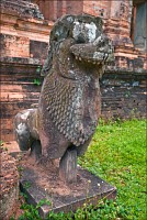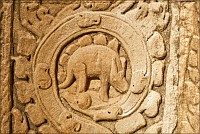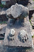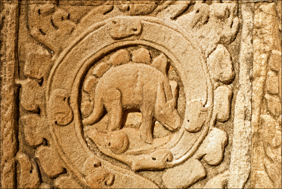 В начале третьего часа безоговорочного преклонения, когда воды в запасниках моего городского рюкзачка оставалось всего полбутылки, вспомнил я об ещё одной, широко известной в узких кругах, загадке Ражавихара. Тут уже произошла не ‘Лара Крофт”, а именно “Индиана Джонс”. Дано: вычислить по памяти три почти одинаковые башни в каком-то дальнем закоулке храма, тщательно осмотреть все их фасады снизу доверху и НАЙТИ ЕГО. Распечатку, где именно ЕГО искать, я, конечно же, забыл в Жасмин Лодж. Моим вольным гульбищам к этому времени пришёл конец: в храм набежало гидов, “стадных” барангов, охраны, уборщиц с растрёпанными мётлами, липучих, как мёд, торговцев сувенирами и… японцев. Внуки самураев самозабвенно щебетали, и фотографировали друг друга мобильниками. Казалось, что всё, что находится вокруг, им абсолютно до… Фудзиямы. Это был первый и единственный храм, где мне реально пришлось проталкиваться по коридорам, пихаясь локтями в потной, враждебно-добродушной среде. Йес-с-с! Вот он, вот он, мой родимый, мой любезный, мой самый-самый любимый с дошкольного детства (после трицератопса, ясен пень...) стегозавр! Спрашивается, что курили и где именно брали то, что курили придворные зодчие всё того же Джаявармана Седьмого, чтобы за 500 лет до исследований Джоржа Леопольда Кювье изваять в камне с самого мезозоя не появлявшиеся в этом мире ромбы костяных пластин и характерно выгнутую в крестце спину травоядного динозавра?!! Злые языки вещают, что это изображена... обыкновенная корова. Вот они - точно переборщили с Хеппи-Пиццей!
