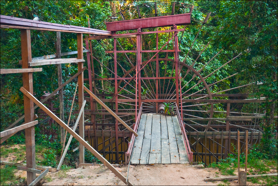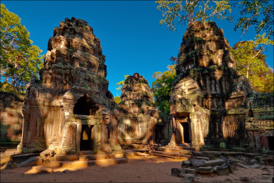 Позажигал я наверху, позажигал (это я о ароматических палочках, которые в вестибюлях боковых башен специально для бешеных барангов оставлены), галерее, весь храм на втором уровне пирамиды опоясывающей, поудивлялся, джунгли непроглядные и редкие облака, в предвкушении заката чуть розовеющие, заценил, вниз захотелось. Осталось только лестницу на память фотографировать. Нагнулся у самой ближайшей, стал прицеливаться... Опаньки... А лестницы-то, кроме самого ближайшего пролёта, и не видно. Круто. Во всех смыслах слова круто. Увидь я подобную перспективу спуска в горах, да под добрым экспедиционным рюкзаком, честное слово, для сначала попробовал бы другой путь поискать. Повернулся фейсом лица к “склону”, как книжки учили и, ощупью - вниз. Еле-еле с семьёй канадцев, в футболках с национальной кленовой символикой встречным курсом корячившихся, разминулся. Слез, отряхнулся как смог, повернулся... Киоски - есть. Охрана - есть. Даже “уан доллы” - и те есть. Тук-тука - нет!!! Ну, меня так просто не напугать. Подошёл к охраннику, выяснить нет ли еще одного КПП. Кивает (зараза, но тогда я ещё не знал, что он зараза...), вправо смуглой ручонкой отмахивает. ОК, говорю. Обогнул один угол храма... джунгли. Второй угол храма... джунгли. А комплекс - не из самых мелких, 120х100 метров. И солнца, в отличие от деревьев никто не вырубал. Тук-тук ждал меня за третьим по счёту углом. О, Всемогущий Тримурти (или правильнее сказать “дорогие”, ведь их же трое - Брахма, Шива и Вишну), пошли(те?) тому охраннику особенную карму: каждый день по сорок три раза на Та Кео раком забираться!
