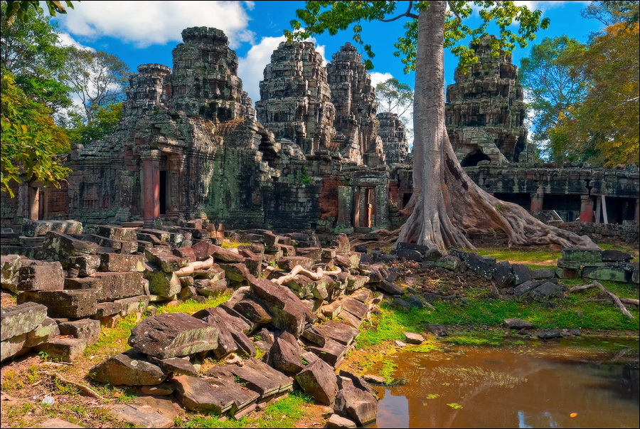 Проезжая мимо Срах-Сранга, мы немного притормозили на повороте длиннющей стены храмового комплекса Бантей Кдей (Banteay Kdei). И зацепился я взглядом за одно деревце. Их по телику в киношках по Африку любят показывать. Шелушащаяся чешуйками, бежевая, очень светлая кора и характерные корни: почти линейно убывающие плоские вертикальные пластины, многолучевой звездой разбегающиеся от ствола. Пластины настолько высокие, что я, когда поближе подошёл, едва-едва до верхней грани "корешка" достал. Фотографировал я дерево полчаса минимум. Только-только прицелюсь, откуда-нибудь обязательно высовывается свободно блуждающий баранг с группой подтанцовки "уан доллов". У меня, за прудом притаившимся, три персональных "уан доллы" было. Якобы аутентично-кхмерские шёлковые платки по "уан долле" я сразу отмёл с негодованием. Та же участь постигла бумажных птичек и страшненьких керамических Будд. А один гарный хлопец неутомимо фарцевал мне контрафактные путеводители по Ангкору. Фотки в них были такие, что от перешарпа низкокачественых JPG скулы оскоминой сводило. Цена, заявленная на обложке - 24 “уан доллы”. Когда я, повертев книгу в руках, сказал, что мне этого не нужно, "лучшая цена, только для вас, мистер" упала до 15, потом, по мере моего удаления, до 10, 5, и, наконец, вполне ожидаемо, ”уан доллы” завывающим голосом. Прикольная получается кхмерская арифметика. С какой бы цифры торг не начали, "уан доллой" закончится.