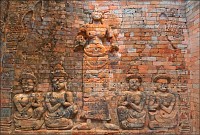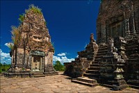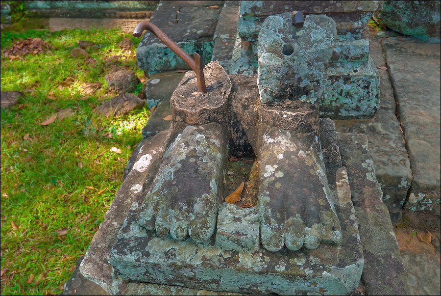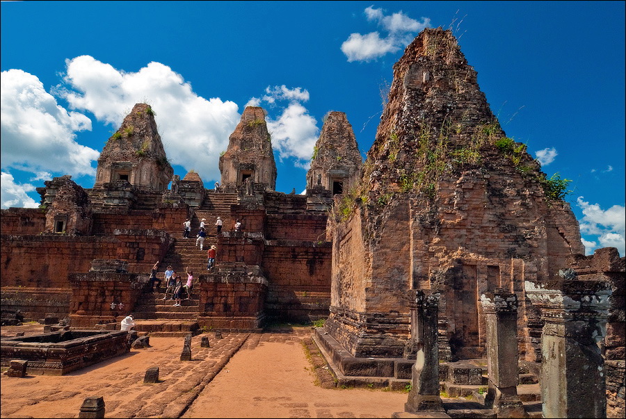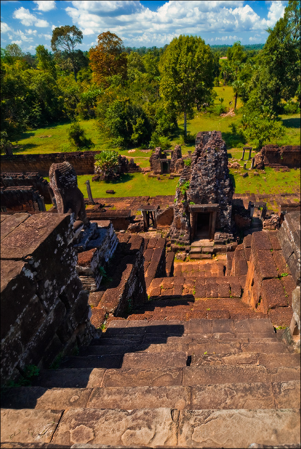 БаЦ! еще одна неожиданная находка. По дороге от Preah Rup-а к Пхном Бакенгу мы умудрились заскочить еще в храм Prasat Kravan - скромному трезубцу из башен, щеголяющих ну просто потрясной резьбой по красному кирпичу, причём исключительно изнутри. Что я пил в этот день? Или я тупо мало пил, и радиатор у "серого процессора" не справлялся с потоком информации? ...Толпа приезжих выползает из паркинга, уплотняется в колонну по шесть, как в горлышко воронки всасывается в джунгли, по которым начинается затяжной подъём на вершину крутого, обособленно стоящего холма. Идти, пыхтя и сопя, минут 20, не меньше. Барангам с больным сердцем (и слабыми нервами…) там делать просто нечего. Здоровым тоже лучше не появляться, потому, что шанс убиться всем желающим предоставляется вполне реальный. Пном Бакенг, отстроенный сразу после переноса столицы из Петербурга в Москву… Тьфу! Это всё жара. Переноса столицы из Харихаралайи (вспоминаем первый день - Ролоуса…) в Ясодхарапуру (которой только через два века предстояло украситься Ангкор Ватом…) - массивный ступенчатый храм-пирамида о 5 уровнях, со всеми вытекающими отсюда - вы угадали, - лестницами. Не Та Кео, конечно, но “два сапога туфли". И вот вся эта немыслимая толпа - дети, дядьки, тётки, старички и старушки, что побойчей, - ломят на четырёх костях на ту пирамиду как подорванные. Такое нужно снимать на камеру высокого разрешения. Это почти штурм орками Минас Тирита, но за отсутствием на верхней площадке Гимли и Арагорна вниз почти никто не падает. Только один товарищ, парой ступенек ниже меня, поторопившись на пролёте с особенно разрушенными ступенями, сковырнулся. Хорошо, нижние фаланги сильные и мужественные попались, поддержали, за что ухватили, и обратно на ноги поставили.