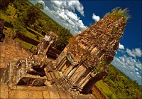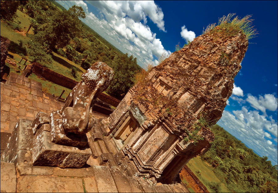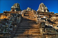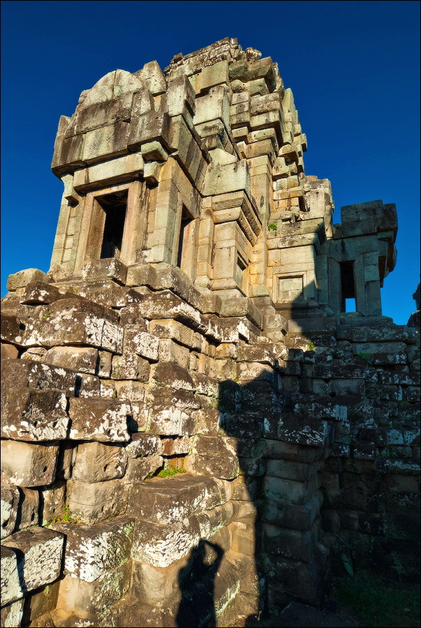 Обедать в три часа дня в ресторане на крыше - занятие только для настоящих барангов. Покатаюся-поваляюся под кондиционером, бутерброд с сырокопчёной колбаской и плавленым сырком точа. Теоретически, самая жара уже спала, практически - тот же полярный лисёнок, но только в профиль. Надо сцепить зубы и выдвигаться. Дилижанс мой уже под парами, в низком старте. Подъезжаем через какое-то время к аннулированному из вчера храму-горе Та Кео. Фигассе пирамидку в пять слоёв отгрохали! Ну, думаю, сейчас мы будем этот “перевал” 1A - уклон градусов 70 - “немножко” брать в лоб. Такой весь из себя бесстрашный “снежный барс”. А тук-тукер мой тут и говорит: "я тебя спецом привёз к той лестнице, что самая пологая. Чтобы тебе, убелённому сединами барангу, легче подниматься было". Ы-ы-ы... А я надеялся, что и взаправду крут... Перчаточки с синими пупырышками натянул, полез. Ступени не горизонтальные, а скошенные наружу (ибо за девять веков храмовства протёртые), некоторые всего сантиметров десять шириной, при высоте в 50-60. И все это мелким светлым песочком присыпано. Когда лезешь, почти грудью “склона” касаясь, дышишь соответствующе. Песочек взвивается, на зубах скрипит... Благодать, короче. Полнейшая и окончательная. Взгромоздился я на 21 метр (7-этажный дом), выдохнул, на парапет из светлого песчаника жухлым листиком опал, квинканс из башен рассматриваю.