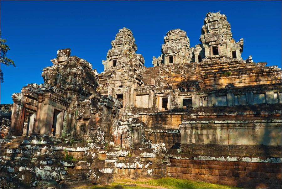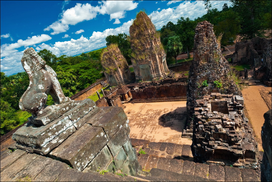 Вы всё ещё не знаете, что есть квинканс? Тогда мы идём к Вам! В кости играли? Цифра 5 выпадала? Вот вам и весь “квинканс” (от латинского “quinque”). Высоко сижу, далеко гляжу. Потому что близко разглядывать особенно нечего: пятибашенные комплексы я уже видел в самых разных ипостасях, а главная фишка, она же большая беда Та Кео - никаких привычных рюшек-завитушек-апсар-гаруд-авалокитешвар, один свежевыработанный камень. То ли Пятый по счёту император Джаяварман слишком рано ласты склеил, то ли риэли у него не вовремя закончились. Пытаясь восстановить честь династии в глазах потомков, премьер-министр императора изваял в камне версию, что во время строительства в вершину храма ударила молния, работяги расценили это как “аццкое знамение” и прекратили трудиться. Вывод: надо было приглашать на стройку молдаван. Из “мистического” они боятся только не выплаченной вовремя зарплаты. Полное отсутствие декораций делает "темпол" тяжеленным и массивным, как сам не знаю что. Матёрая глыба - лучшее определение. По двадцатиметровым башням, которым совсем недавно исполнилось тысячу лет, можно смело заниматься боулдерингом: трещины, грубые следы топоров, высекавших глыбы из русел ближайших рек.