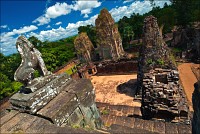 Дополнение: уже ковыряясь с украшением текста фотографями, выяснил, что, оказывается, побывал в этот день еще в одном храме - Preh Rup. Он абсолютно вылетел у меня из головы, потому что был как две капли воды, как две единоутробных снежинки похож на Истерн Мебон! Такая же крутенькая пирамида, те же пять башен, такие же сторожевые львы... Да здравствует GPS, который помнит выверты сюжета лучше меня самого! Пока я, уже несколько укушенный спекающей кору головного мозга влажностью и температурой, ковырялся со штативом у восточной гопуры, пытаясь вместить в единый кадр всю окружающую её мифическую живность, террасы Олифантов и Прокажённого короля успели погрузиться в густую тень. Пришлось прямиком тук-тукать на закат, к расхваленному “Lonely Planet” святилищу индуистов Пном Бакенгу. Я читал у очевидцев действа, что ситуация с “культовым закатом” давно вышла из-под контроля, но чтоб настолько... Такого количества и разнообразия транспортных единиц я ещё в Камбодже не видел. Казалось, что все байкеры, мото-байкеры, тук-тукеры, таксисты и погонщики слонов провинции Сием Рип собрались на профсоюзную забастовку в формате шабаша. Но и это еще не всё. Если кхмерам когда-нибудь придёт в голову мудрая мысль, что пришла пора раз и навсегда очистить Священный Ангкор от барангов, им следует просто-напросто поставить шесть шестиствольных пулемётов по дороге от Пном Бакенга к паркингу у подножья холма и вовремя подвозить патроны. То, что пять “пушек Гатлинга” будут перегреваться, я вам гарантирую на все сто двадцать пять процентов.