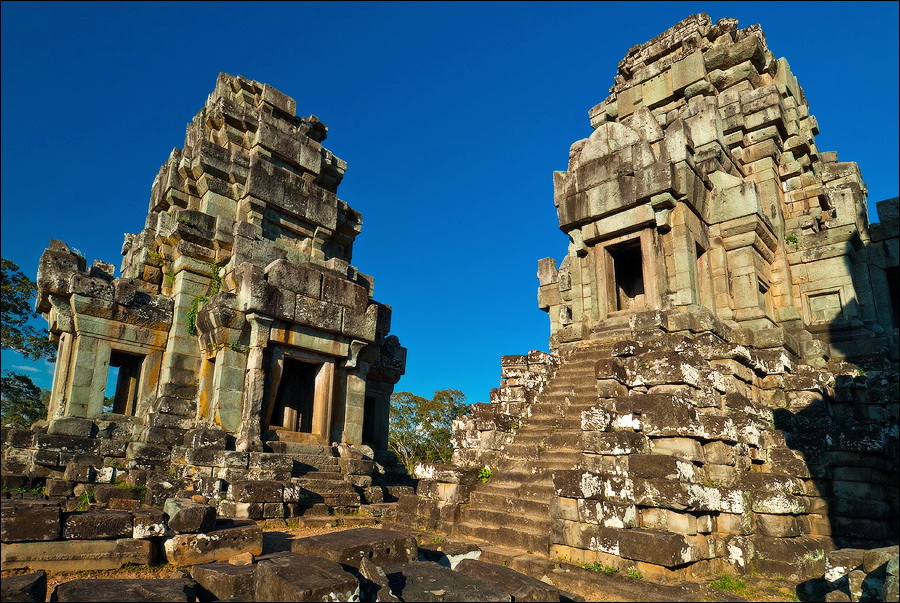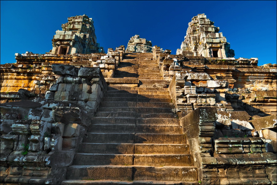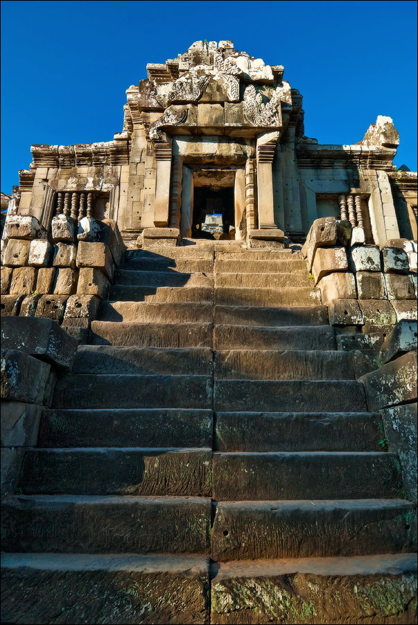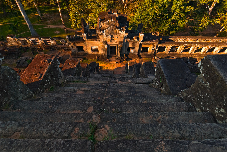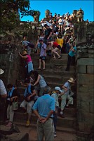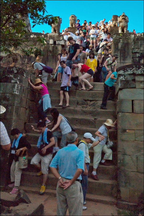 Башни Пном Бакенга были в куда более плачевном состоянии, чем у недостроенного Та Кео: похоже, финальная обработка резьбой является вызовом для Природы, стремящейся стереть каменных апсар с лица земли. Фактурные жёлто-оранжевые джунгли были слишком далеко. Полсотни мелких пирамидок, с плотной симметрией покрывающих нижние ярусы храма и стерегущие лестницы львы сверху выглядели не настолько объёмно, чтобы заморачиваться попаданием фотонов на матрицу. Объёмно выглядела одна лишь толпа, но зачем мне столько коллективных портретов барангов?!!! Плюнул я на закат. Водички отпил, рюкзачок на спину и - вниз прицелился. Ага. ЩАС. Тут таких “умных” и без меня на все четыре лестницы с запасом хватает. А ещё ведь есть ещё и глупые, которые всё ещё вверх отовсюду лезут! “Незабываемый вид на затерянный в джунглях Ангкор Ват”, "сансет оф лайфтайм", "маст-сии аттракшен", ля-ля-ля, тополя... Участвовать в броуновском движении целеустремленных потных тел на уклоне в 60 градусов, где некоторые ступени просто шатаются, а некоторые ещё в затёртые временем века выкрошилось, это, скажу я вам, та ещё жесть.