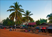 Снова “экстремальный” обед: у стремноватых на вид лоточников неподалёку от храма. Суп-лапша с говядиной и лемонграссом, неизменный рис вместо хлеба (я уже прямо профессионал прикладного рисоточения...), всё приготовлено на открытом огне. Запах от небольшого костерка в ржавой полубочке необычен и ласкает ноздри. Вместо радушно предложенного зелёного чая я выбираю тоник, у которого нужно не забыть протереть салфеточкой радующее обилием соляных разводов и рыжими песчинками горлышко. Качество почти растаявшего льда в огромном рыжем холодильнике более чем сомнительное. А вот лемонграсс - лимонное сорго - классный бурьян. Я бы добыл пучок “исходников” - дома посадить, в горшочек. Но опасаюсь, молдавские таможенники за незаконный импорт подозрительной “травки” покусают. Вдруг не ознакомленный с Юго-Восточно-Азиатской кулинарной спецификой спаниель-наркоман посчитает, что загадочный лемонграсс просто так курить тоже можно? Дорога от Koh Ker на юго запад, к горам Phnom Kulen, была самой экстремально колдобистой, что я до сих пор встречал в Камбодже. Настолько колдобистой, что я даже пару раз - невзирая на затянутый, на сколько это вообще возможно, ремень безопасности - чувствительно приложился головой к раме окна.