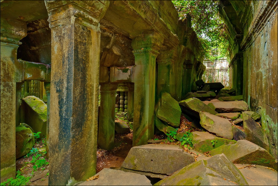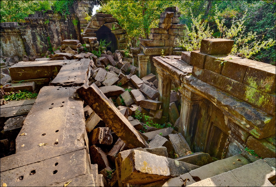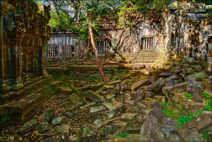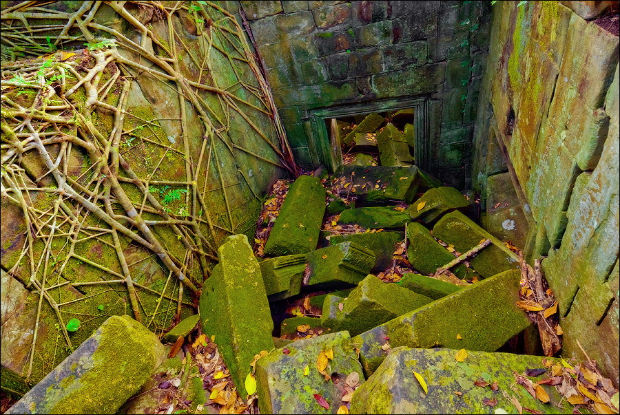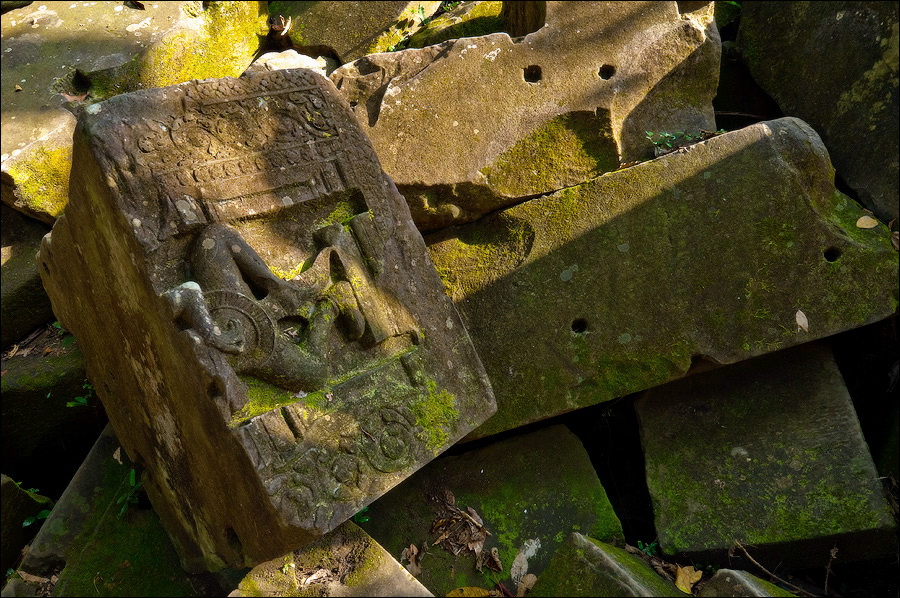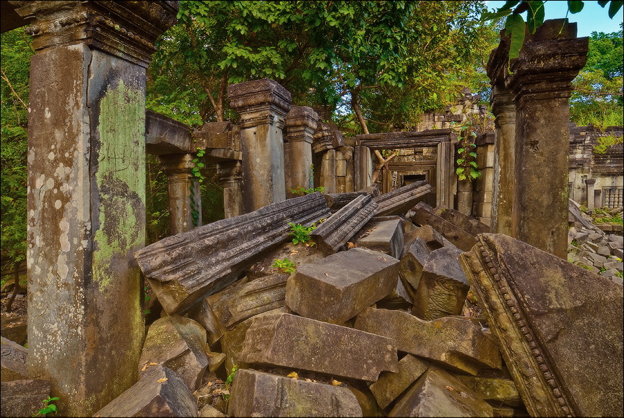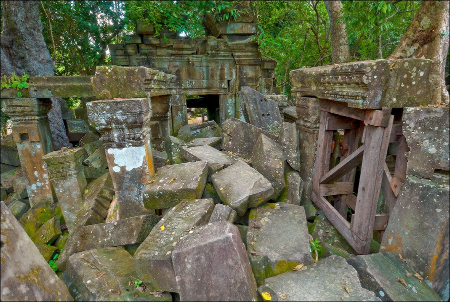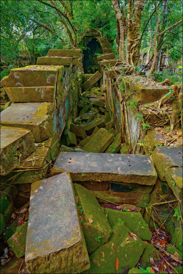 Там, где только что был бессистемно заваленный стройматериалами XII века внутренний дворик, увиделся шикарный бассейн с цветущими лотосами. Да не один! Стоило нам вскарабкаться на чудом сохранившееся перекрытие галереи, лежащее на самых краешках мощных колонн, этих “бассейнов с лотосами” насчиталось целых шесть, и разделены они были не каменными джунглями, а сводчатыми залами для медитаций. Из залов целыми сохранилось всего несколько, и спуститься-протиснуться в них оказалось целой историей. Только после пары-другой таких заныров и последующих выныриваний я начал проникаться масштабами происшедшей с Boeng Melea катастрофы. Джунгли не просто одержали верх. Они сплясали развесёлый шабаш на "костях" поверженного "богатыря". Они свершили геноцид вплоть до самого последнего из рода. "Не оставить камня на камне" - это именно про Beung Mealea. Получившие волю лианы и корни не просто рушили стены, дырявили потолки и расшатывали фундаменты. Они сковыривали резьбу по камню, дробили колонны в крошку, разрывали на куски плиты перекрытий. Случись такое не века назад, а недавно, я бы сказал, без пироксилина и нитроглицерина здесь никак не обошлось.