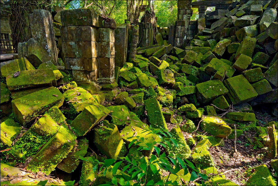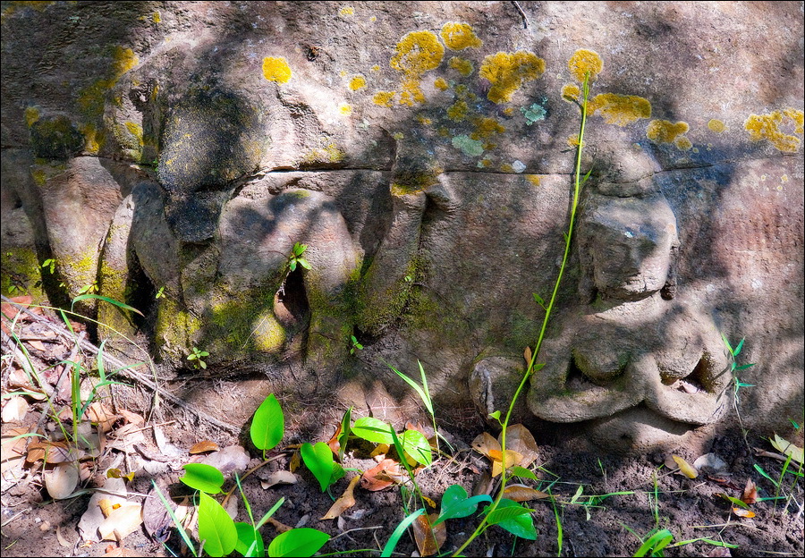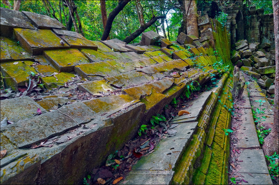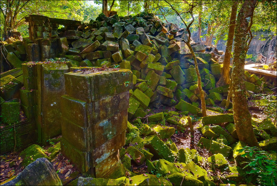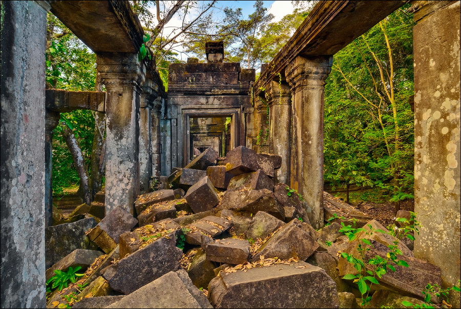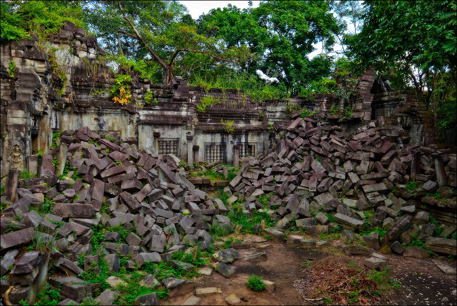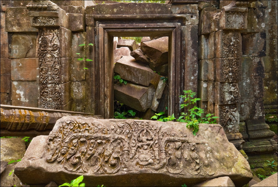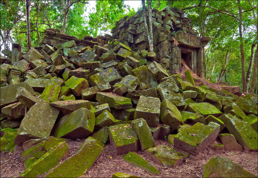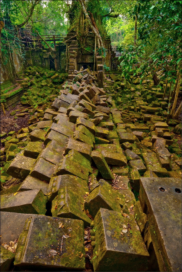 Там, где только что был бессистемно заваленный стройматериалами XII века внутренний дворик, увиделся шикарный бассейн с цветущими лотосами. Да не один! Стоило нам вскарабкаться на чудом сохранившееся перекрытие галереи, лежащее на самых краешках мощных колонн, этих “бассейнов с лотосами” насчиталось целых шесть, и разделены они были не каменными джунглями, а сводчатыми залами для медитаций. Из залов целыми сохранилось всего несколько, и спуститься-протиснуться в них оказалось целой историей. Только после пары-другой таких заныров и последующих выныриваний я начал проникаться масштабами происшедшей с Boeng Melea катастрофы. Джунгли не просто одержали верх. Они сплясали развесёлый шабаш на "костях" поверженного "богатыря". Они свершили геноцид вплоть до самого последнего из рода. "Не оставить камня на камне" - это именно про Beung Mealea. Получившие волю лианы и корни не просто рушили стены, дырявили потолки и расшатывали фундаменты. Они сковыривали резьбу по камню, дробили колонны в крошку, разрывали на куски плиты перекрытий. Случись такое не века назад, а недавно, я бы сказал, без пироксилина и нитроглицерина здесь никак не обошлось.