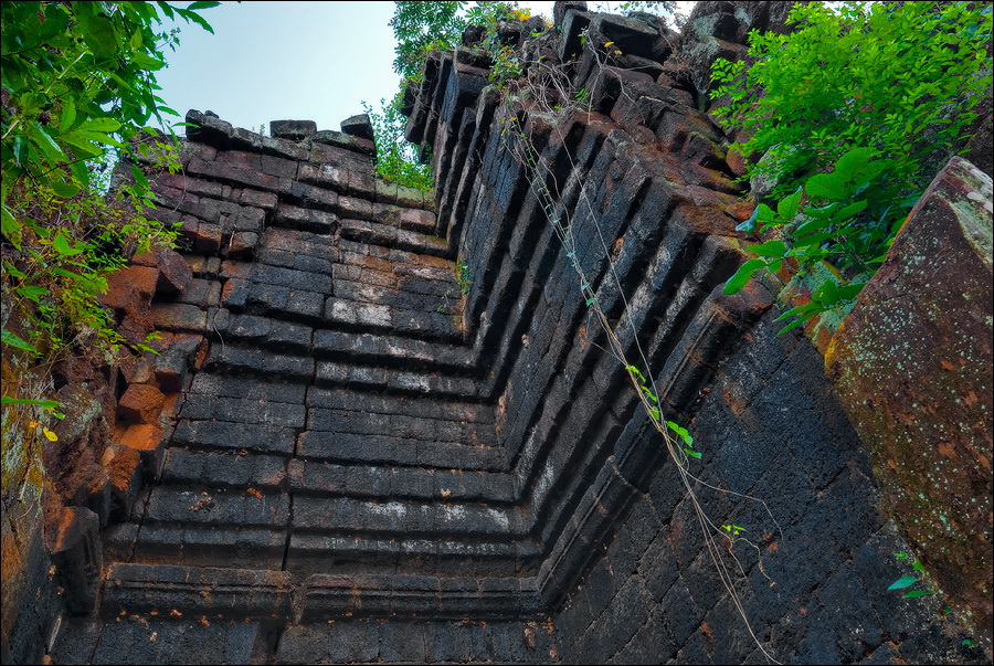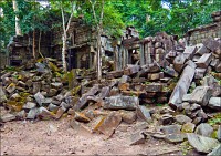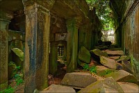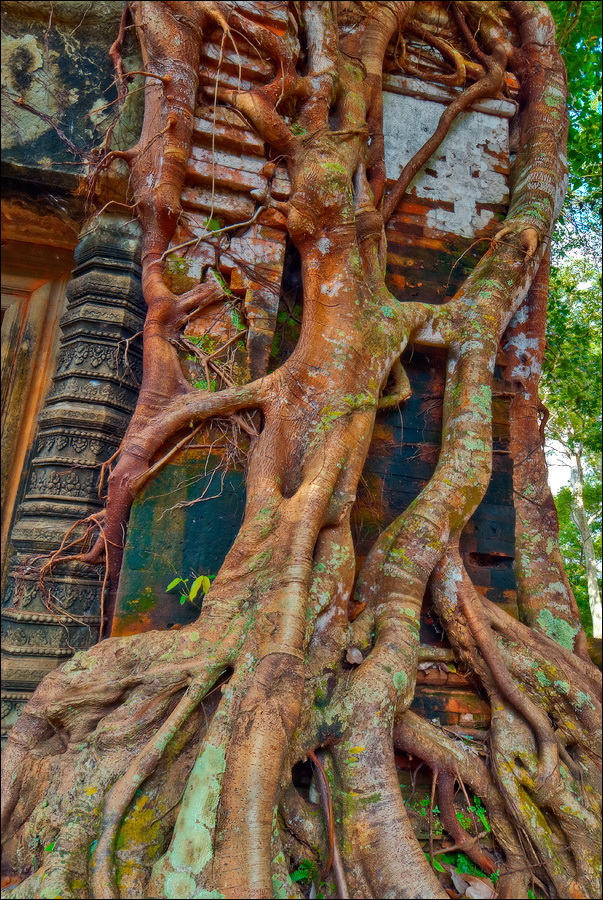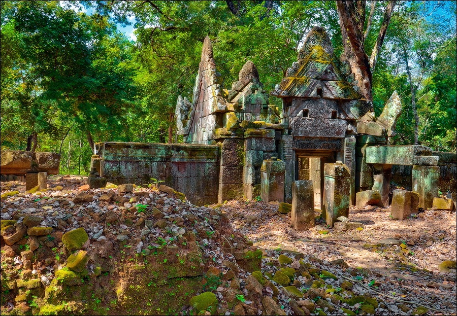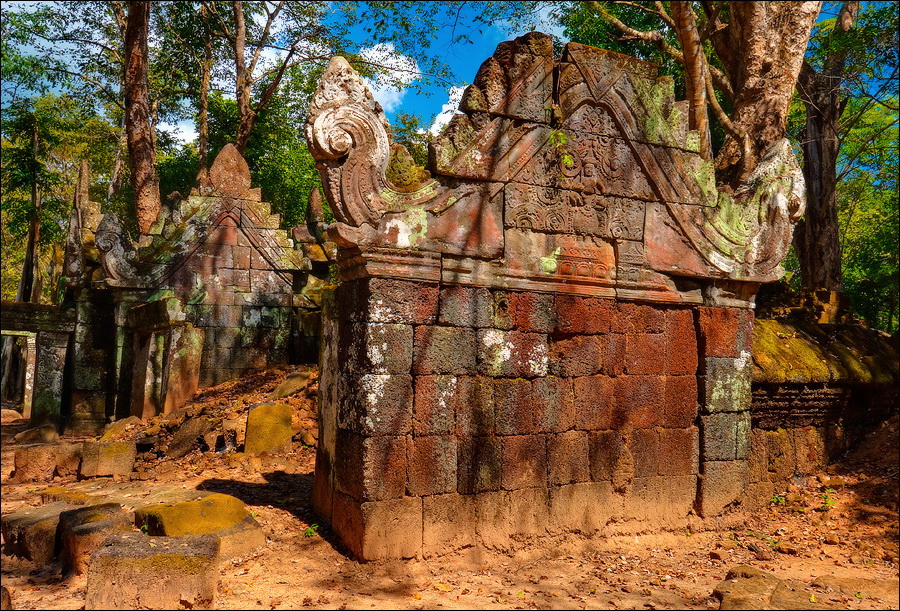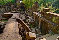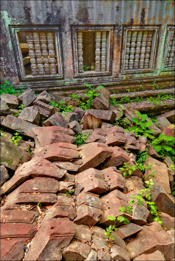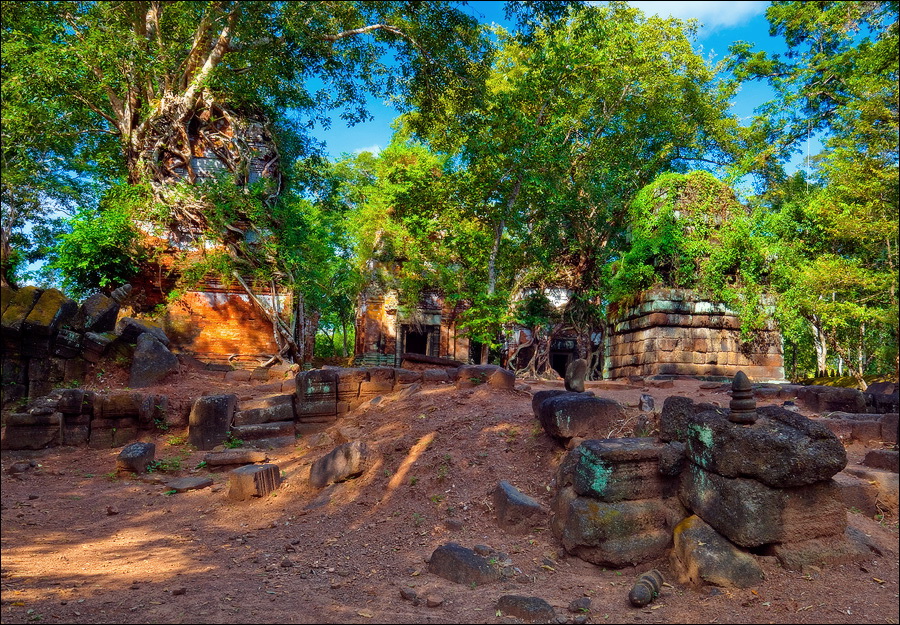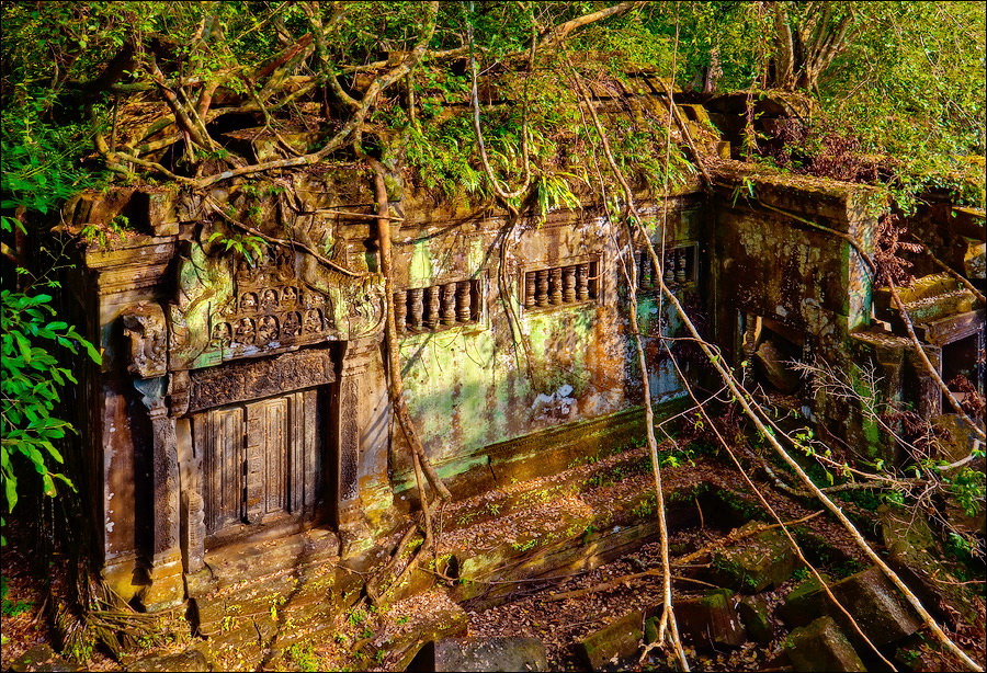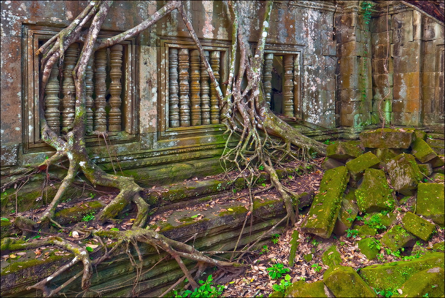 Там, где только что был бессистемно заваленный стройматериалами XII века внутренний дворик, увиделся шикарный бассейн с цветущими лотосами. Да не один! Стоило нам вскарабкаться на чудом сохранившееся перекрытие галереи, лежащее на самых краешках мощных колонн, этих “бассейнов с лотосами” насчиталось целых шесть, и разделены они были не каменными джунглями, а сводчатыми залами для медитаций. Из залов целыми сохранилось всего несколько, и спуститься-протиснуться в них оказалось целой историей. Только после пары-другой таких заныров и последующих выныриваний я начал проникаться масштабами происшедшей с Boeng Melea катастрофы. Джунгли не просто одержали верх. Они сплясали развесёлый шабаш на "костях" поверженного "богатыря". Они свершили геноцид вплоть до самого последнего из рода. "Не оставить камня на камне" - это именно про Beung Mealea. Получившие волю лианы и корни не просто рушили стены, дырявили потолки и расшатывали фундаменты. Они сковыривали резьбу по камню, дробили колонны в крошку, разрывали на куски плиты перекрытий. Случись такое не века назад, а недавно, я бы сказал, без пироксилина и нитроглицерина здесь никак не обошлось.