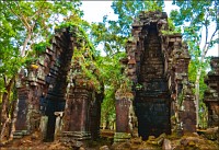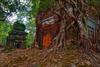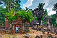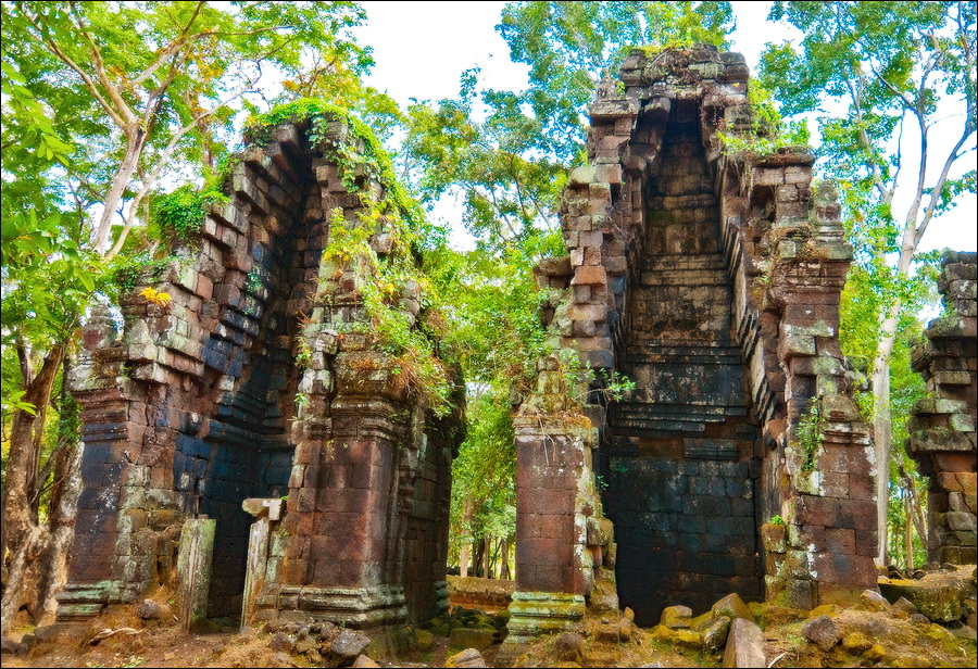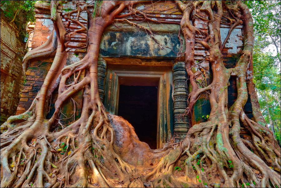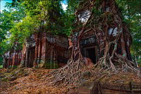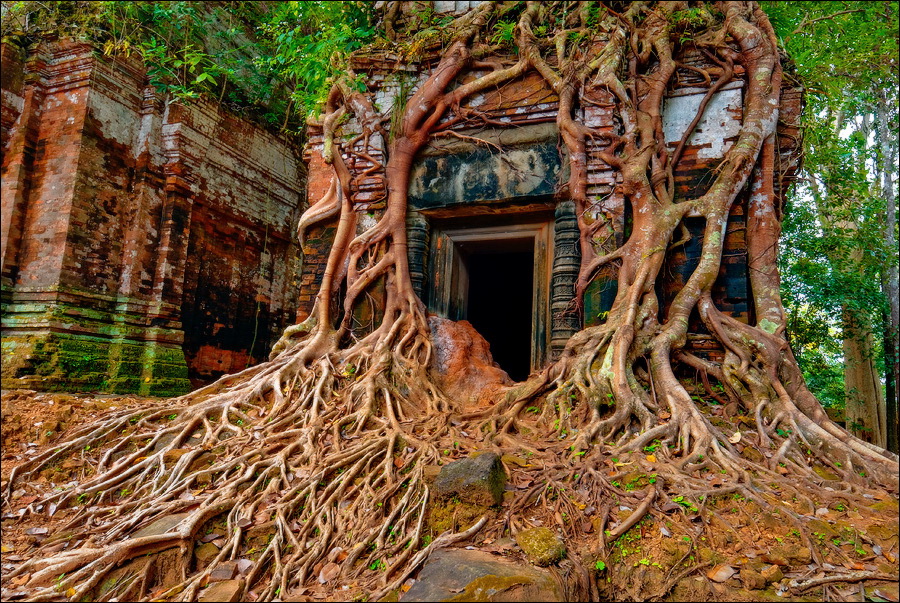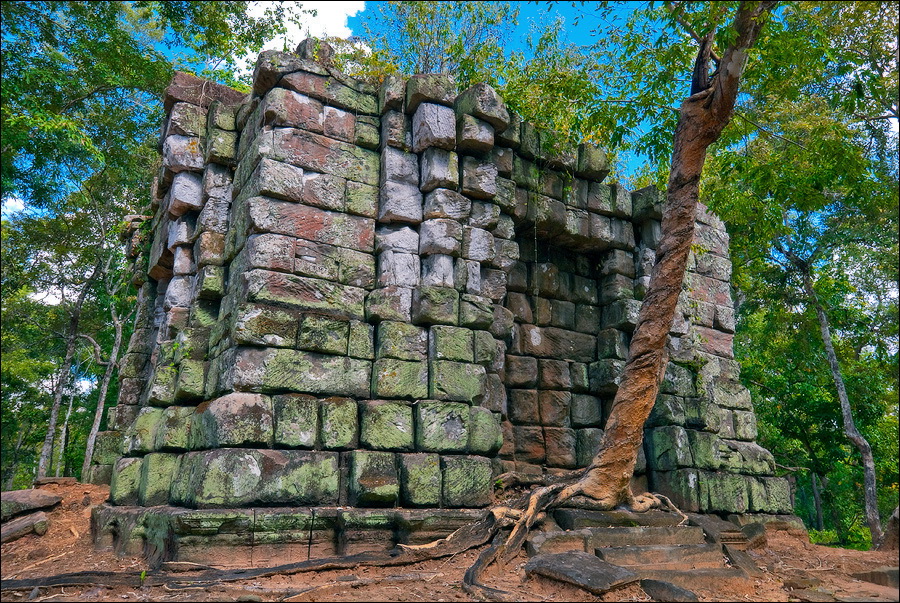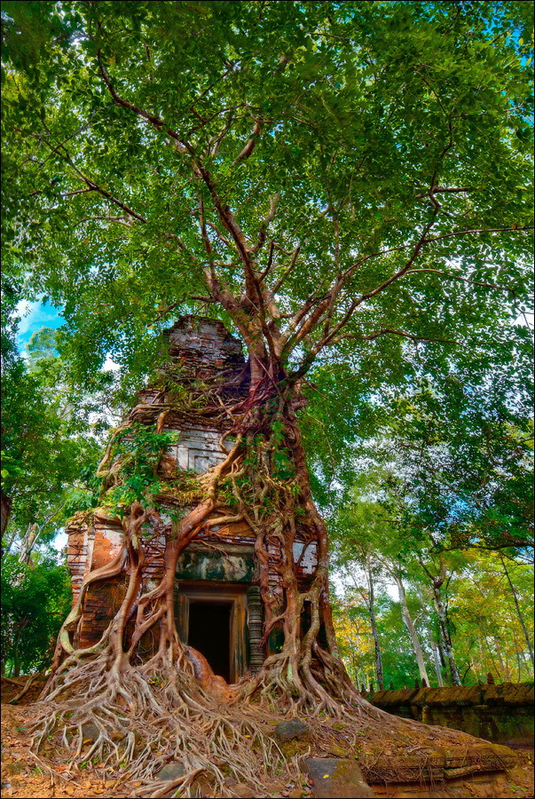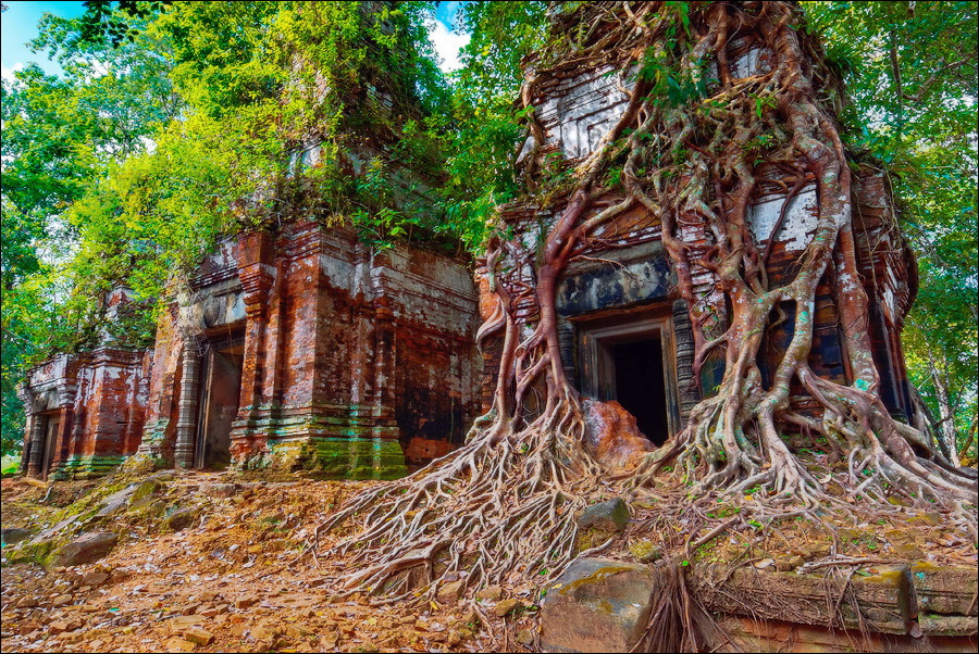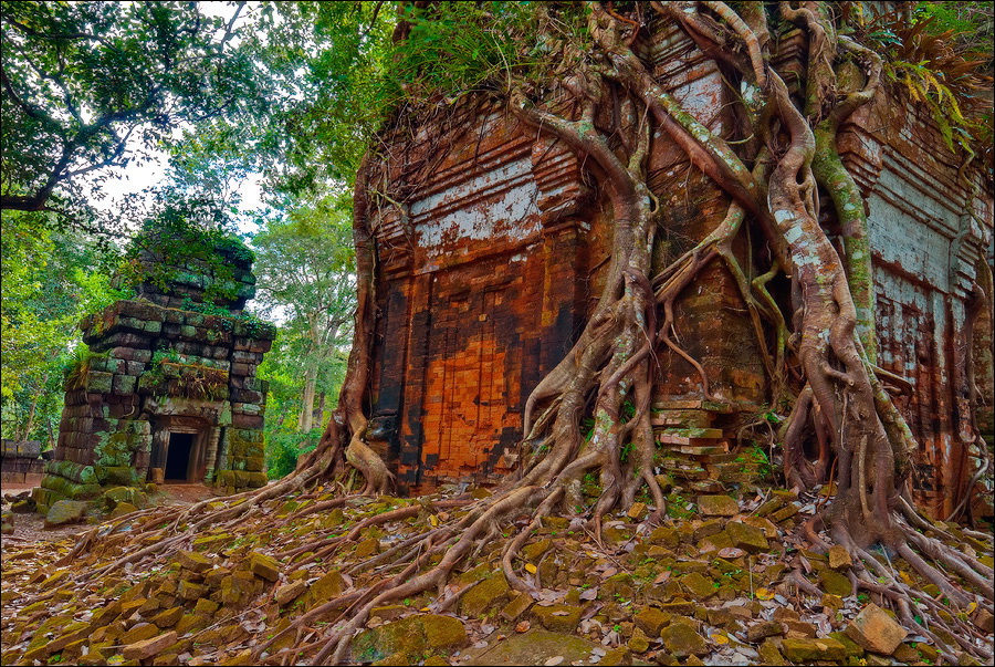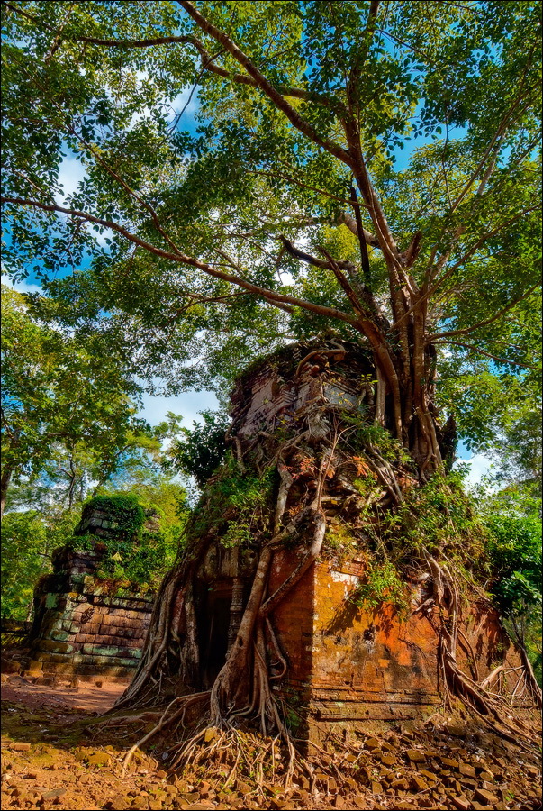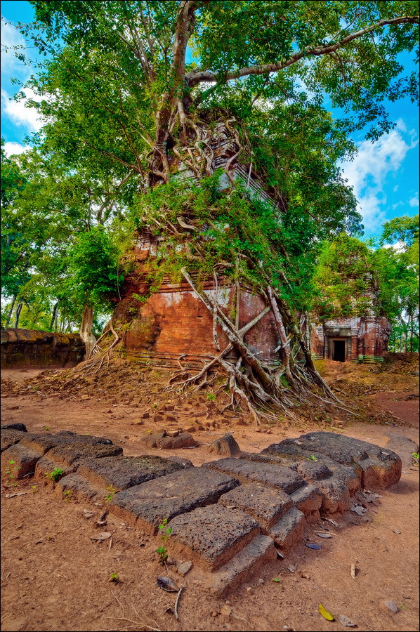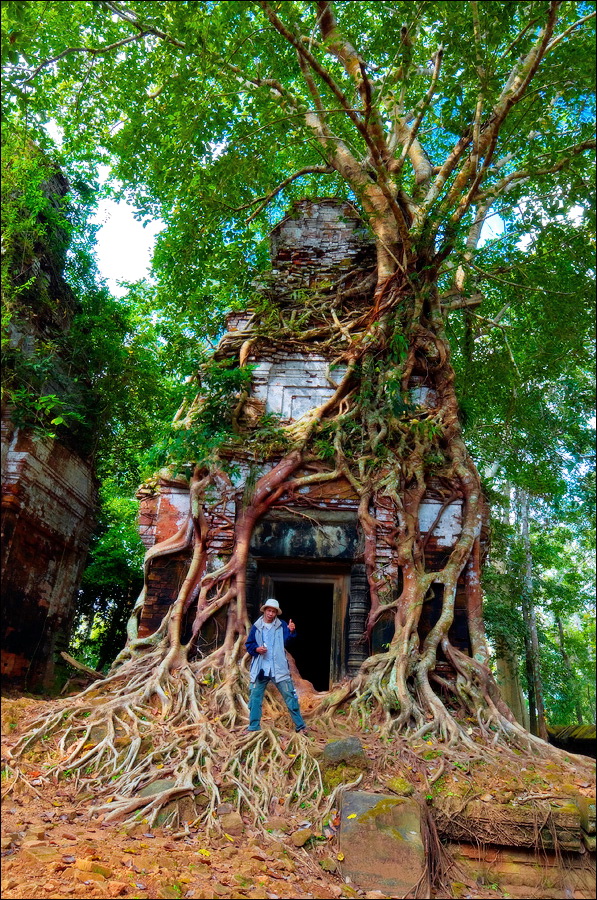 Первым нам открылся во всей своей красе Prаsat Pram - пятибашенная очаровашка из проигрывающего битву со Временем красного кирпича. С первого взгляда на него я подумал, что именно так должен был выглядеть по-настоящему оставленный в покое Та Прохм (На это момент я ещё не видел, до чего джунгли довели Бенг Мелию…). Это был то самый, показательный случай, когда “душащие фикусы” трансформировались в полностью опутывающие башни густые сети. Что-то у камбоджийских деревьев в геноме есть порочное: их дождём не поливай, но дай заковыряться повыше на какую-нибудь кхмерскую башню. Чтобы врасти в неё по самое “не могу” корнями, вырастить над ней затмевающий солнце зонтик из ветвей, а затем, подобрав нужный момент, стиснуть покрепче и, не оставляя камня на камне, порушить строение до самого фундамента. Превосходные лианы. Непомерной живописности корневища. Залитое загадочной тьмой нутро башен за толстенными порталами невысоких входов. Но самое главное - никаких человеческих следов!