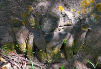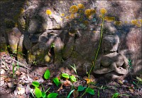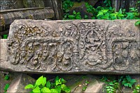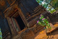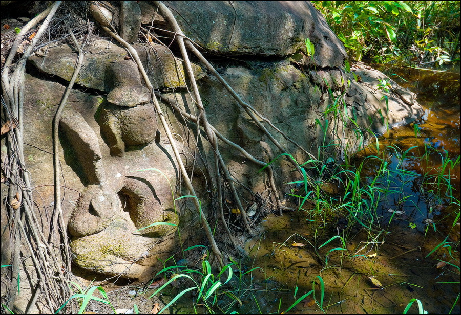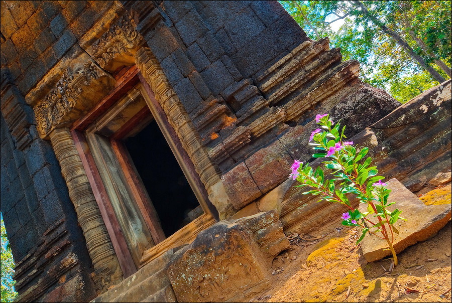 Через две минуты на колёсах справа по курсу нам повстречалась скромная одинокая башенка Prasat Ang Khna, которую мне подали как “Black Girl Temple”. Чтобы лучше соответствовала образу “чёрной девушки”, башню из коричневого ракушечника древние вымазывали сырым каучуком до жирного антрацитового блеска. Эту традицию кхмеры соблюдают и по сей день. А у самого входа в башню, тонким лучом солнца в просвет листвы освещённый, цветок диковинный розово-фиолетовыми лепестками на ветру трепетал. И срывал горячий ветер нежные лепестки, и волок, переворачивая, по красным плитам ступеней, затем сминал и уносил вдаль... И стало мне вдруг грустно-грустно и одиноко, потому, что чем-то это напоминало нашу позднюю осень, от которой я сейчас был так невозможно далеко... Соседний Prasat Khna носил невосстановимую личину груды чёрного камня. Я бы тут не задержался ни на мгновение, если бы не мой бесценный тук-тукер Чен. Вернул, отправился вместе со мной к бережку соседнего озера. Показал высеченного на прибрежном уступе Вестника Богов - четверорукого Ганешу с головой слона, "златоседлого и среброшпорого" Брахму, чьи руки пахтают океаны, а так же двух стилизованных гекконов и чёрную пантеру, растянувшихся поспать или загнувшихся от солнечного удара на обжигающем солнцепёке.