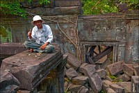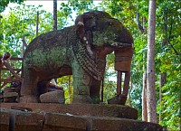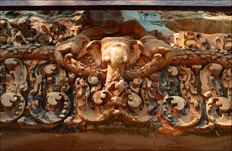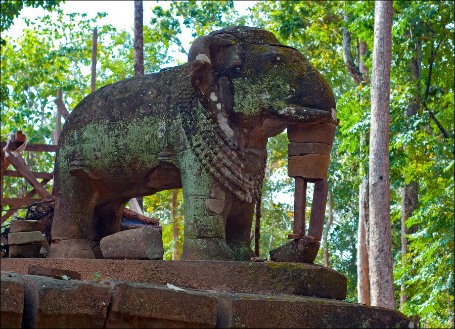 У “Храма Слона” Prasat Damrei (фактически, четырёх слонов...) мы познакомились со студентами-археологами из Йемена, занимающихся мытьём шампунем одного из "бедных животных". Ноги и брюхо у слоняки валялись отдельно, спина и голова - отдельно. Йеменцы обещали склеить зверушку специальным клеем (“некалорийным” для насекомых и голодных бактерий…) и подъёмным краном водрузить обратно на постамент. Сейчас “своими ногами” там всего один слоник стоит, да и у того хобот деревянными чурбачками подперт. А сам храм по периметру тросами опутан и талрепами блестящими стянут. Нам настолько “hi-tech” развалины в коллекции фотографий не нужны! Кстати, раз уж разговор зашёл о “хай-теке”… Не логичнее ли было оставить башни оплетёнными корнями фикусов? Эстетики в них куда как больше, чем в витых стальных тросах. Да и богам индуистским, буде они еще не все окончательно в нирвану откинулись, близость “чёрного металла” наверняка не по вкусу. Вот были бы тросы из червонного золота, а талрепы - из платины пополам с родием или рутением, тогда - оплетайте хоть до наступления новой Юги.