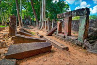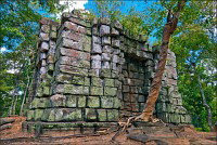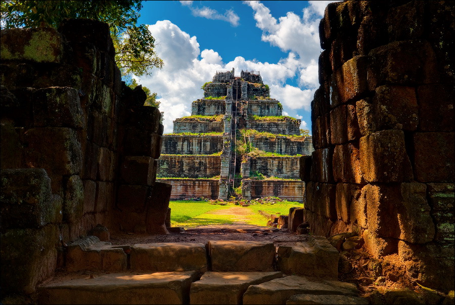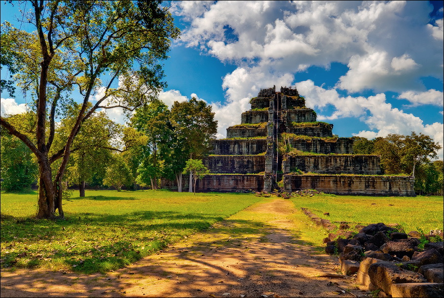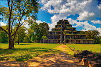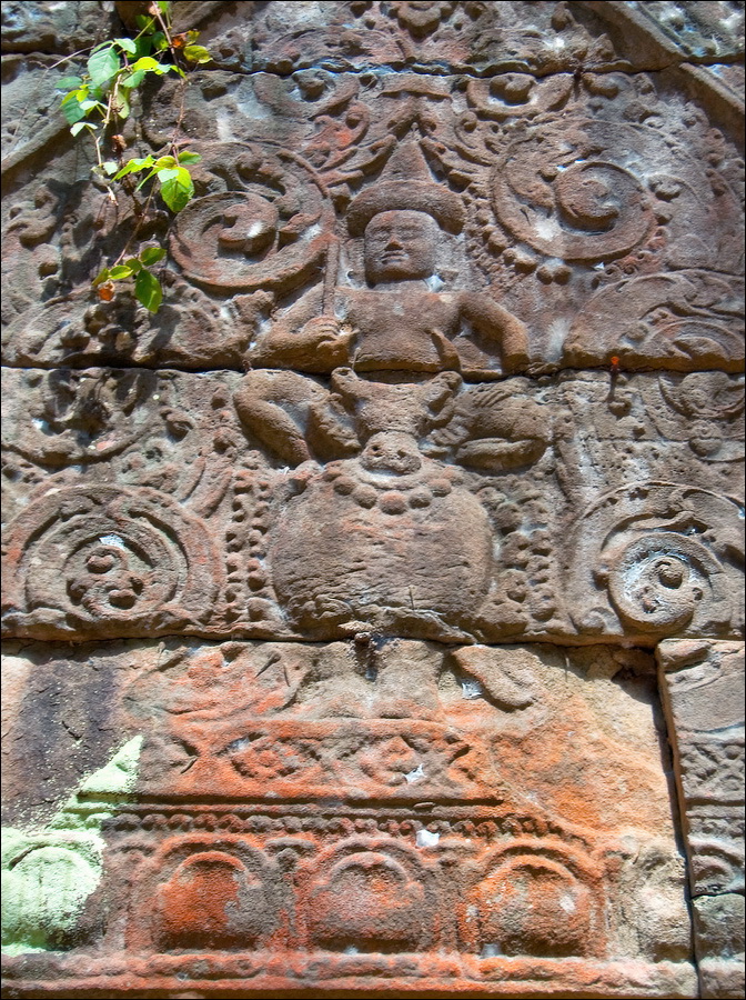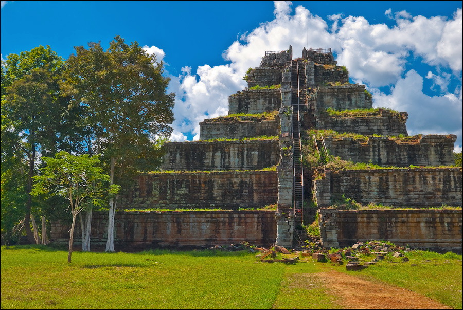 Очень скоро заканчивается пруд с неизменными розовыми лотосами, забирающий в зелёные квадратные скобки подпёртый где/как/чем можно Prasat Krahom. Меня умиляют ровнейшими рядами порушенные квадратные колонны галереи, когда-то связывавшей первую гопуру с главным “зданием”. Гармоничная эстетика даже в горизонтальном положении - это стильно. Prasat Krahom не поражает особой резьбой и скульптурами (исключение - изящные резные колонны “фальшивых” окон) - всё, что могло быть вывезено, что говорится, “украдено до нас”. Но что касается духа давно ушедших времён - вот его здесь как раз сколько душе угодно. Минуем рыжую песчаную дорожку, подходим к очередной стене крупно-ноздреватого ракушечника цвета миндальных косточек, огибаем громко "гавкающих" по-своему немцев и присаживаемся на одну из двух присутствующих каменных лавочек. Ну откуда, скажите, откуда в заштатных джунглях Камбоджи могла появиться самая настоящая, характерно террасированная пирамида древних инков?!! Сижу, впитывая широченный квадратный луг, посыпанный тонким песочком "проспект", высокие деревья, которым в жизни не вырасти выше великолепной усыпальницы императора Джаваярмана Четвёртого.