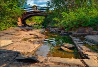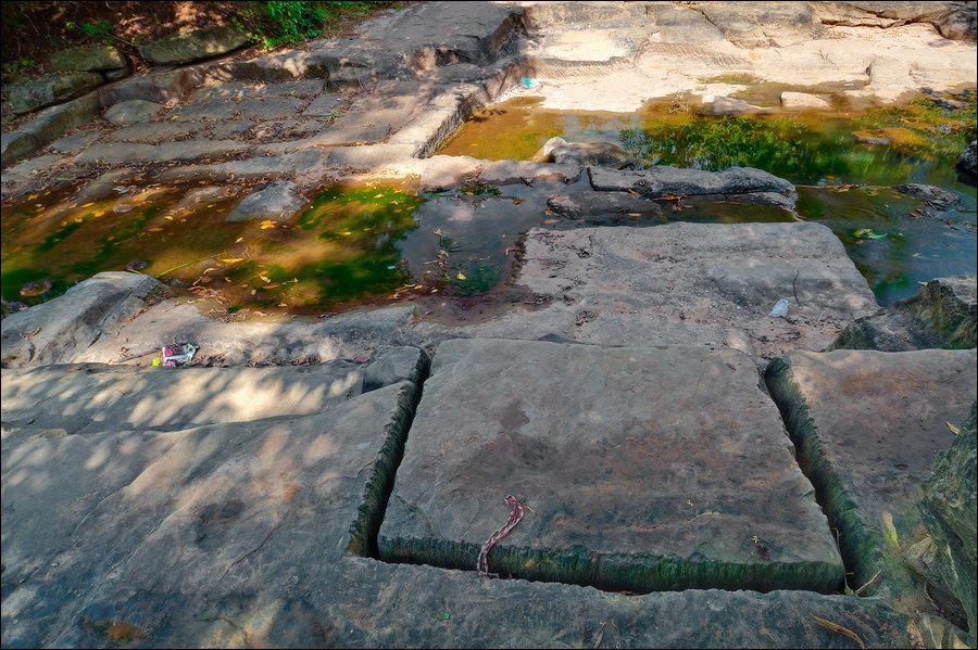Понимаю, почему добрейший мистер ВанКунн отправил вместо себя на внедорожнике своего тестя на минивэне. С такими вот дорогами любимый внедорожник может запросто превратиться в ржавеющее в чьём-то саду "украшение". Когда термометр, не моргнув десятичной точкой, показал +47С (!!!) за бортом, Чен снова выгнал меня на воздух, если эта обжигающая горло субстанция, таки да, была воздухом. Мы спустились по тропке к широкой мелкой реке, из русла которой древние кхмеры резали глыбы для нашего следующего "приза". Такие глыбы только слоняками и можно было ворочать: загнать сюда грузовик или подъёмный кран можно было только один раз, и то под откос. Как ни стремился в десять секунд русло и мостик, по которому нам сейчас придётся ехать, сфотографировать, всё одно солёной кровью, то есть, пОтом, истёк. Ломанулся обратно в кабину, захлопнул дверцу, выдохнул и думаю: ну их всех к Богине Ратри. Сейчас в "Жасмин" бы, пивасика холодного, кондишен на +22... Да я даже за обещанную реинкарнацию в самую высшую касту сейчас отсюда не вылезу!!! Что вы мне вдвоём в густые зеленя показываете? Или тропки шириной в две ступни я никогда в жизни не видел?!! Да я ни за что... Да я никогда...