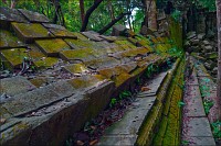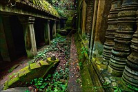 Спешите, Господа баранги, торопитесь видеть. Многие лианы и прочая растительно-корневая “ползучесть” в Beung Mealea уже носит следы острейшего топора. Не желает человек полностью проигрывать битву. Хочет сохранить видимость строения, а не просто разбушевавшейся Природы. С каждым следующим годом душащих мёртвый камень зеленей будет становиться всё меньше, а деревянных помостов - всё больше. Не приедете прямо сейчас - увидите ещё один спеленатый в "деревянный макинтош" Та Прохм. Не возьмусь судить, насколько "для барангов" была изложена душещипательная история о молодой тигрице, несколько лет назад забравшейся в храм и родившей в замшелом коридоре с лужами и жидкой грязью тигрёнка. Я бы, скорее, поверил в дюжий выводок полосатых хрюшек… Иду, придерживаясь левой рукой за стену (в правой, с целью приобретения необходимой смелости, зажат штатив) - копаться в рюкзаке в поисках фонаря, если проводник открытых ловчих ям не обещает - абсурд. Оббитые и скользкие, неровные ступени ведут наверх, к свету. Быстроходный "тукер", отобрав у меня штатив, успевает улизнуть вперёд. Без штатива и вправду удобнее карабкаться. У меня есть время притормозить, остановиться, оглянуться, ещё раз внимательно всмотреться в чёрное, мохнатое от мхов и цветных лишаёв каменное сердце самого обездоленного, но не позабытого храма Камбоджи.