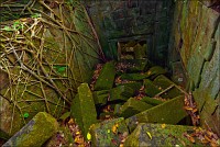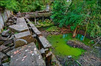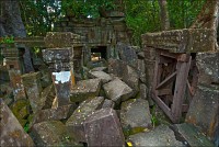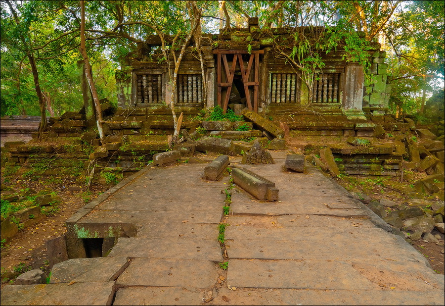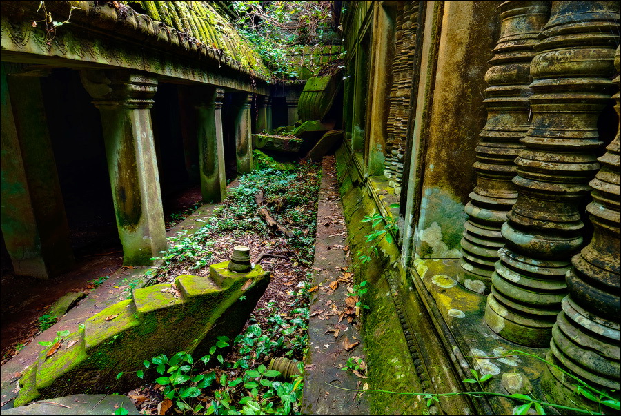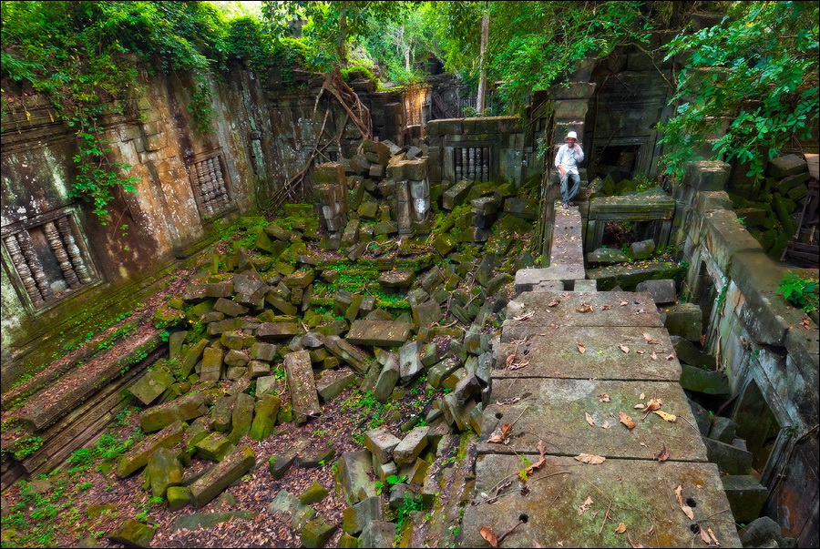 Фотографировать было тяжко: вокруг не было ни единой умеренно-горизонтальной поверхности. Штатив стоит, я валюсь на острых углах. Я стою - штатив в дыры меж камней проваливается, и клинит ноги насмерть. Свет тоже не подарок”: густая зелень, тени черным черны. Где просвет - там всё белое-пребелое, как стены в хорошей операционной. Первая же сотка метров по деревянным настилам для барангов вызвала тошноту: не люблю, когда меня, как волчару позорного, красными флажками обкладывают. И тут мой верный тук-тукер скромно так спрашивает, не "вуд лайк" ли я "тейк эназэ вэй". - Ещё как "вуд"! “Канэчна, прямо здэс хачу"!!! И, слово за слово, выясняется, что Чен был экскурсоводом и водил группы по Бенг Мели ещё до 2004-го года, когда эти пакостные мостки по кольцу комплекса проложили. И вот тут-то наступил реальный "Индиана Джонс". В полном присяде по подвалам (упитанным дядям, как я, там явно не место...); на четвереньках по длинным перекрытиям (высоко падать, да и просто по-человечески страшно...); по каким-то сомнительным щелям (выдохни, бобёр, выдохни...); по /закоулкам/завалам /условным ступенькам (carefull, it's wobble); по коридорам, перегороженным упавшими колоннами (mind your head...); по хлюпающим жижей сводчатым туннелям (whatch your steps)...