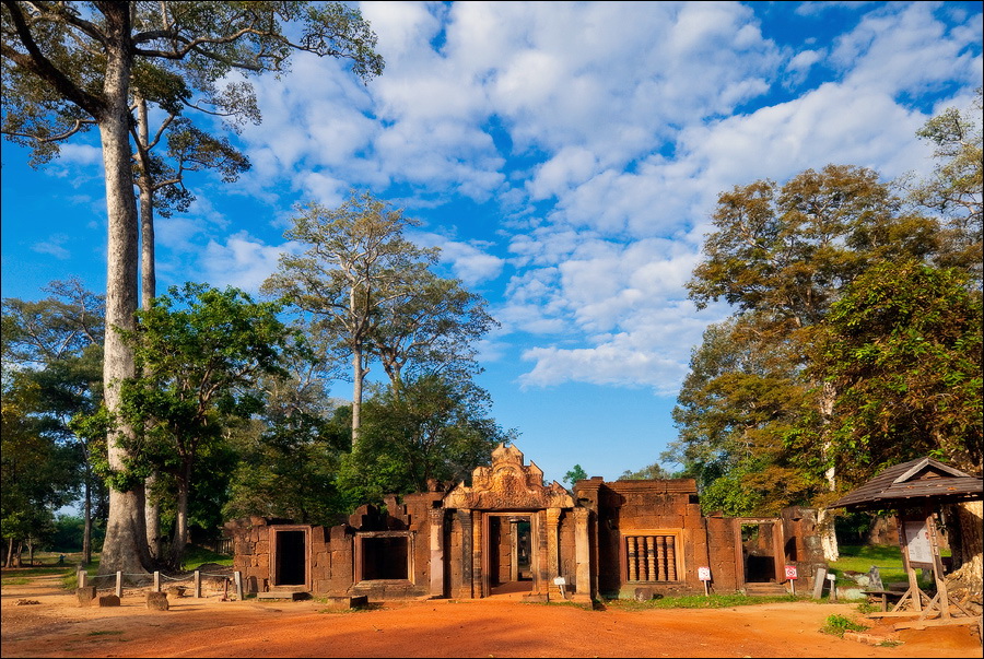 По приближению к Восточному Бараю сцепил я зубья крепенько и начальственным мановением левой длани повернул оглобельки шайтан-повозки к храму Бантей Самрай (Banteay Samre). Никакой особенной экзотики не ждал. Просто по дороге вычитал, что храм выполнен из такого же материала, как Banteay Srei, хорошо сохранился и не был полностью разграблен, как “некоторые”. Чтобы не скучалось в пути, купил у "уан доллов" вязку бананов за местные тугрики. О "тугриках" история отдельная. Когда их получаешь или отдаёшь, начинаешь судорожно со всех сторон оглядывать. Потому что только в одном-единственном месте - для ни разу неграмотных барангов - номинал купюры мелкими арабскими цифрами пропечатан. Остальное сплошь кракозяблы. Обошёл я попутный срас (srahs - бассейн), пропылил по 200-метровой “стартовой” дорожке из латерита, полез по высоким ступеням через башню-ворота в южной стене. Здесь меня подстерегло первое кидалово: никакой храм оказался не красный, а подчёркнуто чёрно-серо-зелёный, как будто кто-то регулятор цветности до отказа в минус крутанул. …Чтобы тут же спуститься и круто подняться по лестнице ко вторым по счёту воротам, пропускающим сквозь внутреннюю стену храма.