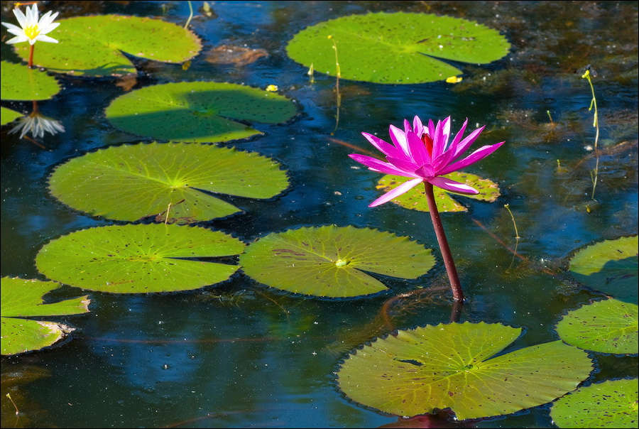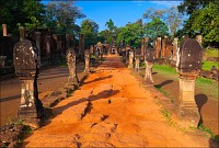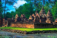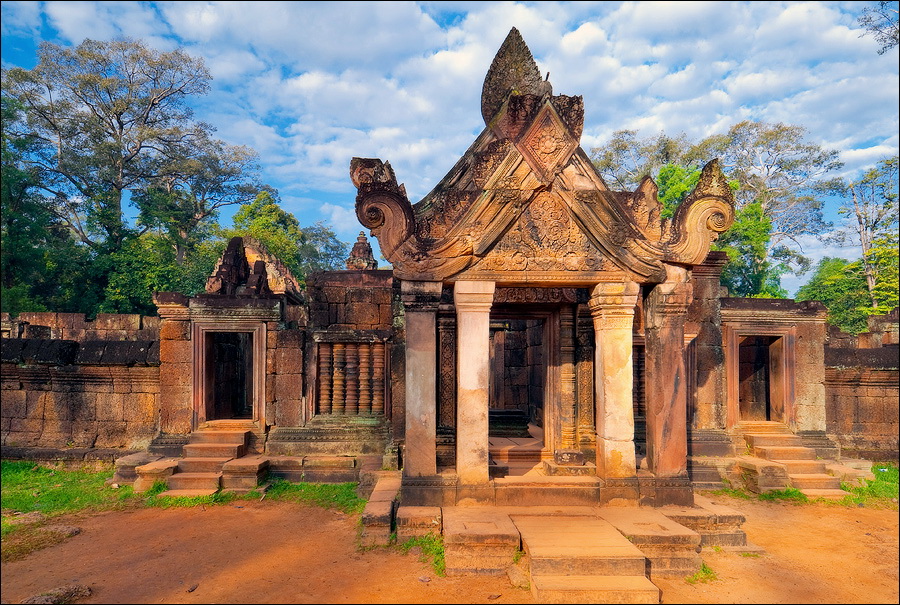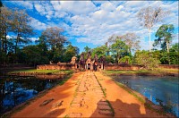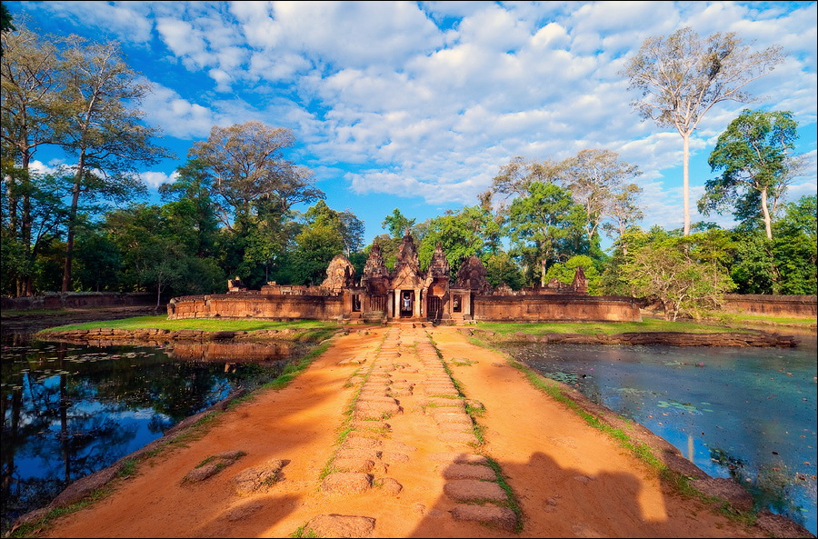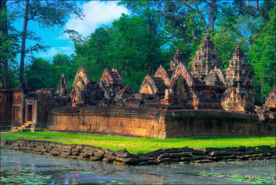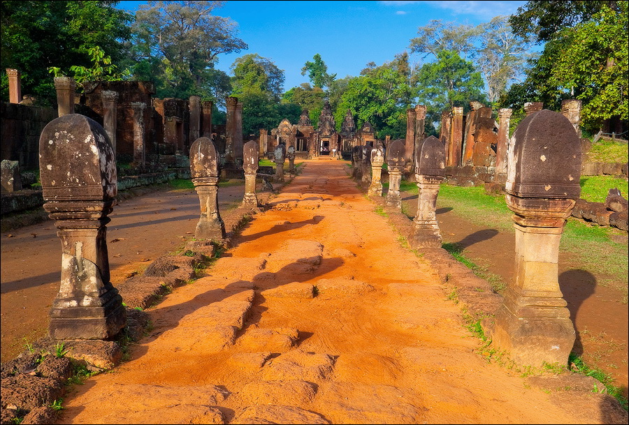 Размер паркинга, прилагающегося к храму Bantei Srei, внушал уважение. Обилие сопутствующих павильонов и технических построек - тем более. Последний раз настолько развесистые “комплексы услуг” я видел у супермаркетов в Замбии, куда весь платежеспособный город на выходные подтягивается. Ты смотри, даже туалет “условно-бесплатный” по ангкорскому образцу: есть дефлорированный за сегодня пропуск? Заходи, родной... Аллея от паркинга до храма была метров двести. И это было правильно: позволяло плавно отрешиться от сладостей цивилизации в пользу подступающих со всех сторон джунглей. Характерный жёлто-красно-розовый песчаник проявил себя сначала в мощных плитах аллеи и бесконечной череде резных колонн вдоль насыпи, ведущей к комплексу. Это уже само по себе было красиво. Потом пошли внешние стены (ещё красивее...) и цветущие розовыми лотосами пруды (конечно же, в их классическом варианте, что рекомендует брать храм в квадратные скобки двух глубоких рвов, заполненных водой). Среди Бантеев (напоминаю, это храмы типа цитадели, в отличие от не окружённых стенами Прасатов) такая фенечка - чтобы враги, откуда попало пешими не ломились - не редкость, а, скорее, общее правило.