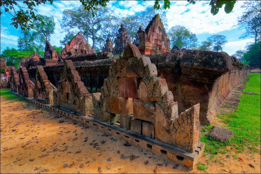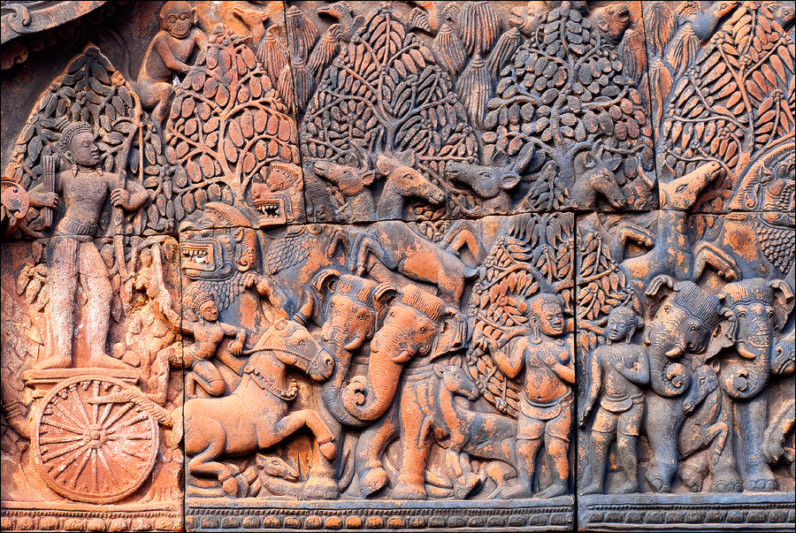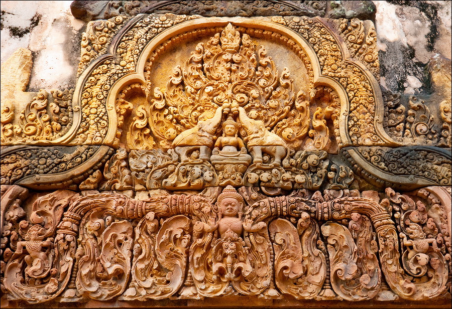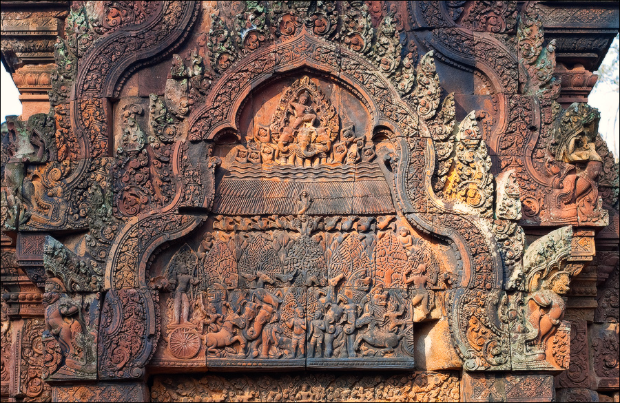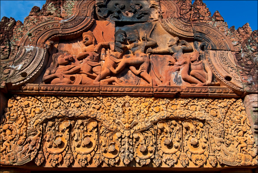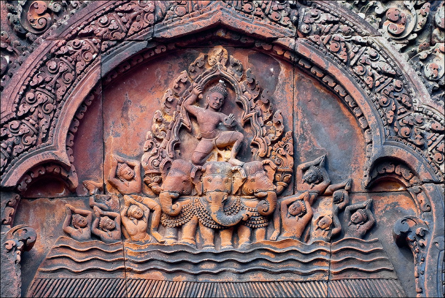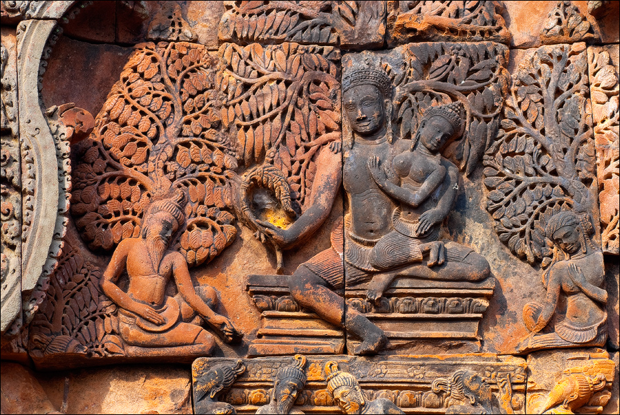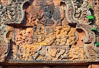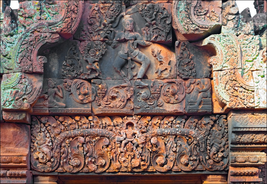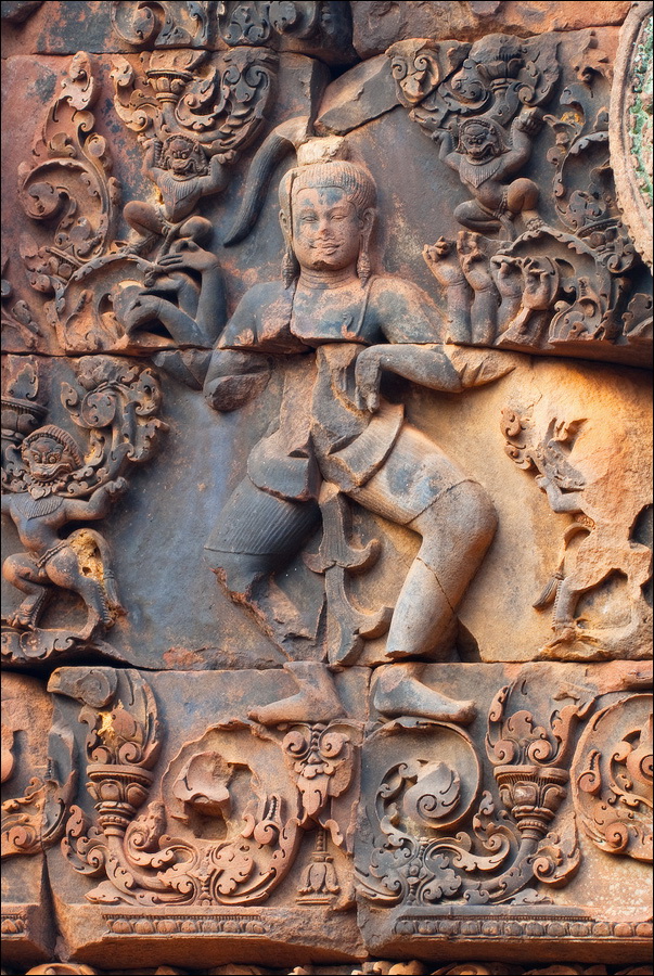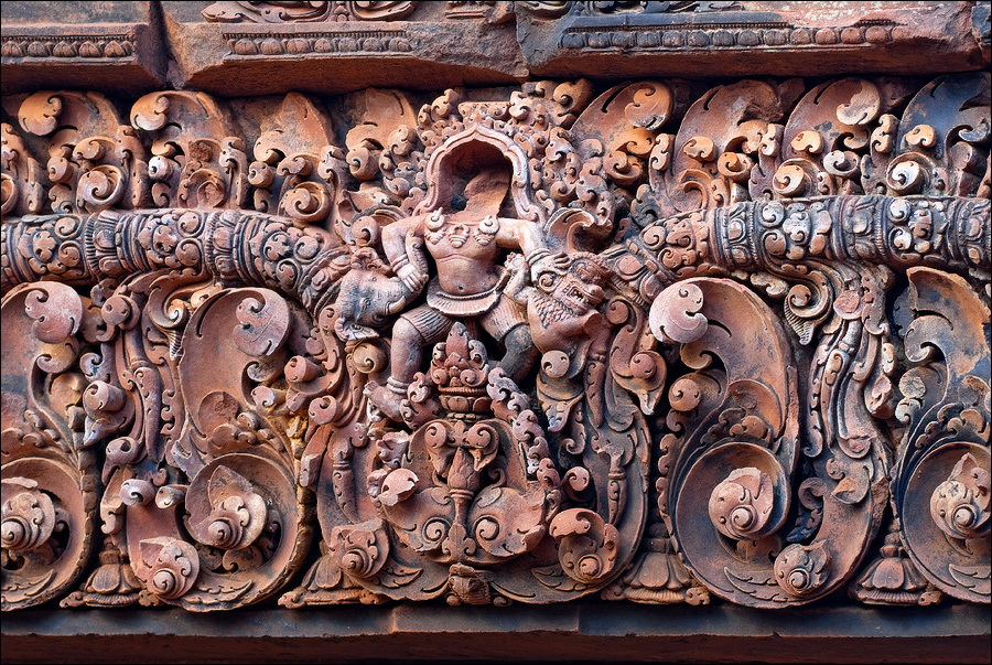 Веря и, одновременно, не веря, что ЭТО - красный песчаник, я зачарованно обошёл Bantei Srei раза четыре (Господи, какая же она всё-таки крохтулька...) Её можно было читать, как книгу, точнее, цветной комикс. Казалось, древние зодчие выплеснули на эти плиты лучшее, что могли себе навообразить, обкурившись правильных "хербов" что по каким-то им одним ведомым причинам получилось "сэкономить" на всех остальных храмах великой Кхмерской Империи. Я уже неоднократно убеждался, что наиболее пристально каменотёсами украшались фронтоны. В случае же Bantei Srei... Видится мне, где-то в процессе проектно-конструкторских работ произошла неувязочка и потерялся один-единственный нолик... в масштабе. Храм получился настолько маленьким, что резьба по камню, вскипев, как хороший кофе в медной джезве (цвет, ребятишки, какой божественный цвет!!!), вознеслась с фронтонов до самых крыш, а затем, шипя и пенясь, сползла вниз по стенам, чтобы, не уместившись на них, расплескаться кляксами-завитушками по каменным плитам окружающих храм дорожек. Во всяком случае, ругательных табличек "Не наступайте на резьбу!" до сегодняшнего дня я в камбоджийских храмах не встречал. Вот, что значит единожды доверить строительство не Как-Его-Там-В-Текущем-Столетьи-Варману с его пожизненно-безынициативными правительственными подрядчиками, а честному и свободному брамину Яжнаварахе! Парадокс: храм, посвящённый Шиве, одному из самых малевалентных божеств индуистского пантеона, называется Цитаделью Женщины и выглядит... именно женщиной!