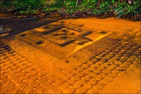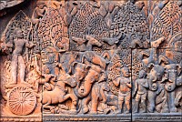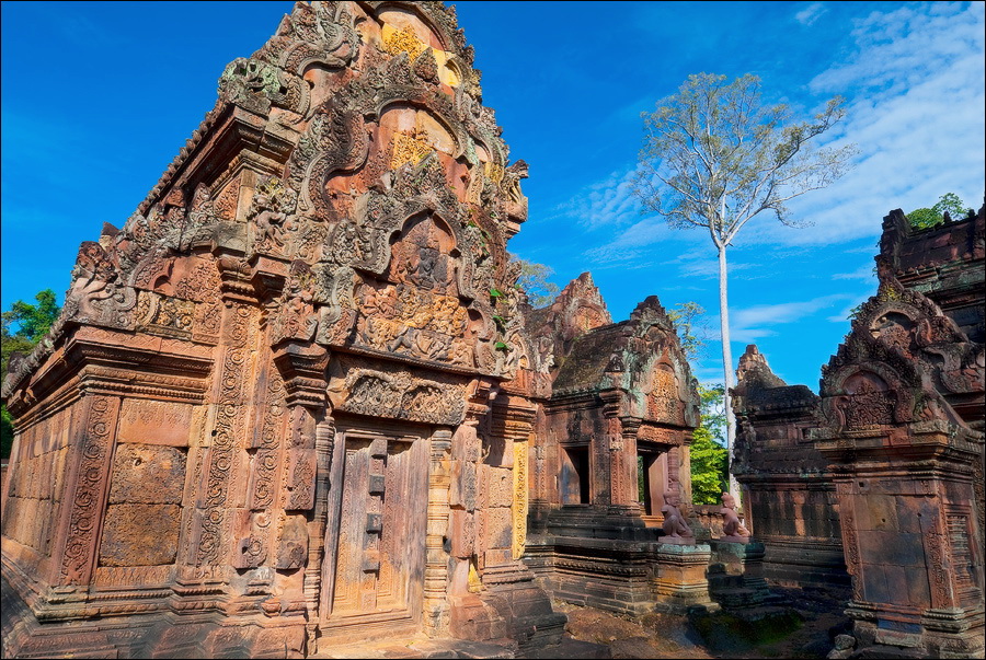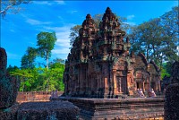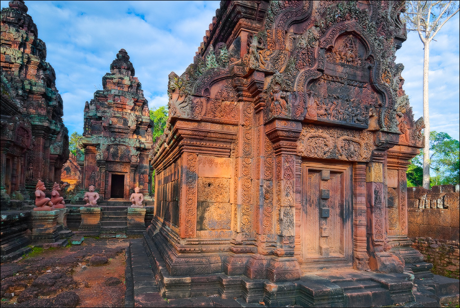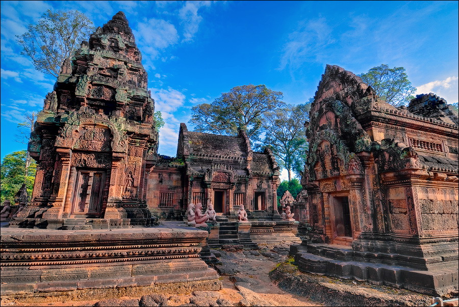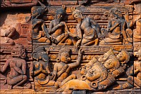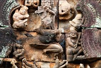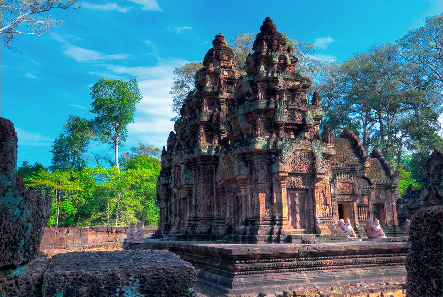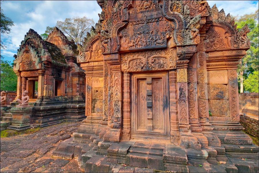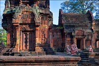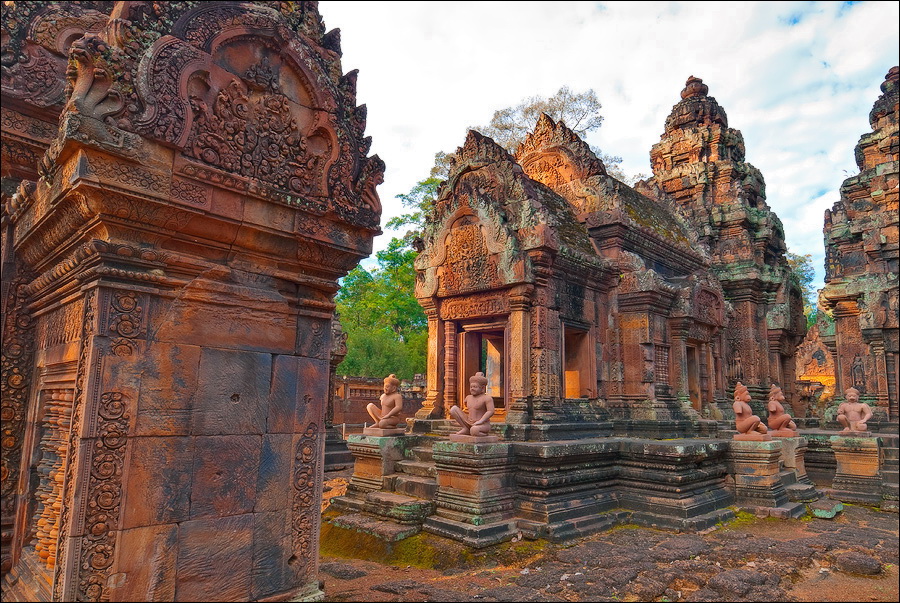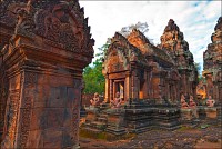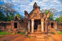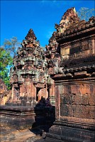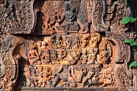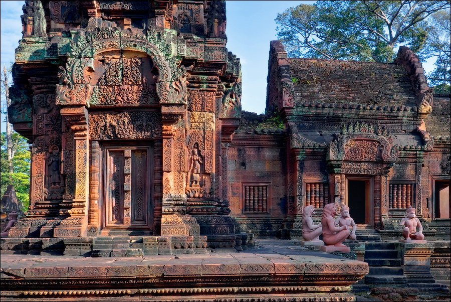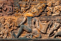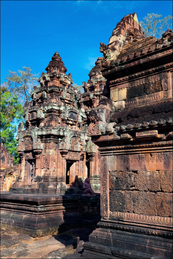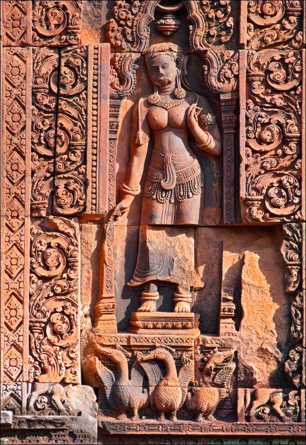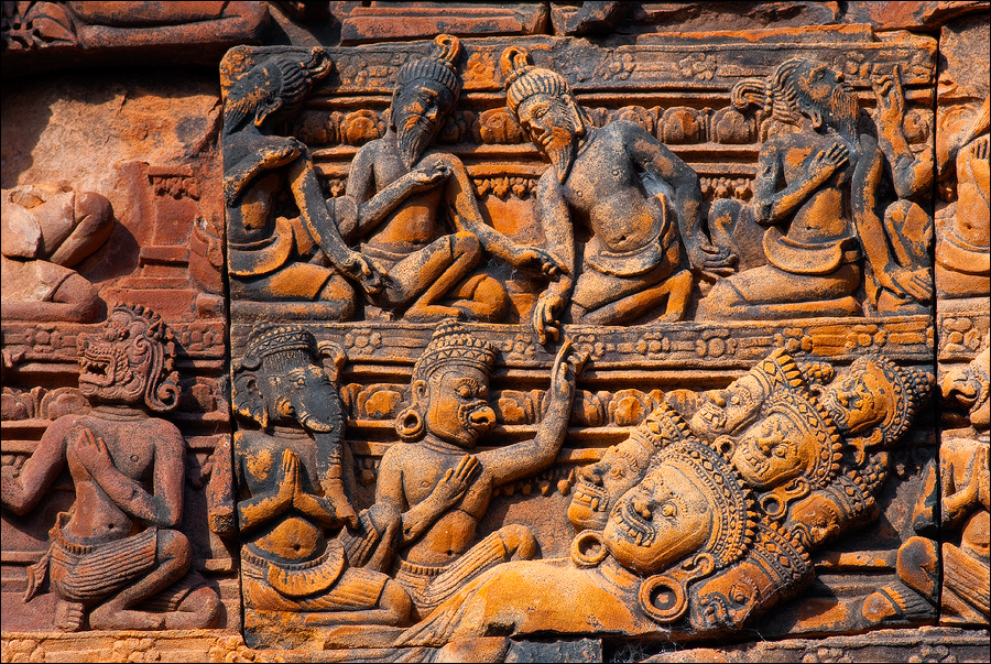 Веря и, одновременно, не веря, что ЭТО - красный песчаник, я зачарованно обошёл Bantei Srei раза четыре (Господи, какая же она всё-таки крохтулька...) Её можно было читать, как книгу, точнее, цветной комикс. Казалось, древние зодчие выплеснули на эти плиты лучшее, что могли себе навообразить, обкурившись правильных "хербов" что по каким-то им одним ведомым причинам получилось "сэкономить" на всех остальных храмах великой Кхмерской Империи. Я уже неоднократно убеждался, что наиболее пристально каменотёсами украшались фронтоны. В случае же Bantei Srei... Видится мне, где-то в процессе проектно-конструкторских работ произошла неувязочка и потерялся один-единственный нолик... в масштабе. Храм получился настолько маленьким, что резьба по камню, вскипев, как хороший кофе в медной джезве (цвет, ребятишки, какой божественный цвет!!!), вознеслась с фронтонов до самых крыш, а затем, шипя и пенясь, сползла вниз по стенам, чтобы, не уместившись на них, расплескаться кляксами-завитушками по каменным плитам окружающих храм дорожек. Во всяком случае, ругательных табличек "Не наступайте на резьбу!" до сегодняшнего дня я в камбоджийских храмах не встречал. Вот, что значит единожды доверить строительство не Как-Его-Там-В-Текущем-Столетьи-Варману с его пожизненно-безынициативными правительственными подрядчиками, а честному и свободному брамину Яжнаварахе! Парадокс: храм, посвящённый Шиве, одному из самых малевалентных божеств индуистского пантеона, называется Цитаделью Женщины и выглядит... именно женщиной!