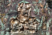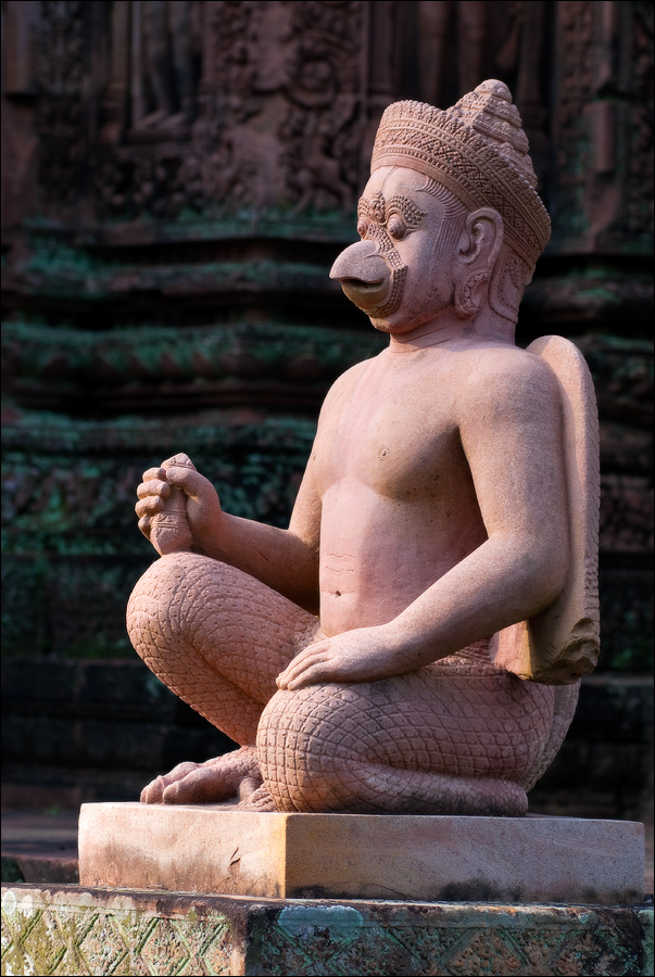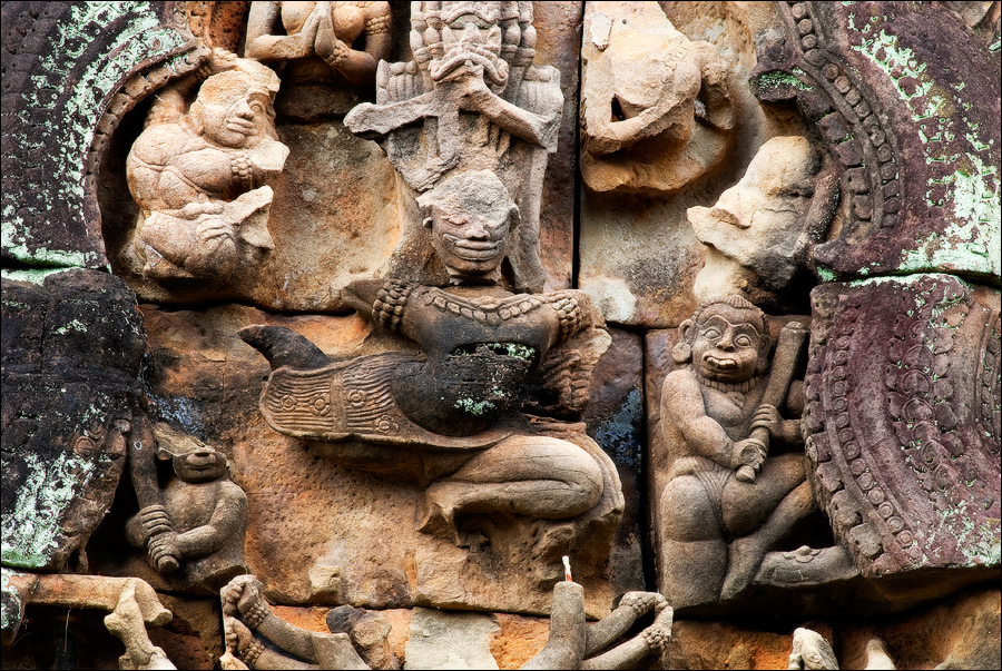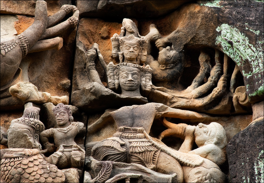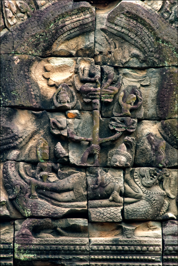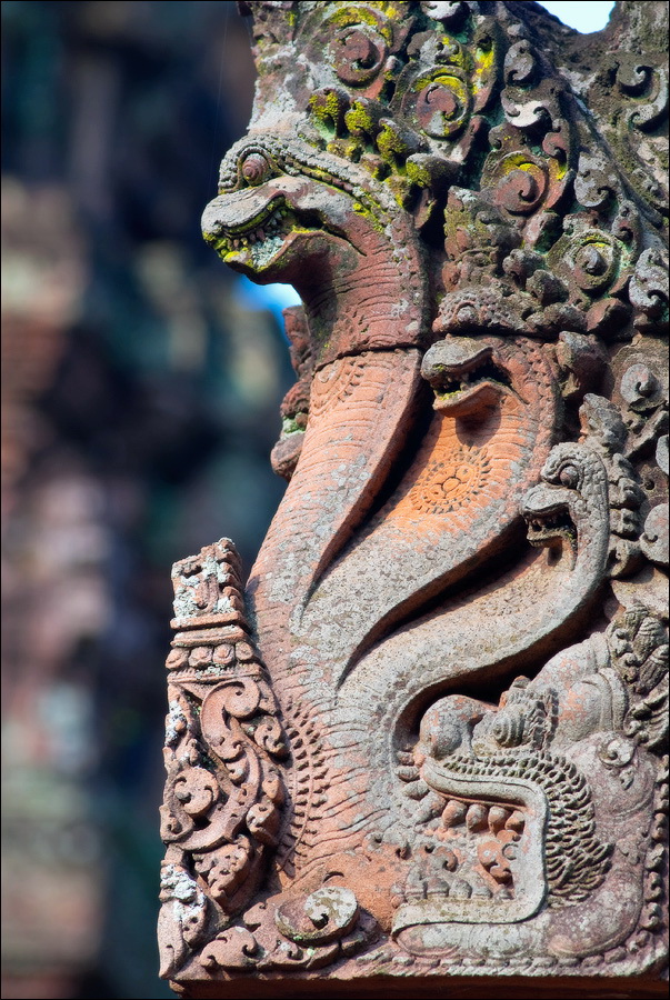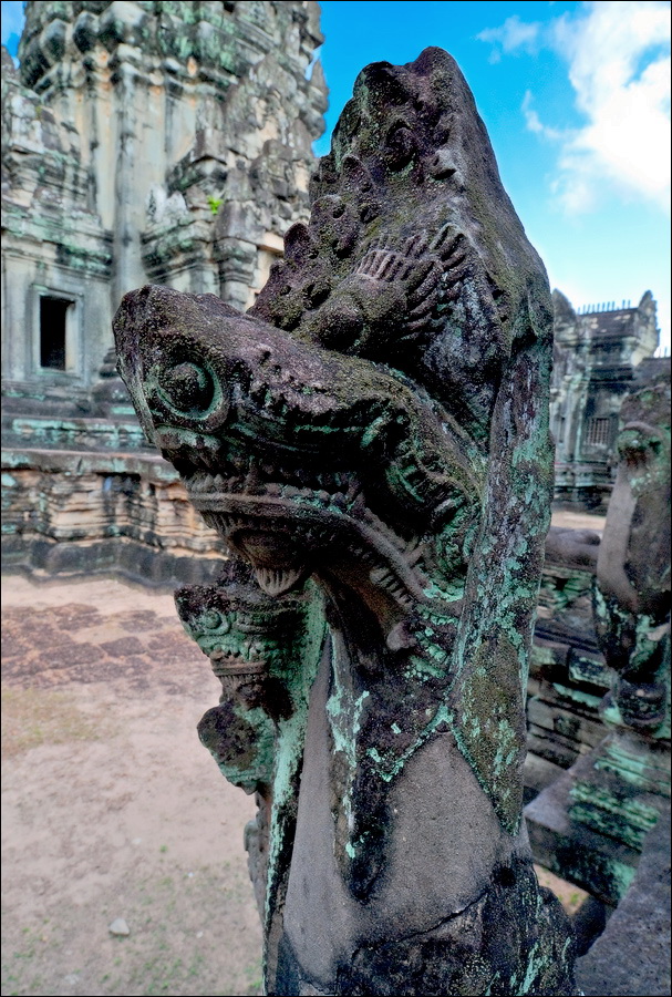 ...Юной женщиной в богатом пеньюаре, в предвкушении самого главного бала в своей жизни наносящей “боевую раскраску” перед зеркалом. И, чтоб непременно в пеньюаре тёмно-розовом. И чтобы рюшечек-оборочек-складочек на нём всяких видимо-невидимо, с шеи до пят. А выше - причёска такая, что просто закачаешься. Её медные кудри волнами завитков стекают по плечам и всё вниз, вниз, до самого-самого паркетного пола из красного дуба, покрытого вишнёво-кофейным персидским ковром ручной работы, по которому в свою очередь, расползаются цветочки, завиточки, да ещё и пушистые кисточки по краям... Боги и демоны, люди и звери, великие сражения и непреходящая любовь - всё смешано в противостоянии зубила с камнем. Я одних только Нагов, каждый божий уголок строения украшающих, считать утомился. А ведь у каждого из Нагов по семь голов, а у каждой головы по два длинных ряда острейших зубов... О, кстати, отвлекусь на Нагов. Насколько я понял пространные объяснения Чена в Beung Mealea, в Нагах вершится тайная великая битва сил буддизма с индуизмом. Влияние востока (то есть Японии и Китая...) и запада (Индии сотоварищей…) в Камбодже находились в состоянии некоторого условного географического равновесия. И это, конечно же, не могло не отразиться на Нагах.