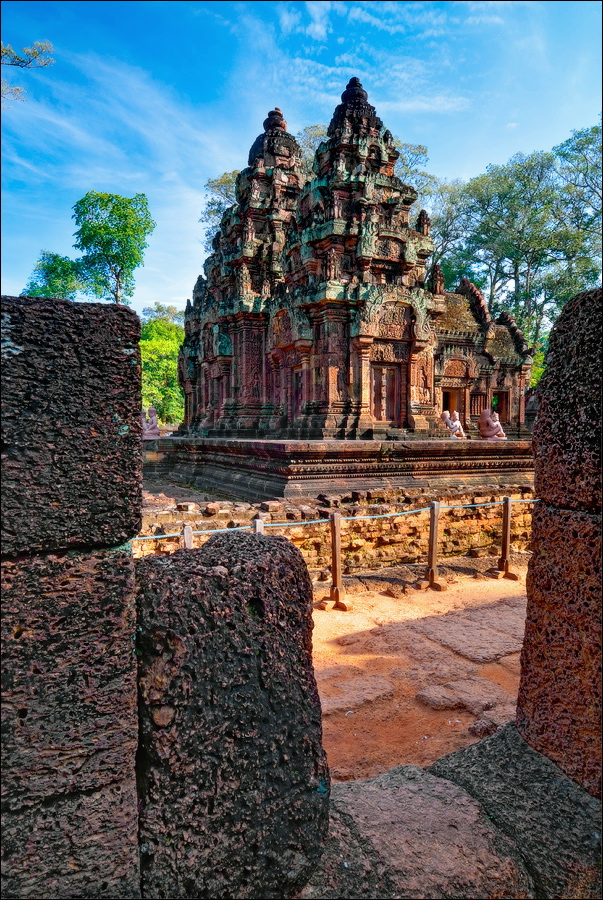 Пригнулся я слегонца, в арку последних ворот ныряя - не то, чтоб острая необходимость, но привычка делать скидку на рост кхмеров - распрямился - посмотрел - и - отпал. Присел на парапетик в самом тихом уголке, и давай дрожащими от вожделения руками 180-мм “дуру” к фотоаппарату прищёлкивать - “Это чтобы лучше тебя видеть, внученька”. Потому, что злые дядьки-охранники так переживают за резьбу драгоценную, что оградили всю Bantei Srei столбами с белыми верёвочками-канатами. За белые верёвочки - УБИВАТЬ. Могли и красно-пятнистыми их выполнить, чтобы “выфотошопливать” было легче. С другой стороны, я мудрых дядек полностью и окончательно поддерживаю, одобряю и понимаю. Ибо дай попущение такому беспринципному барангу, как я, вмиг полезет щупать, реально ли всё это камень, а не пластилин или “замаскированный” воск. С институтских лет и до сих самых пор на моём персональном Олимпе безоговорочно-божественных строений возвышался костёл Святой Анны из Вильнюса. Тот самый, которого Наполеон хотел “положить на ладошку и унести в Париж”. Я просто не представлял, не мог представить себе, что возможно создать что-нибудь ещё меньшее и более декоративное. Кхмеры Х-го века смогли...