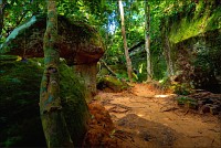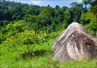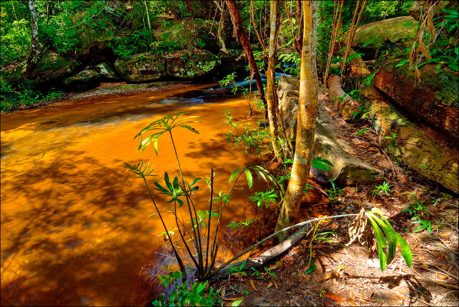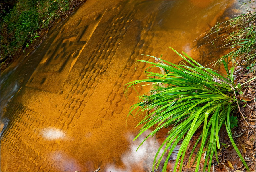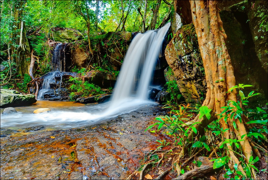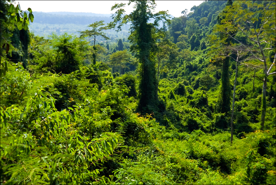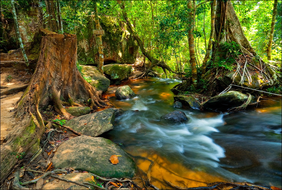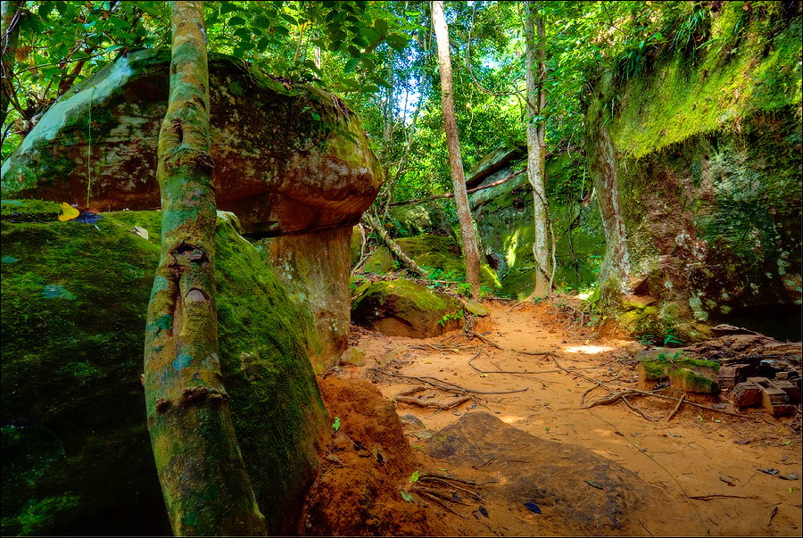Горбатый деревянный мостик. Услужливая табличка "до цели - 1500м". Натоптанная красно-бурая тропа. Медленное такое, тягучее и жаркое “в гору”. Слева густой, затянутый сетями лиан лес. И справа то же самое. Даже сверху ни просвета, ни солнышка. Топаю. Обтекаю бесценной влагой. Запыхиваюсь. Терплю. Начинаю злиться. Капаю с локтей, носа и подбородка. Чувствую, как печёт в глазах и на губах комариный репеллент. Нервничаю. Не понимаю "какого". Ненавижу лютой ненавистью всё живое вокруг. Если у Бантей Срей ещё был какой-то движняк воздуха, то здесь, под плотным, как вспененный полиуретан с закрытыми порами, пологом леса, даже паутинка не шевельнётся. Тропка ещё сильнее задирается в гору вдоль давно пересохшего ручья. “Путанка” камней, лиан, корней заставляет думать, куда удобнее ставить ногу. Местами, где нужно миновать вертикально-ребристый скальный пояс, к подъёму приходится прикладывать руки. Ещё приходится пропускать встречных: в туризме пропускать спускающихся не принято, но сейчас другой случай: вид у пенсионеров такой, что хочется верить, их катафалк погонят к подножью холма, избавив от последнего, горизонтального сегмента пути. Влажность стопроцентная, даже камни слезятся. Слева и где-то очень далеко внизу шумит неслабая река.