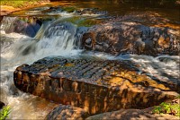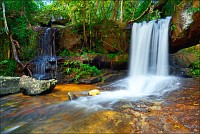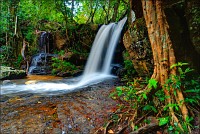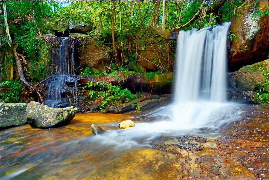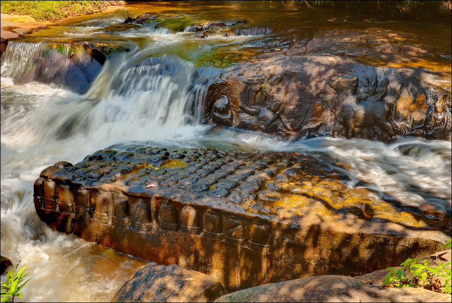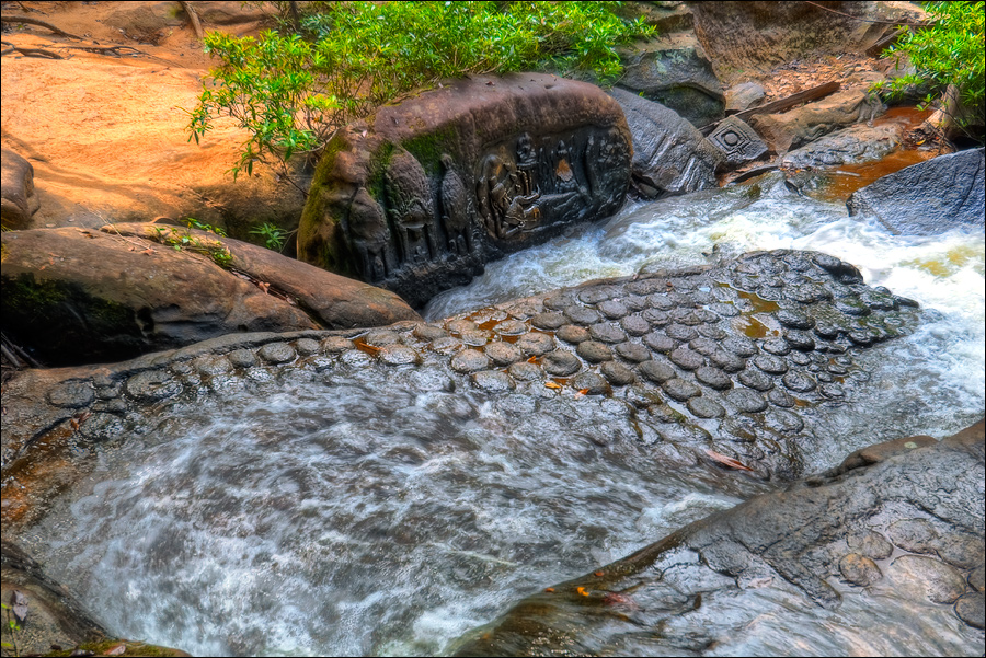 На промежуточном отдыхе, под кроной юного байона, мне приходит в голову креативно-непристойная мысль. Пункт 1. Лингамы в Камбо традиционно посвящают богу Шиве. Пункт 2. В огромном храме Banteay Chmarr, затерянном в джунглях северо-запада Камбоджи - добраться до него я, к сожалению, в этот короткий приезд никак не успеваю - присутствуют барельефы пятидесятируких (!!!) Авалокитешвар. Внимание, вопрос: почему бы добрым кхмерам было однажды не собраться с силами и изваять где-нибудь Бога Шиву с доброй полусотней величественных… лингамов??? Как феерично выглядел бы развесистый "букетик" - это что-то. Богохульник я. И пошляк. Но виновата в этом не система, а критические погодные условия. Ладно, возвращаемся к Kbal Spean. Самую "вусняшку" тропинка приберегает на закуску. Покрытый сочным мхом и лианами каменный хаос, крутая, скользкая деревянная лестница и - водопад. Невысокий, метров семь-восемь. Но достаточно мощный, как раз, чтобы народ, кто дошёл, счастливо за-"Вау"-кал. Вот что НЕ следует в полдень фотографировать, так это водопады. Контраст не просто бешеный, он пугающий. Решил склепать HDR, так его разнесло на 5 кадров со сдвигом 2ev. Выбора нет: второй раз сюда исключительно на паланкине под балдахином с мобильным кондиционером, запряжённым восемью дюжими шерпами. Воду рукой на прощание потрогал - теплее парного молока. Хочется нырнуть, чтобы ополоснутся - смерть как, но вдруг там, прямо под лингамами, шистосоматоз коварный себе гнездо свил? Параличи и хроническое поражение мозга - не совсем то, за чем мыслящие баранги приезжают в Камбоджу…
