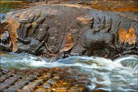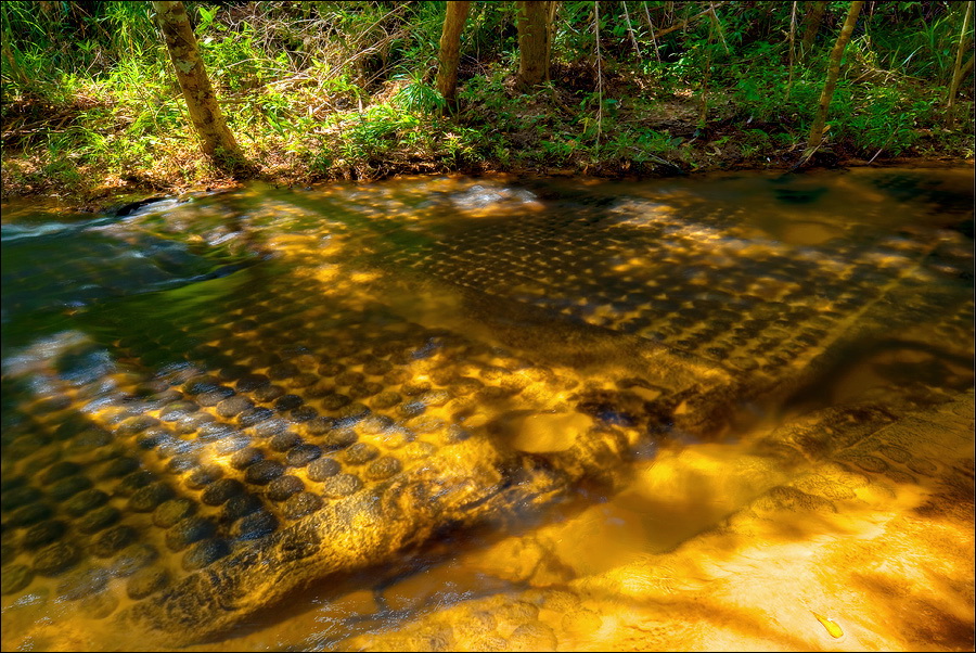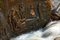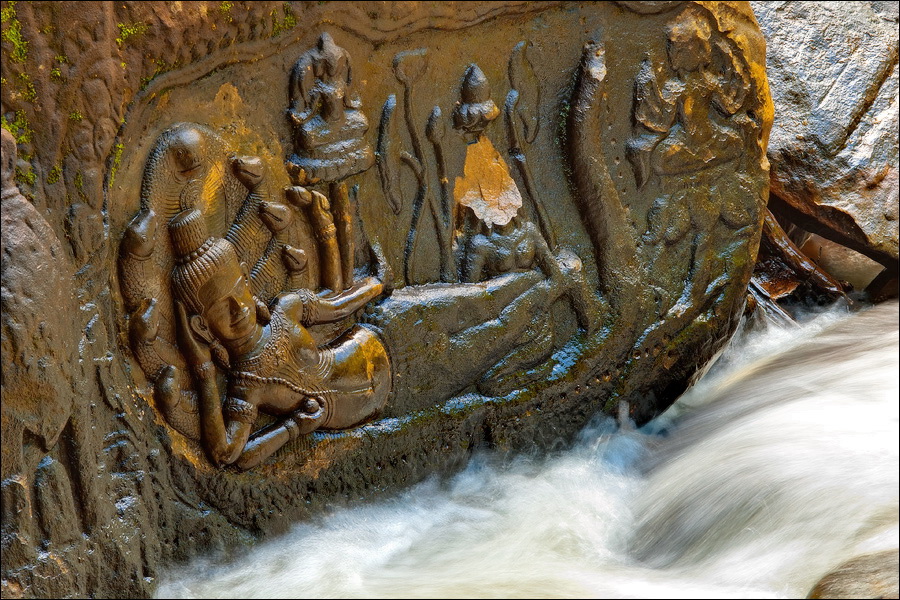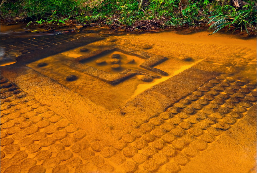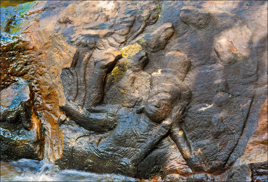 На отметке "до цели 800м" я понимаю, что треки по джунглям Камбоджи с рюкаком более 12кг не для меня. Вроде и путь почти выровнялся, и река сырой прохладой дохнула, но рубашка впитывать уже не в состоянии. Комары. Мухи. Бабочки. Птицы. Редкие баранги, всё больше китайские. Второй по счёту домик-навес для перекура мы с Ченом игнорируем, продолжаем идти. На отметке “400 метров” мне уже не нужно ни водопадов, ни Брахм с Шивами, ни лингамов маленькими четырёхзначными цифрами. А потом я и в самом деле замечаю двухголового Брахму в лотосе, почивающего на берегу реки головой по течению. Чёрного каменного Вишну. Делаю несколько шагов, дно и берега реки проступают лингамами: приземистыми такими, округлыми сверху “пеньками”... Восточные народы никогда не славились размерами мужского естества. Так что, какое в народе среднестатистическое “естество”, такие в реке и лингамы. Путь наш теперь вниз по течению. Речка ничего, славная. Шумные перекаты, тихие омуты, дно рыжее и скользкое от водорослей, совсем как у крымской Баги... Фотографировать есть чего, это как-то от тягот и лишений мира отвлекает. Второй прилёгший отдохнуть на каменном берегу Вишну - явный новодел, но очень искусный. А лингамов здесь действительно несметные тысячи.