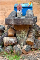 В который раз осматривая три башни-прасата, поразился долготерпению и вообще человеколюбию Бога Шивы (Ведь это именно Шива, устами кхмеров, любит являться людям в образе матёрого быка…) Каково одному из самых могущественных богов индуистского пантеона быть подседельным для пары человекоподобных существ?!! Пусть они даже замаскированные боги, - всё равно обидно! Будь я на месте этого конкретного Шивы (даже не самим Шивой, а просто быком, на которого взобрались возомнившие из себя нечто большее индивидуумы…) всенепременно вырастил бы остро отточенный гребень вдоль хребта! Потом мне снова пришлось включать в игру 180 миллиметров линз. Нужно было пересчитать, сколько реально рук у десятиликого божества, от которого дикие львы и слоны шарахались, как мышата от лисы. Насчитал восемнадцать. С одной стороны правильно: одним-единственным мозгом столькими руками одновременно не помахать. Для этого нужно было родиться и вырасти сороконожкой. А с другой стороны - ликов у божества три ряда по вертикали - четыре, четыре, и еще две. Сколько времени будут бежать импульсы по нервной системе от головы “третьего этажа” к причитающимся ей конечностям? Это же уже ленивец заторможенный и водорослями по пузу обросший получится, а никакой не бог… Хотя я слишком антропоморфен в своих рассуждениях. Может, у того божества вместо нервных связей оптоволоконные магистрали к сервоприводам наиболее удалённых рук проложены. Так. Пора с Banteay Srei завязывать. Cкоро мозги от жары румяной корочкой покроются…