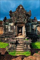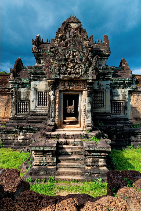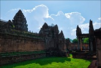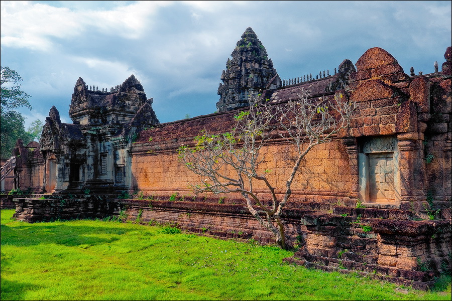 Как печально, что огромный пруд, некогда весело плескавшийся меж чёрных от печатей времени стен, давно и навсегда пересох. Ещё печальней, что полностью уничтожена так украшающая Ta Prohm высокоствольная и лианная братия: всего несколько лет назад Banteay Samre была погружена в чисто ради приличия прореженные джунгли. Ладно, проехали и это. Зато трава внутреннего двора легко могла поспорить цветом с "самыми рисовыми" полями Камбоджи, а храмовый комплекс казался излишне мрачным, суровым и тяжеловесным. Дело тут, скорее всего, было именно в цвете: я совсем неспроста упомянул о "чёрных от времени" стенах. Чёрным у Бантей Самрай оказалось почти всё: ступени, балюстрады Нагов, стены, резные колонны гопур, чудом избежавшая участи быть разграбленной резьба на высоких фронтонах, готические крыши даже в самый разгар дня погруженных в сумрак галерей... Не исключено, что когда-то давным-давно это была самая, что ни на есть, мощная Banteay - Цитадель - в Камбодже. Во всяком случае, изнутри она создавала ощущение неприступной крепости.
