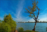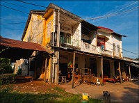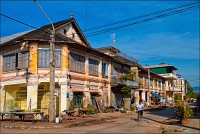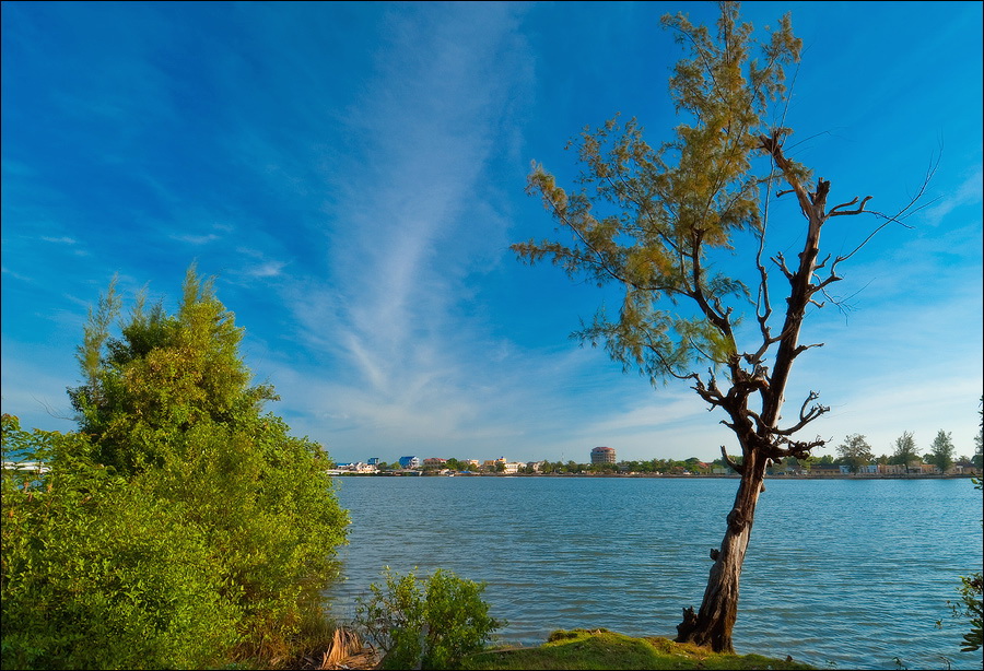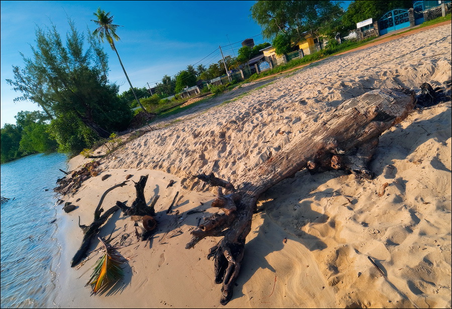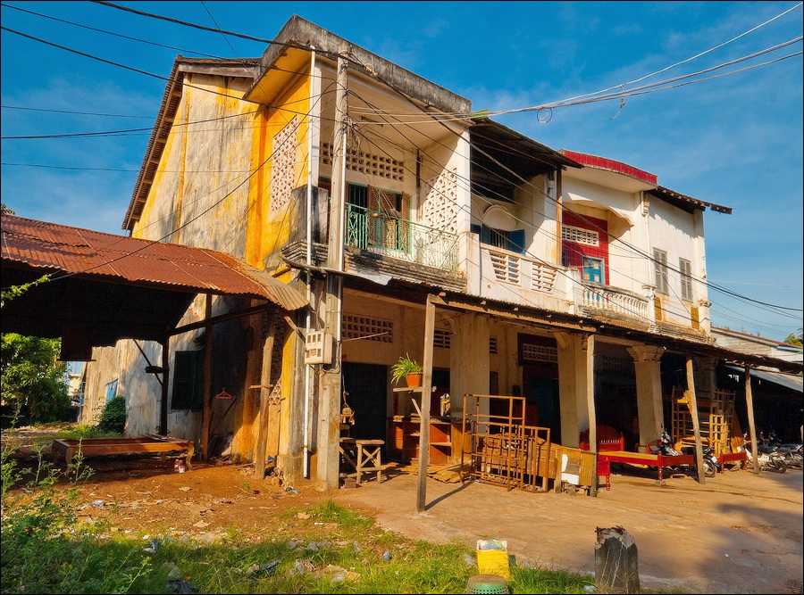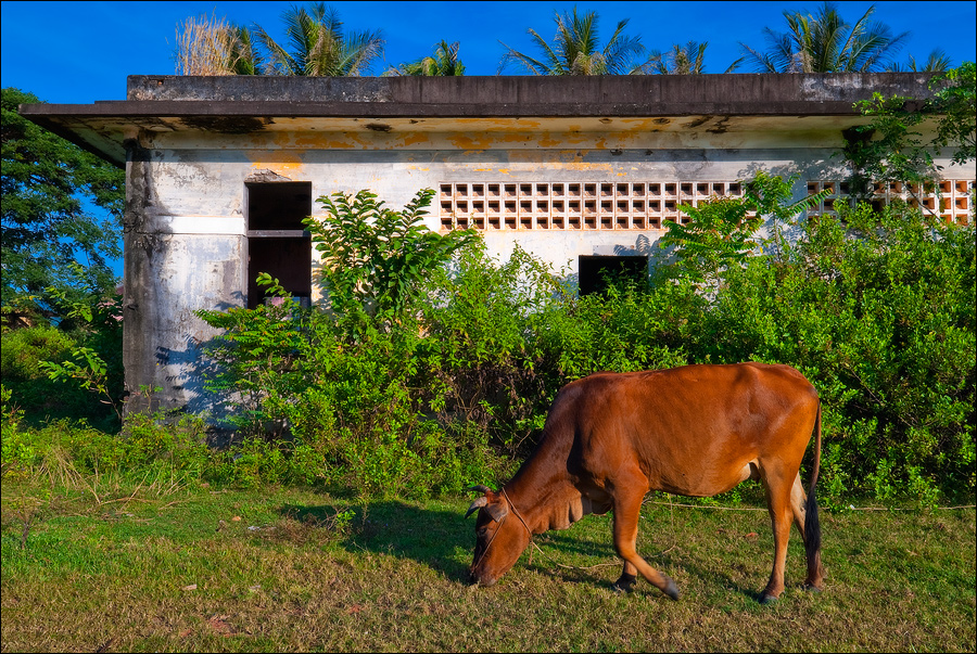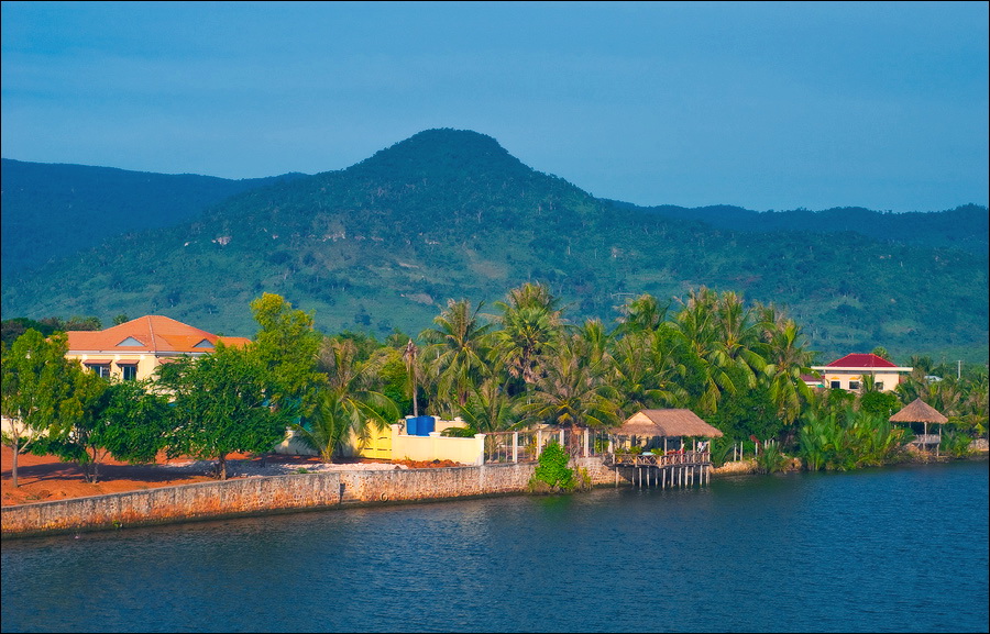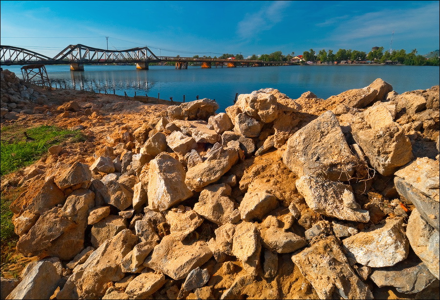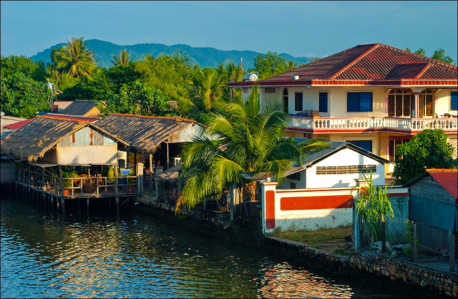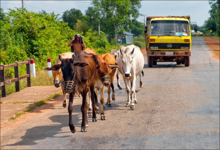 Погрязший жёлтой стеной в мусоре главный отель города (никак не "Шератон"…), снова захолустье. Небогатое, примитивное, но какое-то ухоженное по мере сил и восприятия красоты захолустье. Древние бабушки тротуары у особнячков метут, девчушки полы кафешек (пока ещё не открытых...) водичкой сбрызгивают, окна протирают. Доброе тебе утро, КампОт! Сам не заметил, как до моста добрёл. Большой мост, с пешеходными дорожками. Раз они есть - значит надо... Перешёл. Глухомань. Заброшенные дома, пасущиеся коровы, необитаемые пляжи, мебельные мастерские, заросли высоченной осоки и дровяные склады. Неинтересно. Вдали - ещё один мост. Пошёл. Ага. Мост - есть. Но пешеходность его сомнительна: транспорт и грузовой, и легковой, и двухколёсный от края до края шныряет. Стремновато, но не обратно же, в конце концов, возвращаться… Всего дважды от грузовиков за железные колонны моста прятался. А так ничего, перешёл.