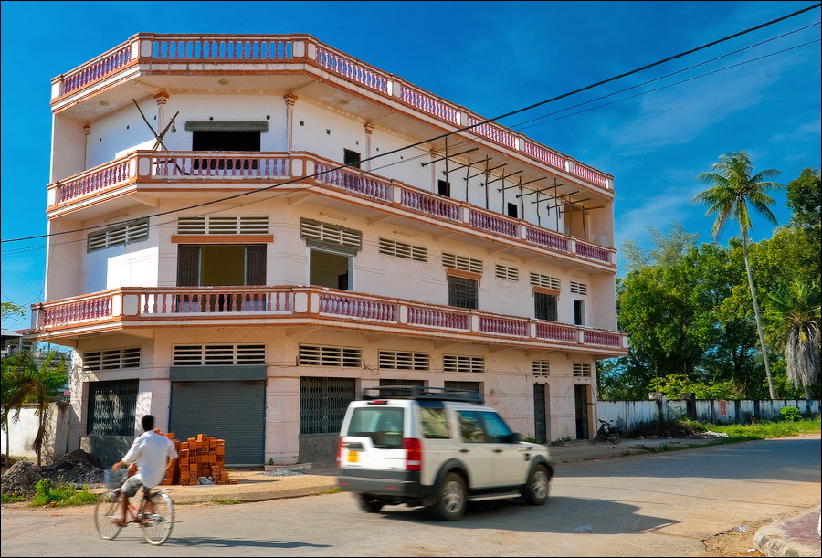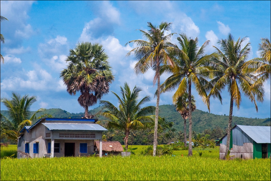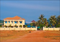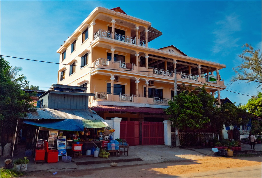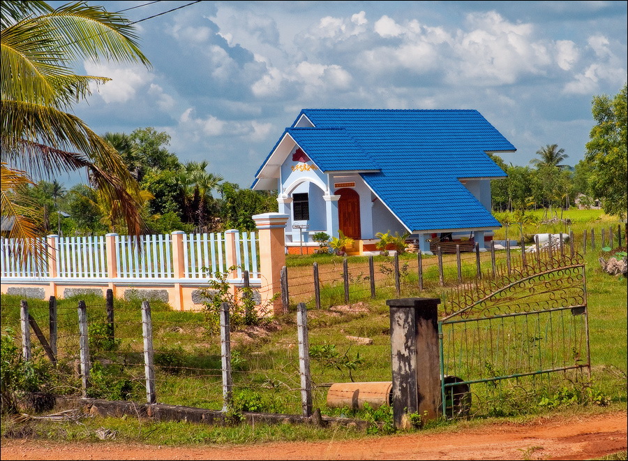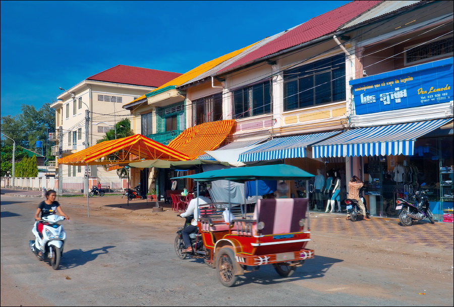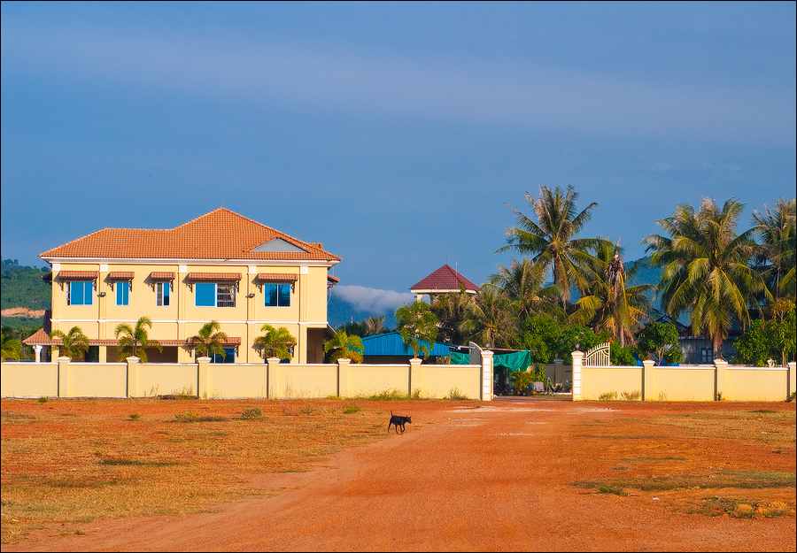 Всё-таки французы знали толк в капитальном строительстве. Что ни подворье проезжаем - обязательно чтобы пальмы его какой-нибудь красивой фигурой окружали. Пусть усадьбчонка всего в два этажа, да по одной крохотной комнатушке на этаж, забота о внешней привлекательности “среды обитания” налицо. Как славно, наверное, здесь жилось в самом начале века… Упряжки быков, чинной и благородной поступью игнорирующих яростное бибиканье и вопли водителей колёсного транспорта всех типоразмеров - от двухколёсных велосипедов до гружёных дроблёным гравием грузовиков - придают камбоджийскому трафику особый колорит. Ещё колоритнее смотрятся угрюмо-чёрные параболические тарелки метров двух в диаметре, распиханные по углам дворов как приличных вилл, так и самых убитых сараюшек. Тарелок много, пугающе много. Неужели в Кампоте, вместо экзотических фруктов, взращивают в промышленных масштабах "Агентов-007"?