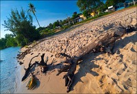 Да, ещё одну "фишку" малой механизации по дороге обратно узрел: бензо-давилку для сахарного тростника. Выдавливают прямо в бокал и тут же пьют. Интересно, эту модную шнягу для производства берёзового сока использовать возможно? Кончаясь от жажды, купил у неумытого придорожного купчины чисто китайского вида две лимонных фанты, колу для рулевого (почему все тук-тукеры любят именно "Колу"?) и два литра воды. Всё вместе - два доллара. Впредь буду на подобных "помойках" отовариваться… Что-то новенькое. Дикое количество полиции. Внимательно всех осматривают, машины останавливают. Во, вспомнил, кинули меня кхмеры! Пока ехал в Кампот, видел в ларьках россыпи дурианов. Говорят, зело вонюч сей фрукт для европеоидной расы, хоть и вкусен. Я бы определённо попробовал, но нет его в Кампоте. Только ананасы, джекфруты, драгонфруты, бананы, апельсины, да папайи с авокадо.